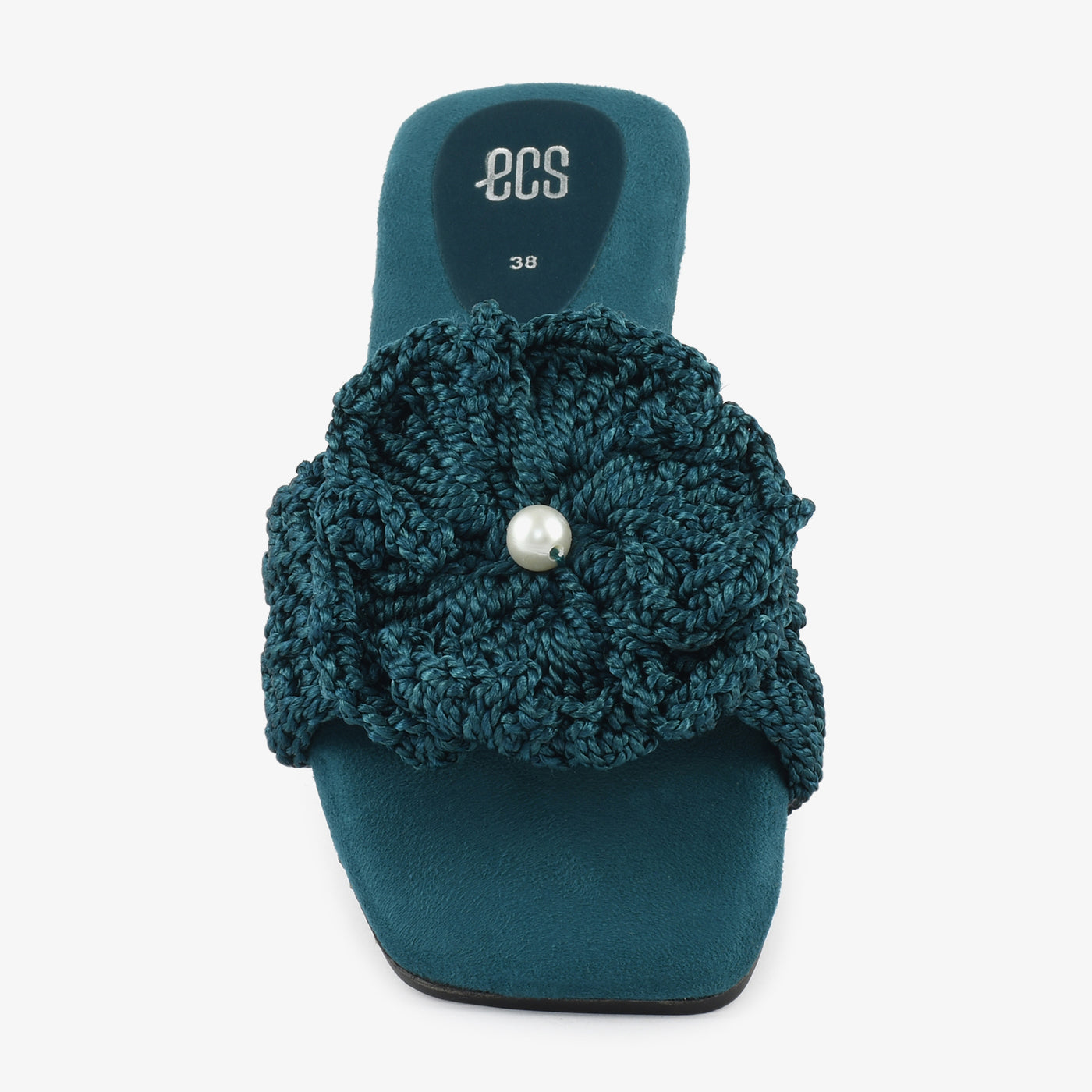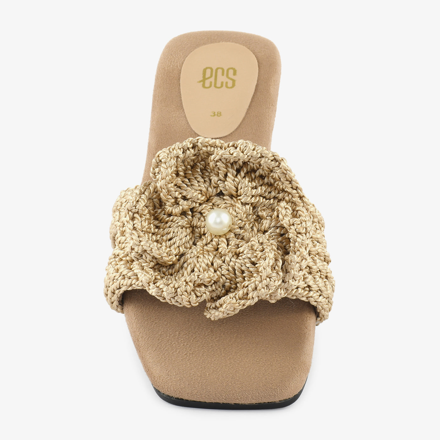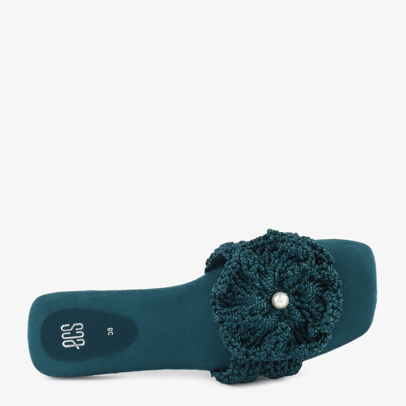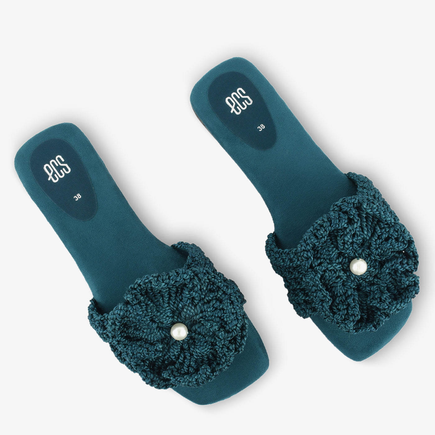 The "Petal Bloom Slide" brings artistry to your steps with a crochet floral accent detailed with a pearl center. Its slip-on design ensures both comfort and chic appeal, perfect for relaxed yet polished looks.