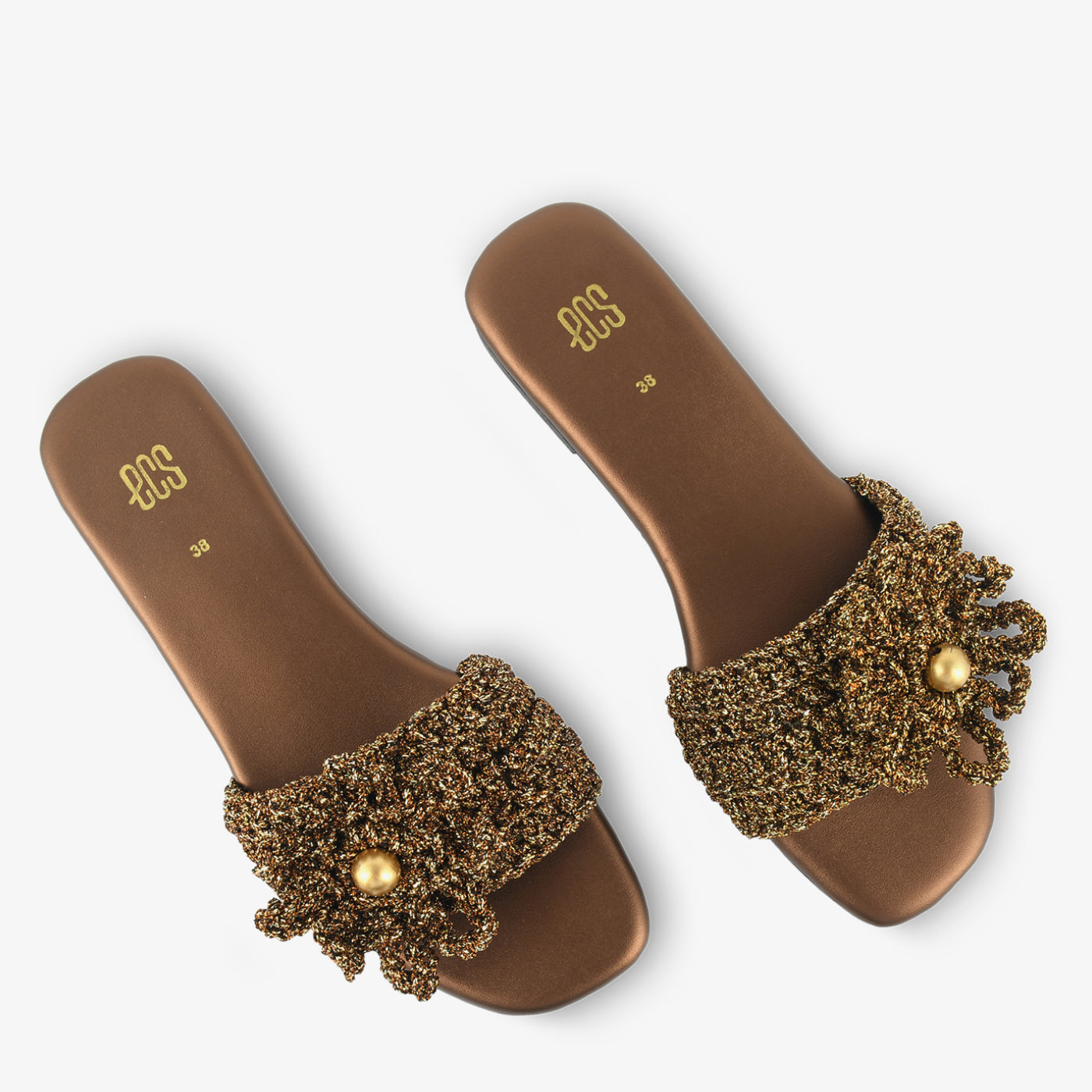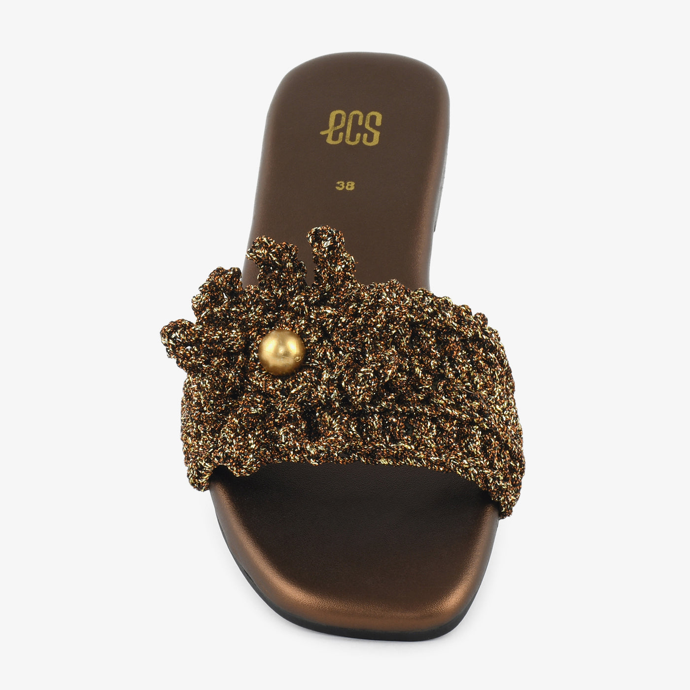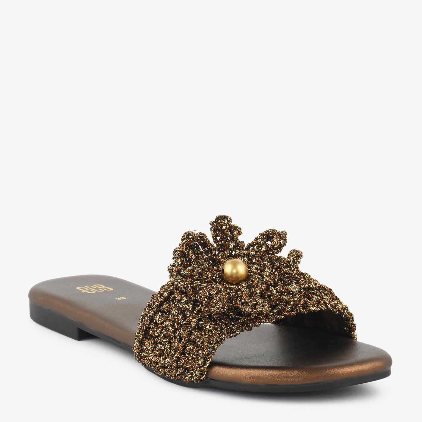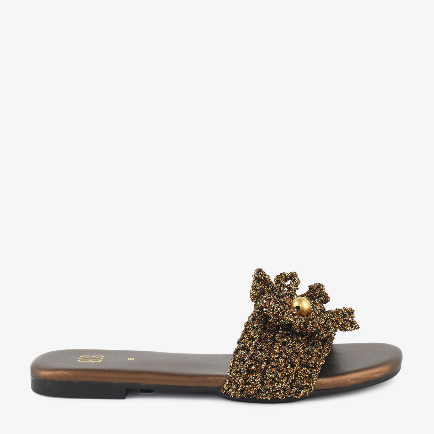 The "Bronze Bloom" slide is a statement in shimmer and texture. Featuring a bronze-toned knitted strap adorned with a bold metallic bead, it blends casual ease with festive elegance.