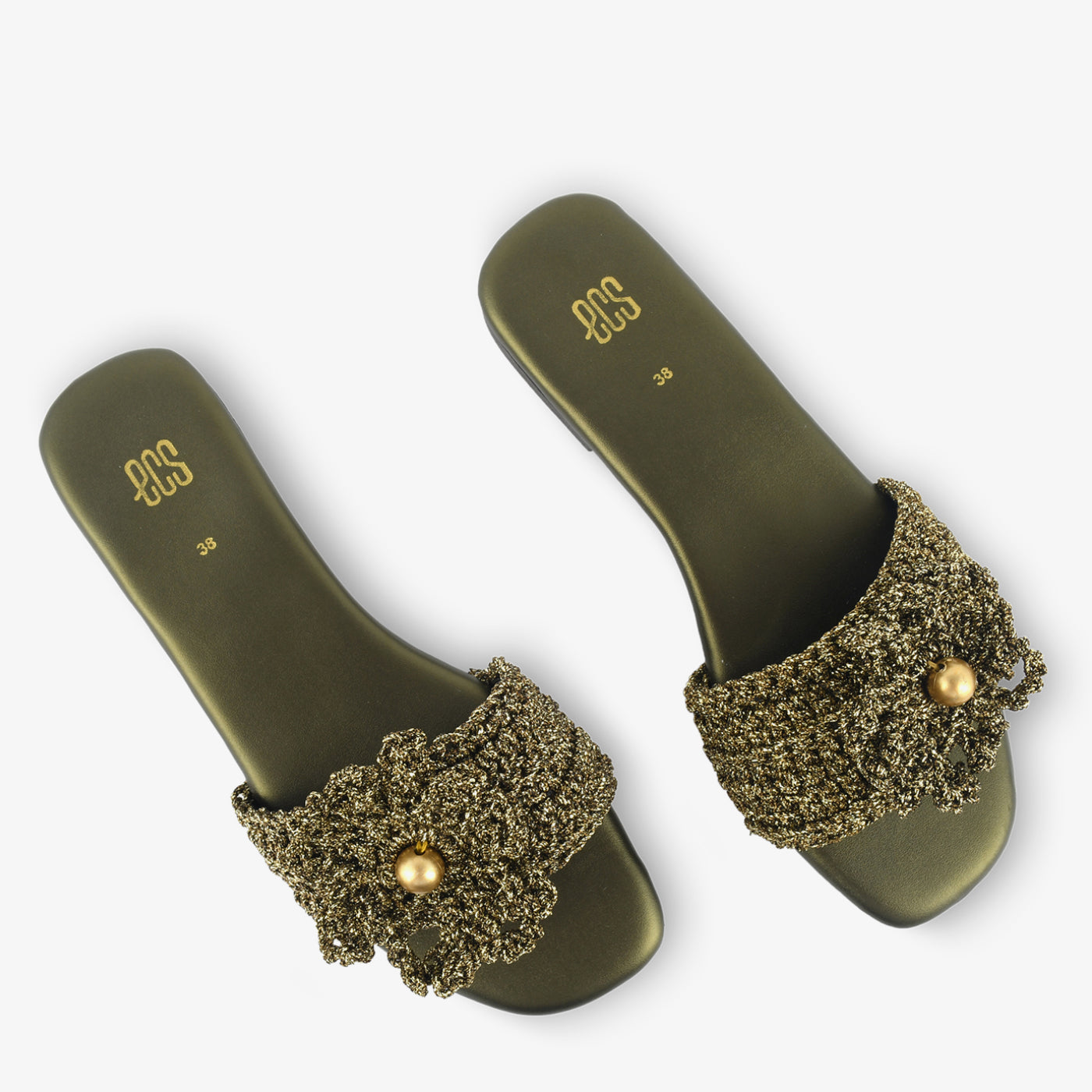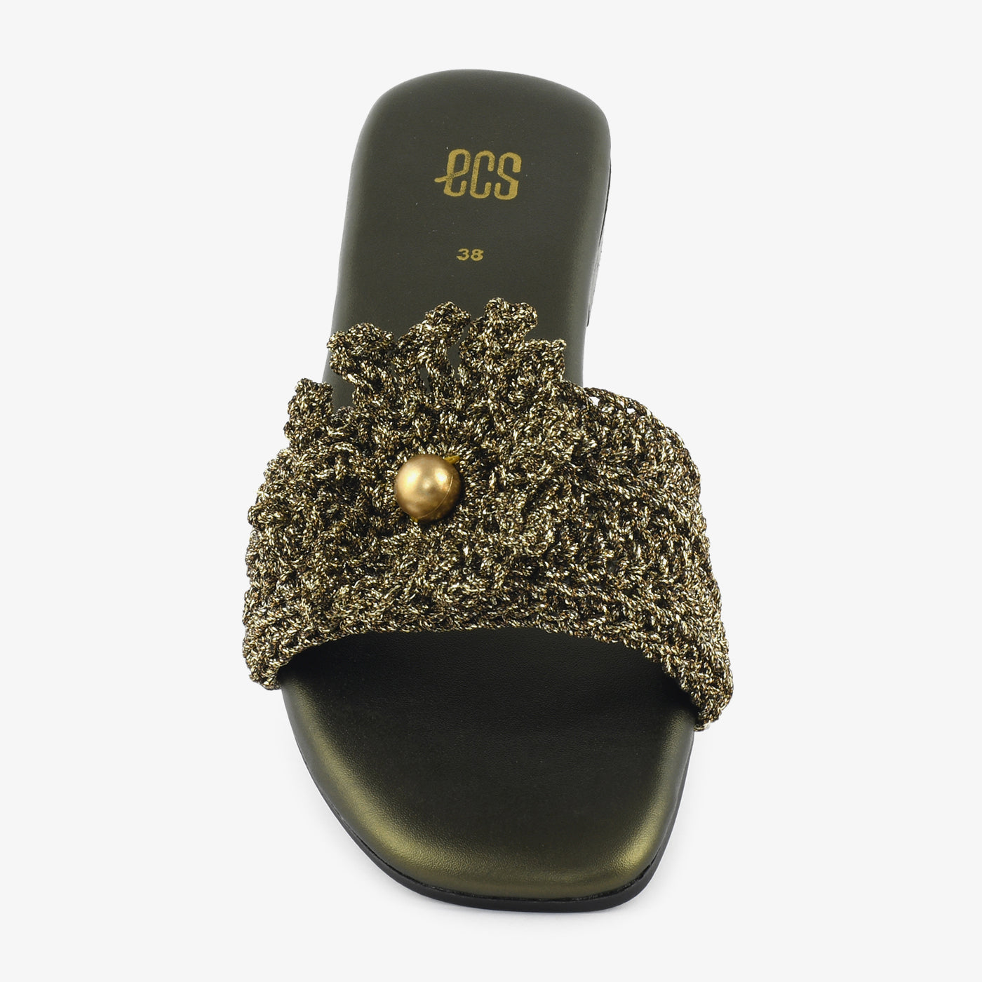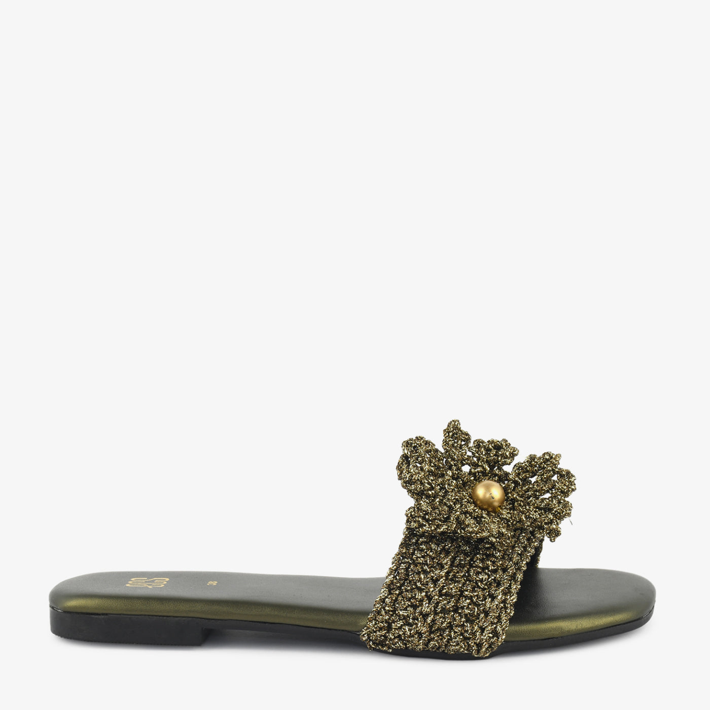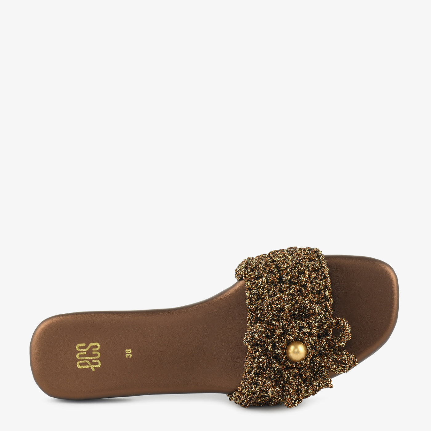 The "Bronze Bloom" slide is a statement in shimmer and texture. Featuring a bronze-toned knitted strap adorned with a bold metallic bead, it blends casual ease with festive elegance.