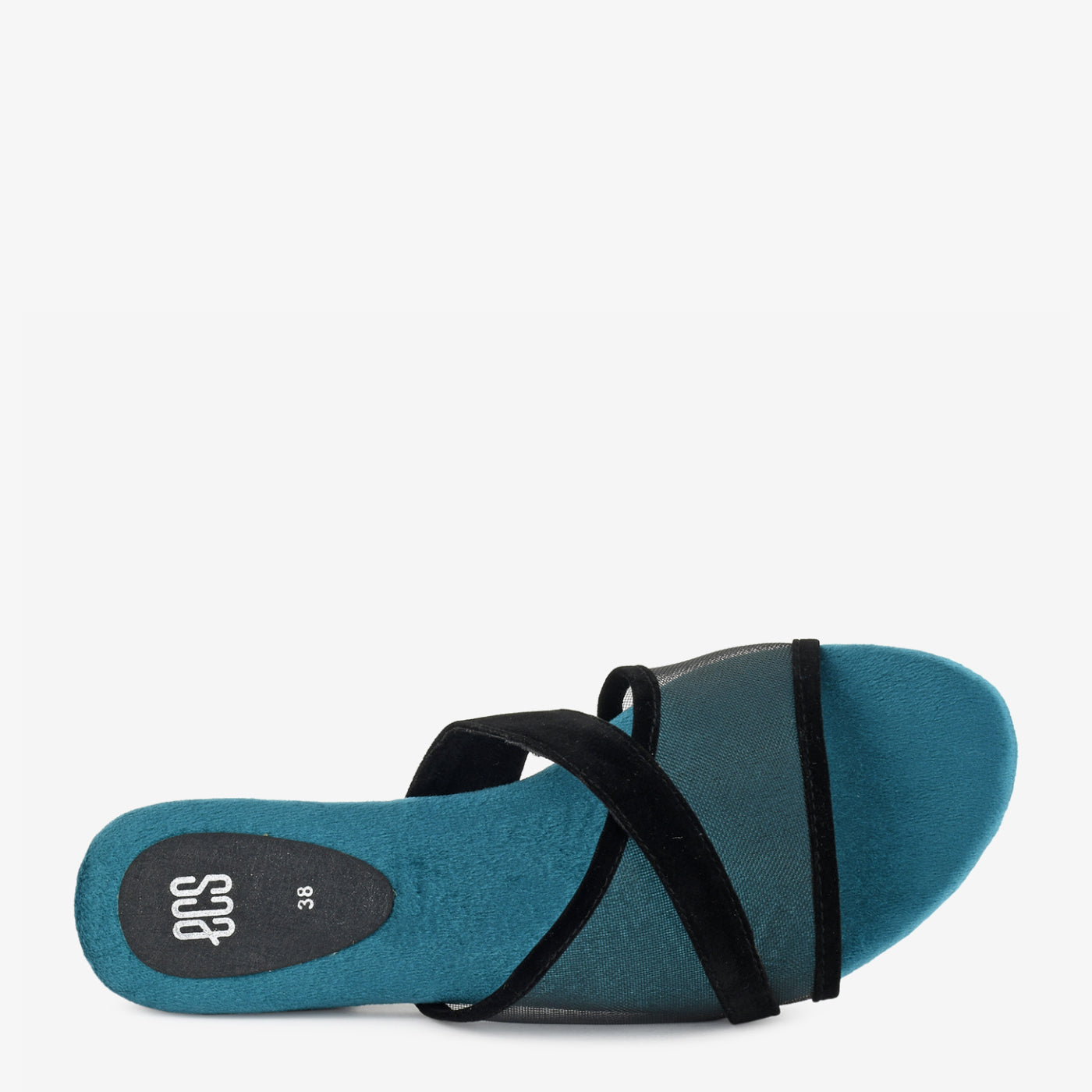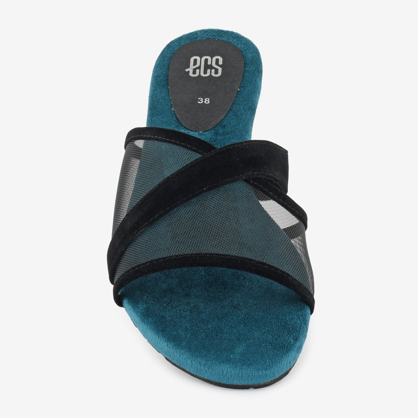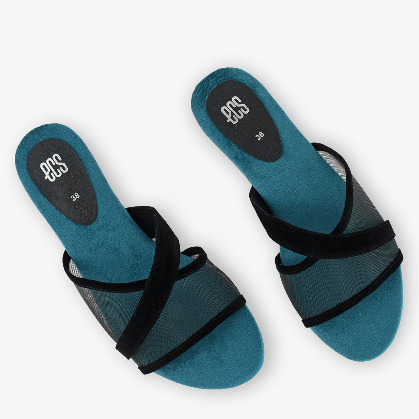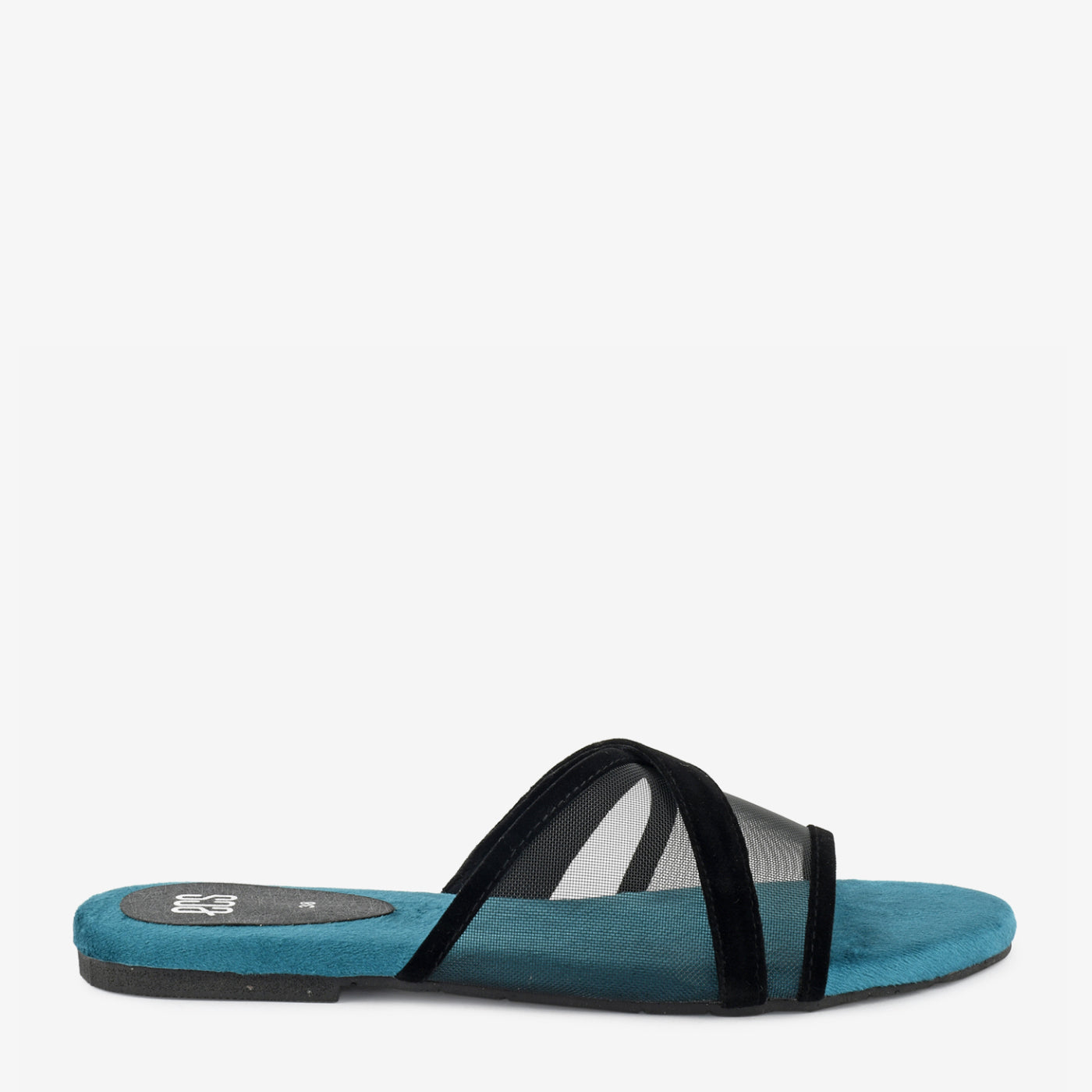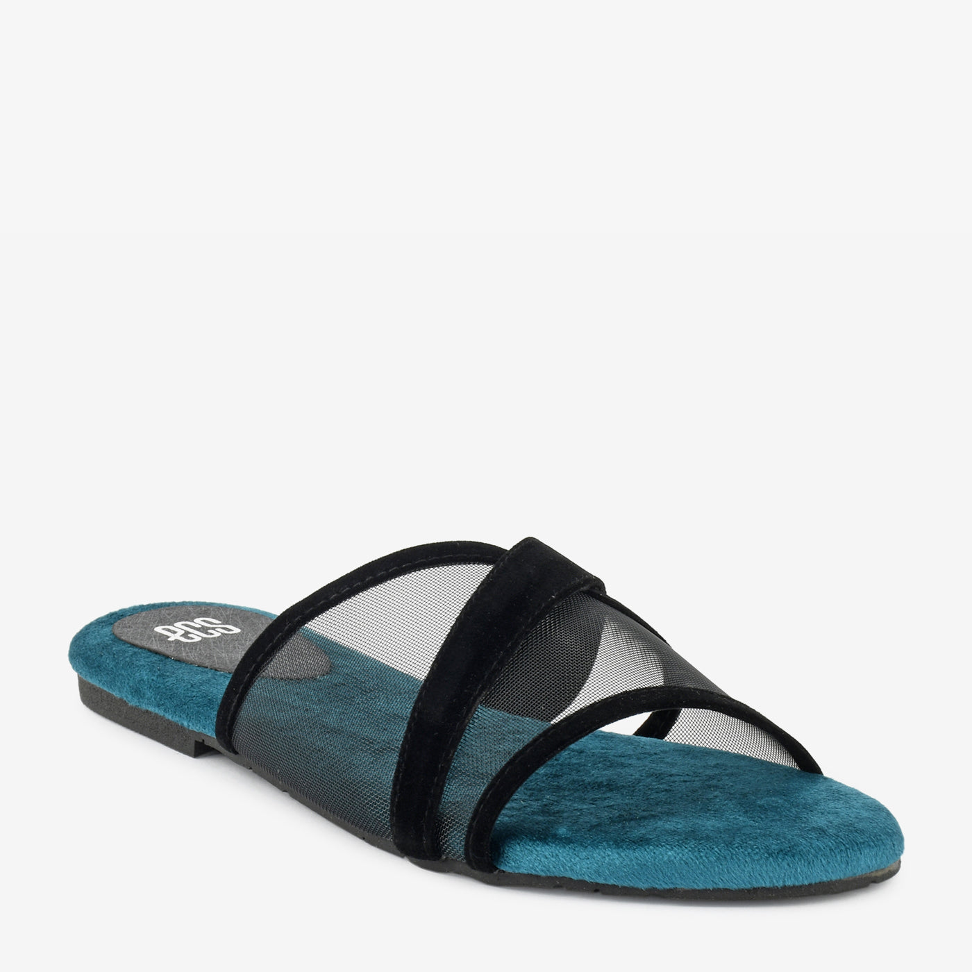 A contemporary flat with dual straps—one in velvet, the other in sheer mesh—set over a soft cushioned base. Lightweight and modern, ideal for versatile styling.