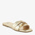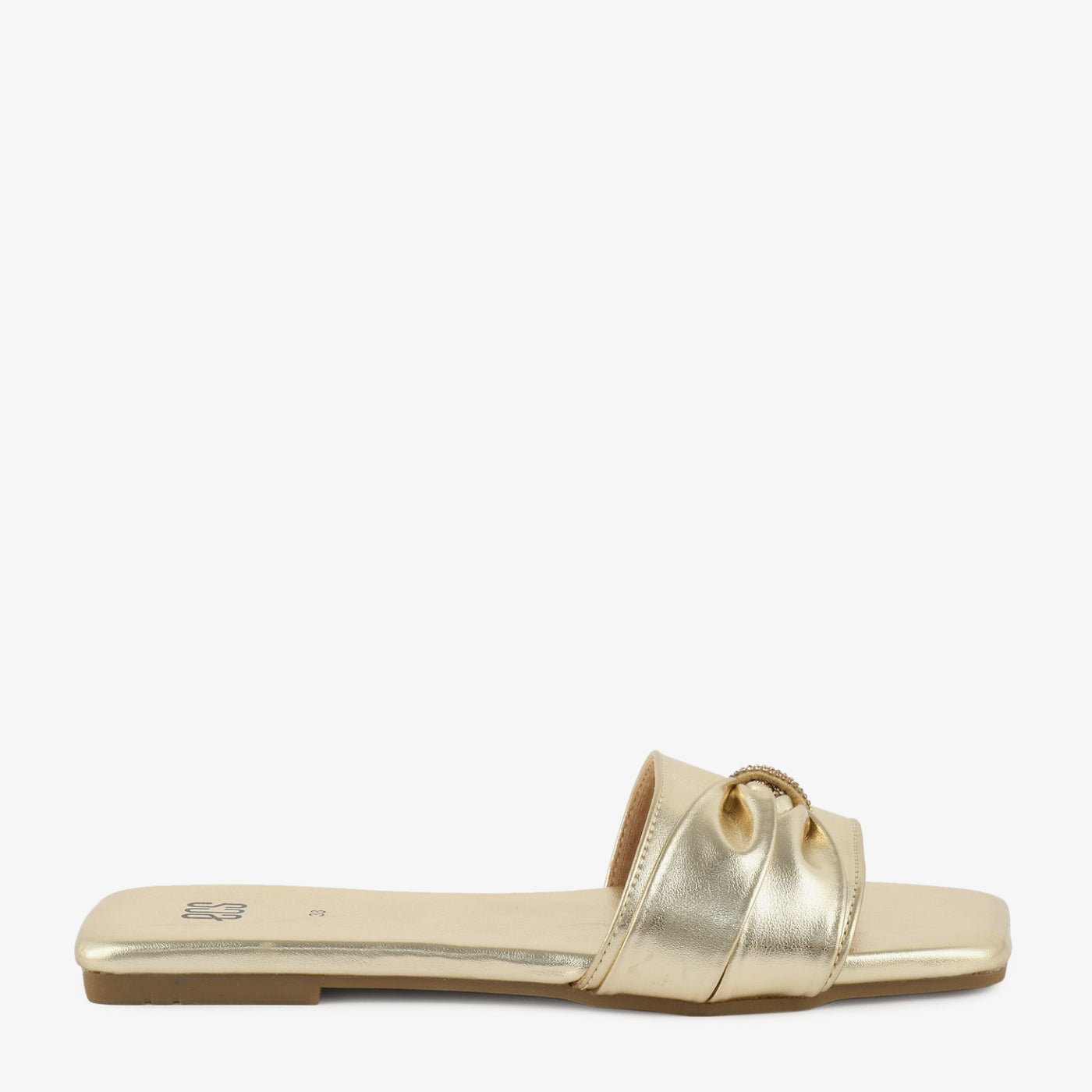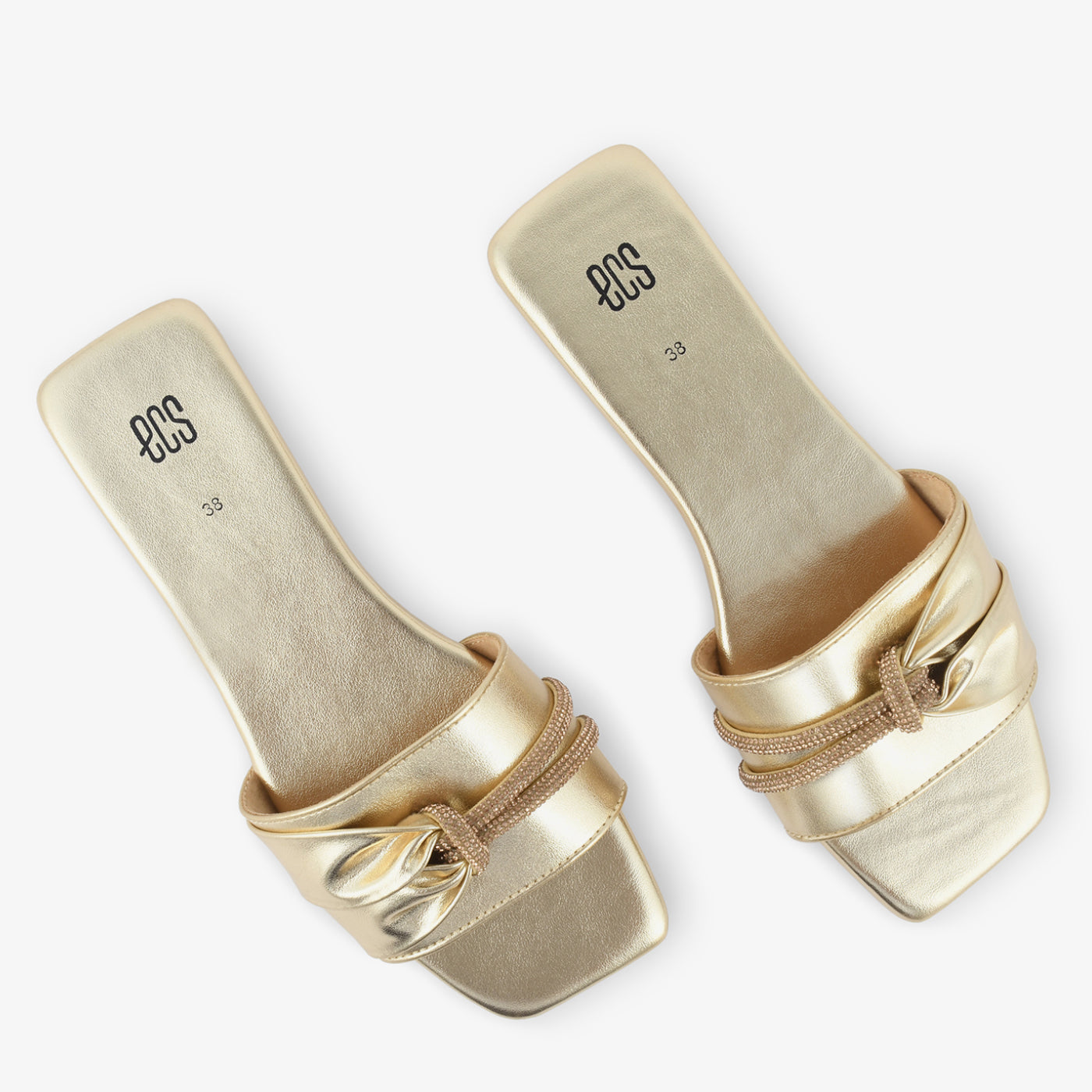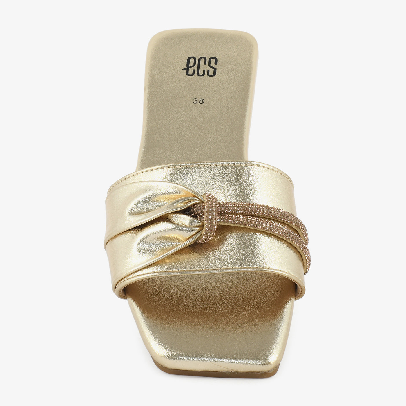 Sleek and statement-worthy, this shiny slide sandal features a twisted upper embellished with micro studs, adding just the right touch of sparkle. Its low heel makes it ideal for day-to-night transitions.