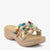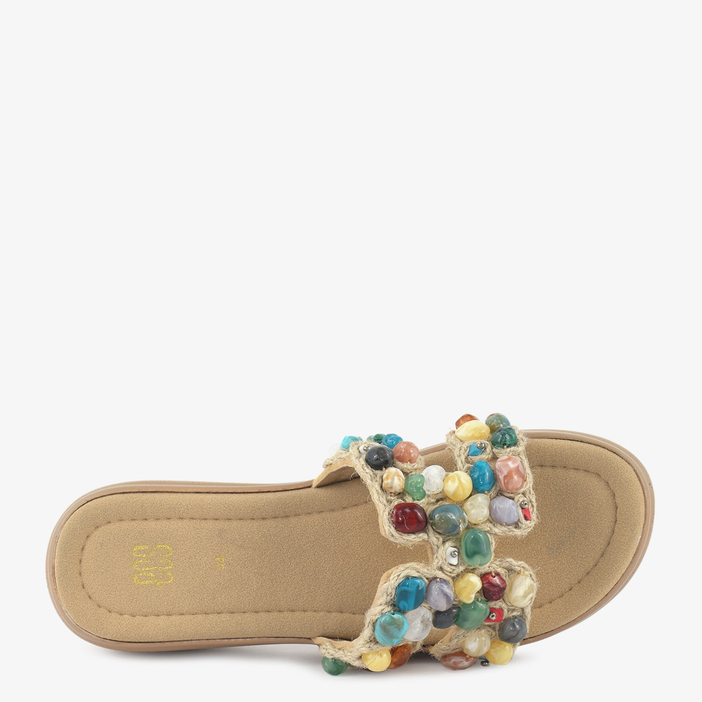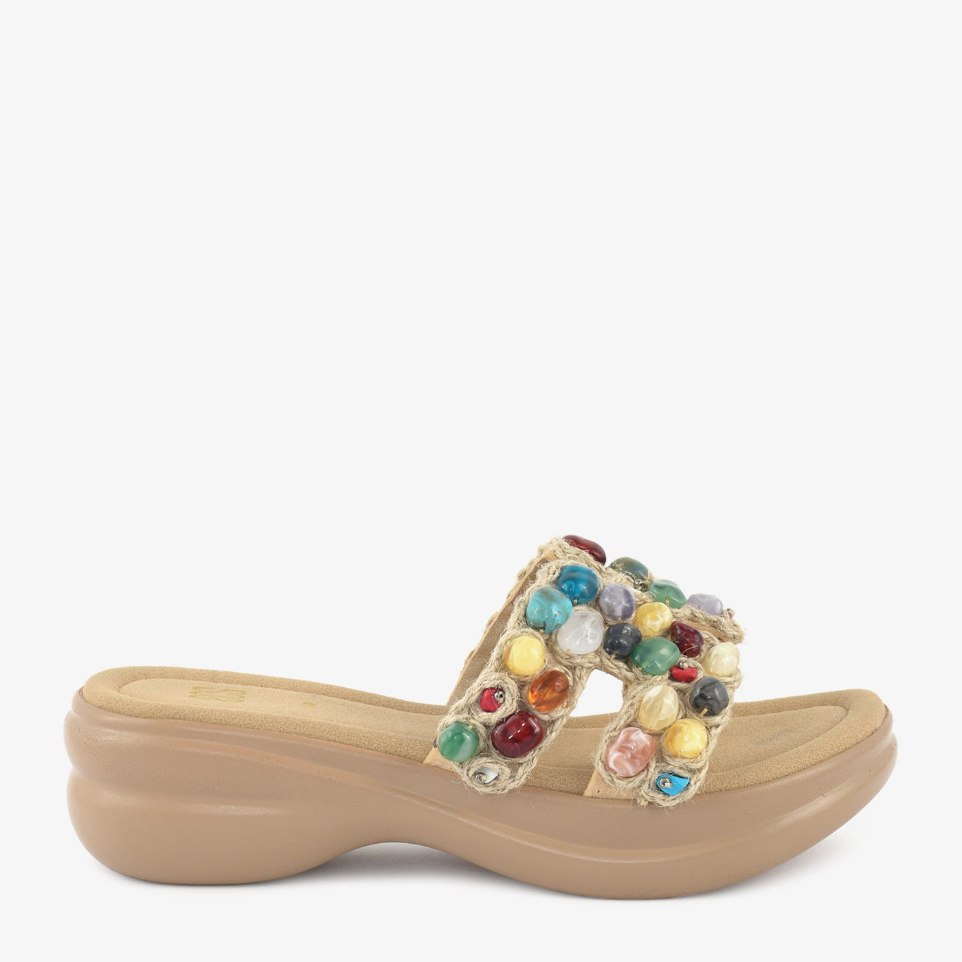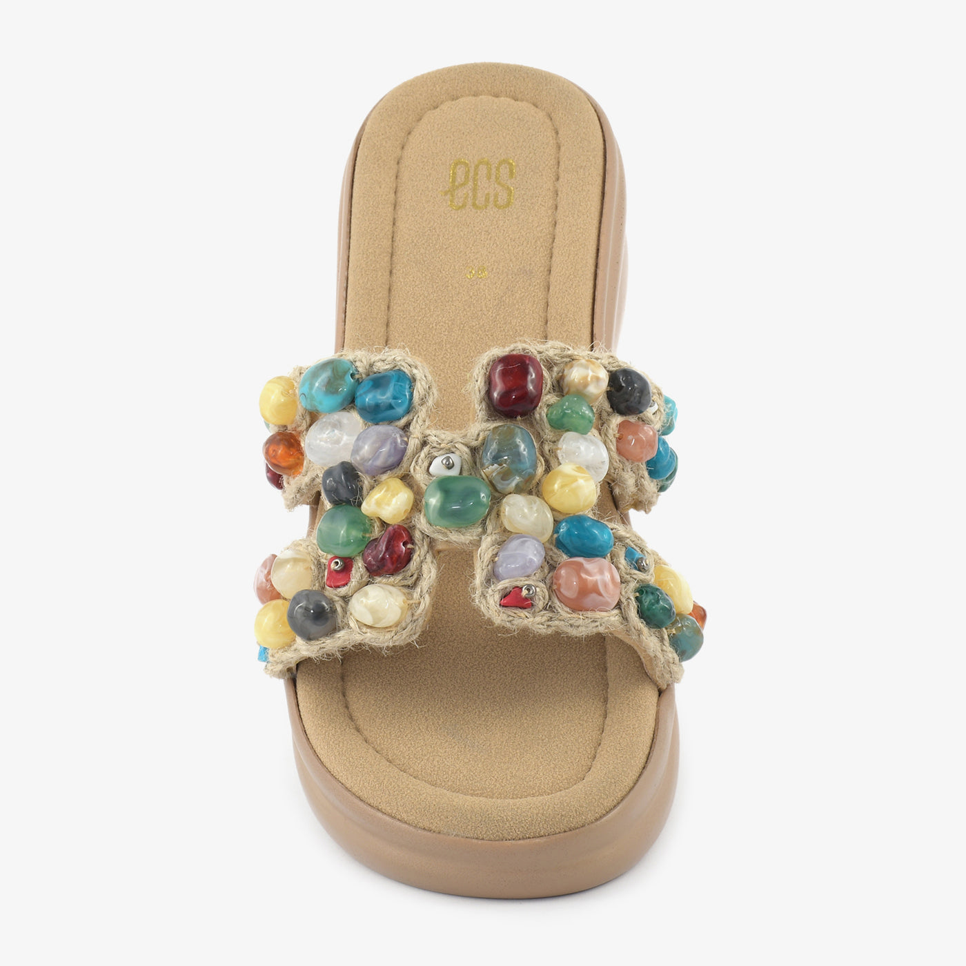 Step into vibrant style with these unique wedge slippers. They feature a beautifully embellished strap with a mosaic of colorful gemstones set in a woven design. The comfortable wedge heel provides a gentle lift, perfect for adding a touch of artistic flair to your everyday elegance.
