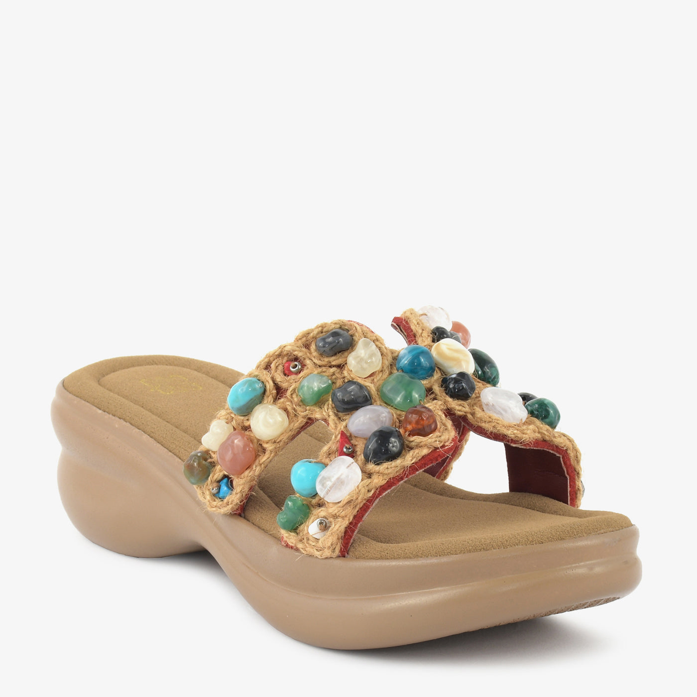 Step into vibrant style with these unique wedge slippers. They feature a beautifully embellished strap with a mosaic of colorful gemstones set in a woven design. The comfortable wedge...