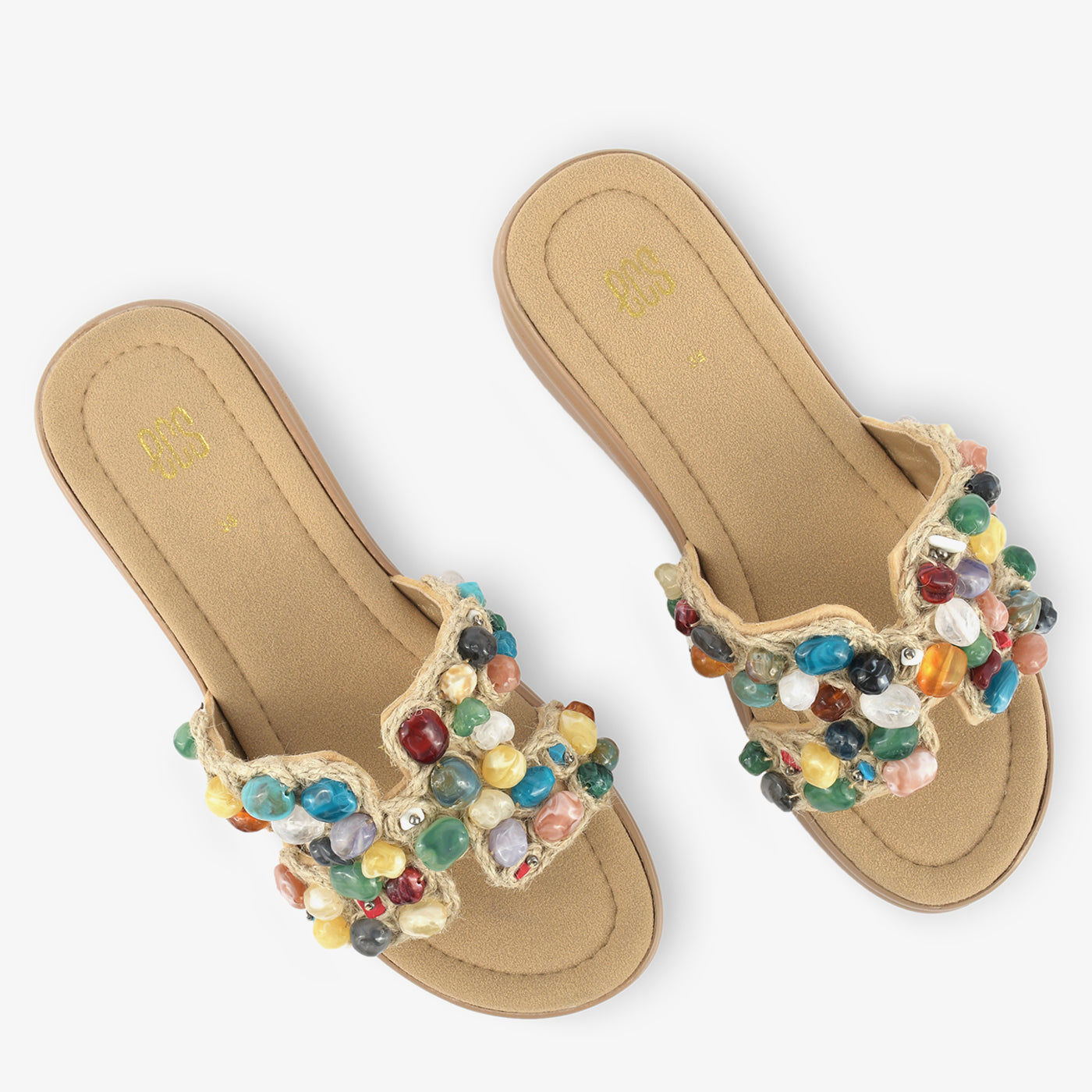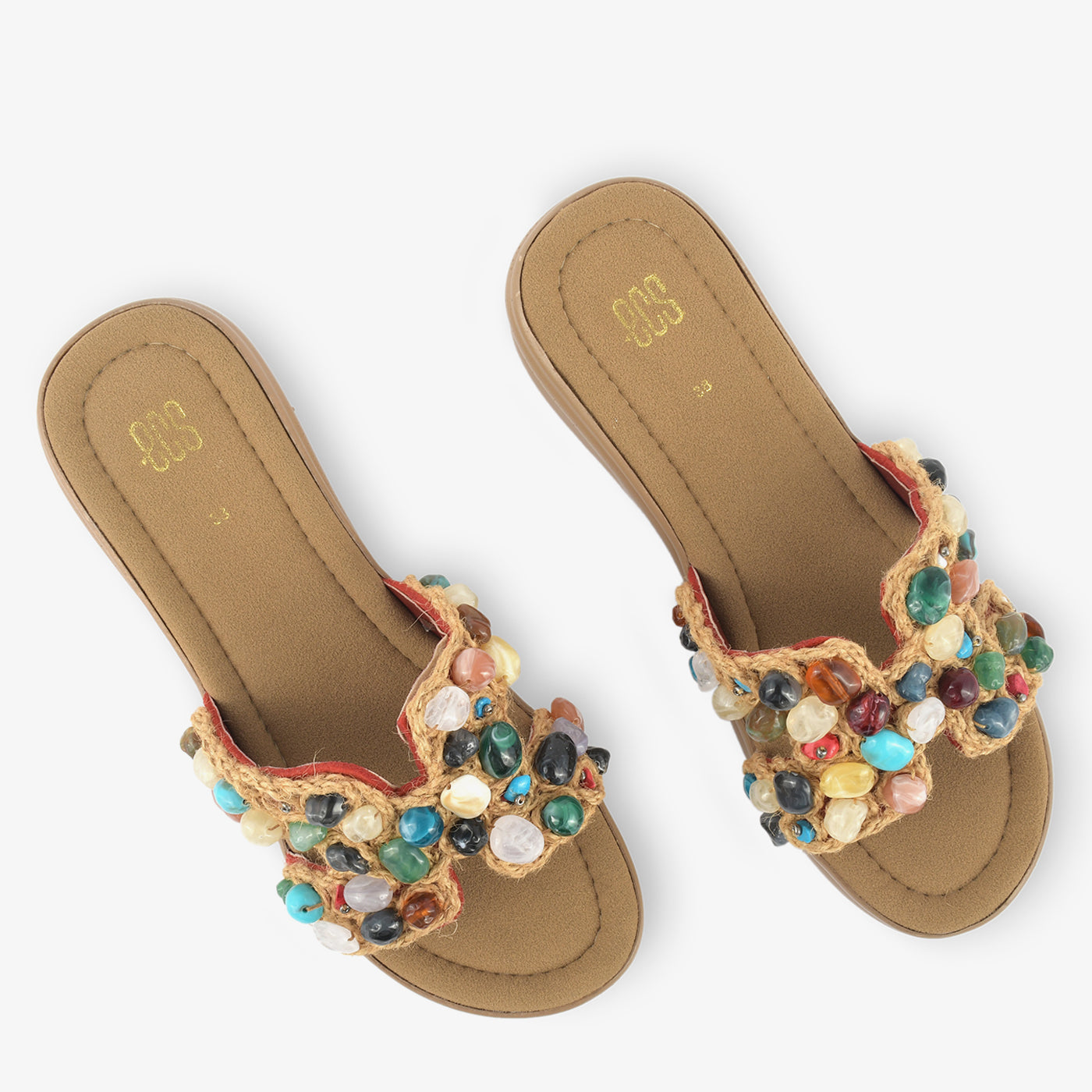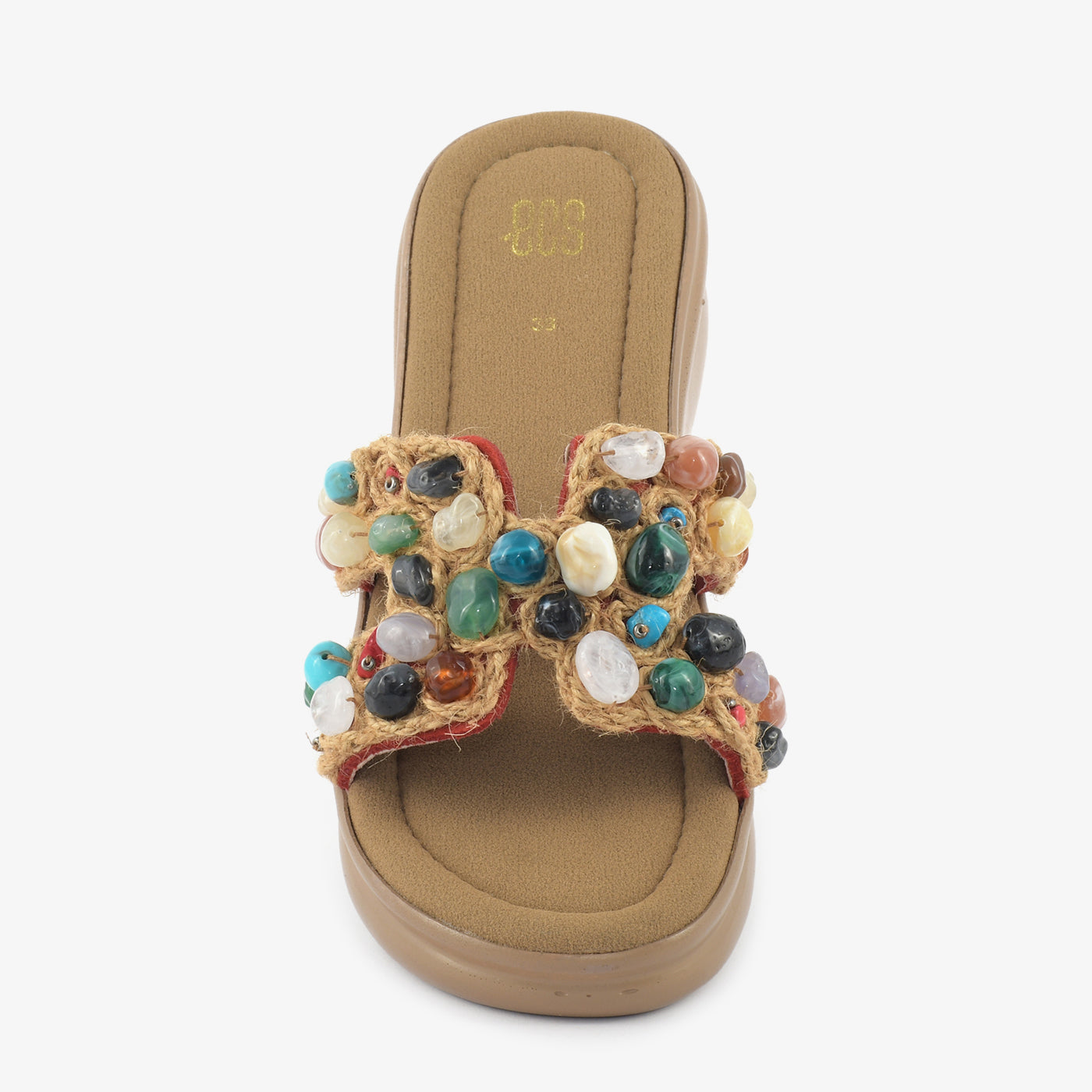 Styling Tip: Pair these gemstone wedge slides with a light cotton kurta and trousers or a flowy summer dress for a relaxed yet stylish look. Their unique texture will add an interesting element to your outfit.