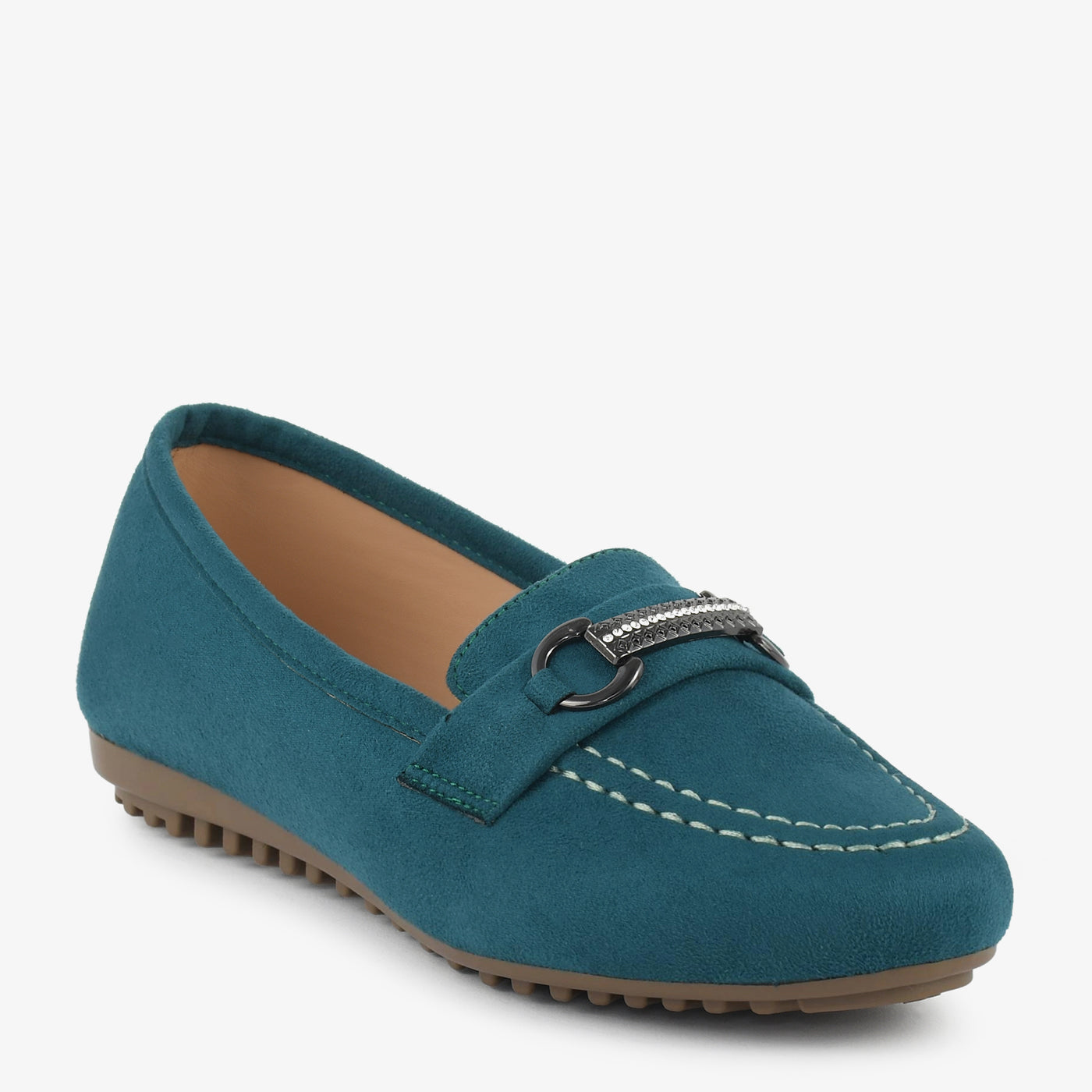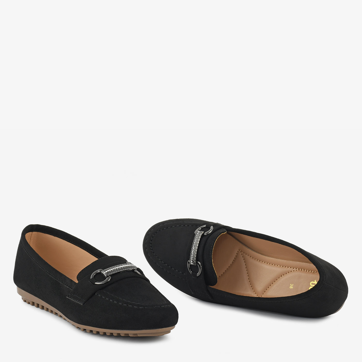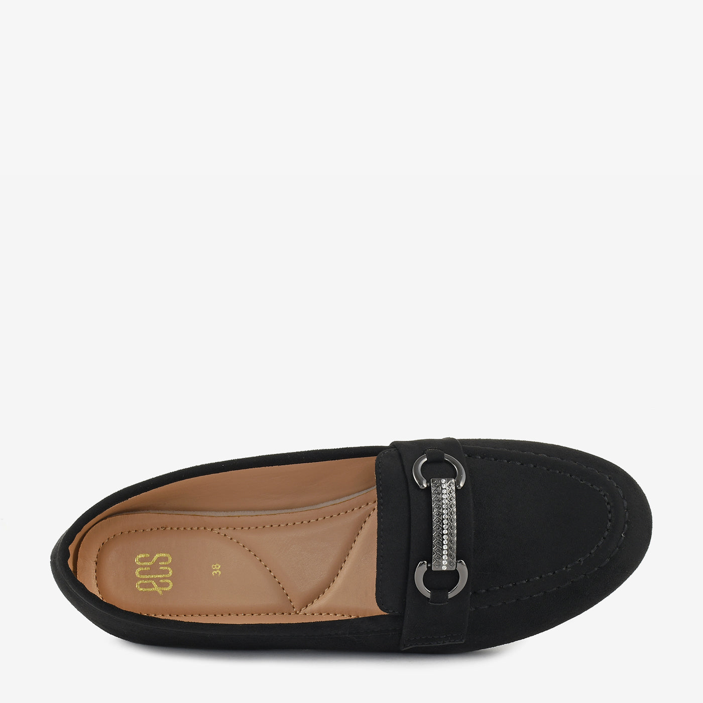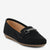 A sophisticated black slip-on detailed with a metallic bar and sparkling crystal highlights. The velvety texture gives a rich look that blends easily with formal or casual ensembles. Its cushioned insole and gripped base promise all-day comfort and durability. Stylish, elegant, and versatile for every occasion.