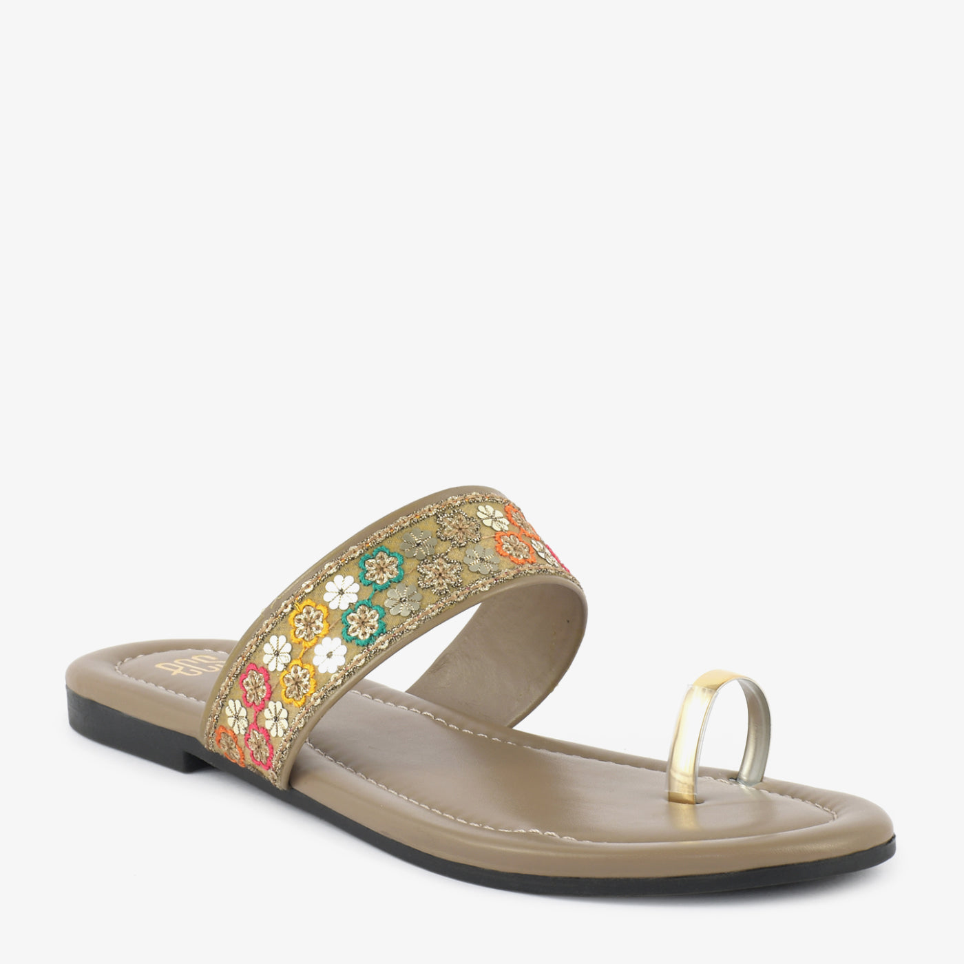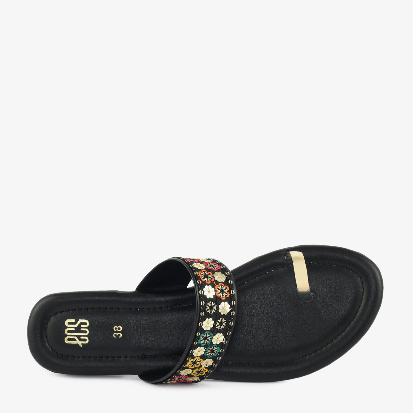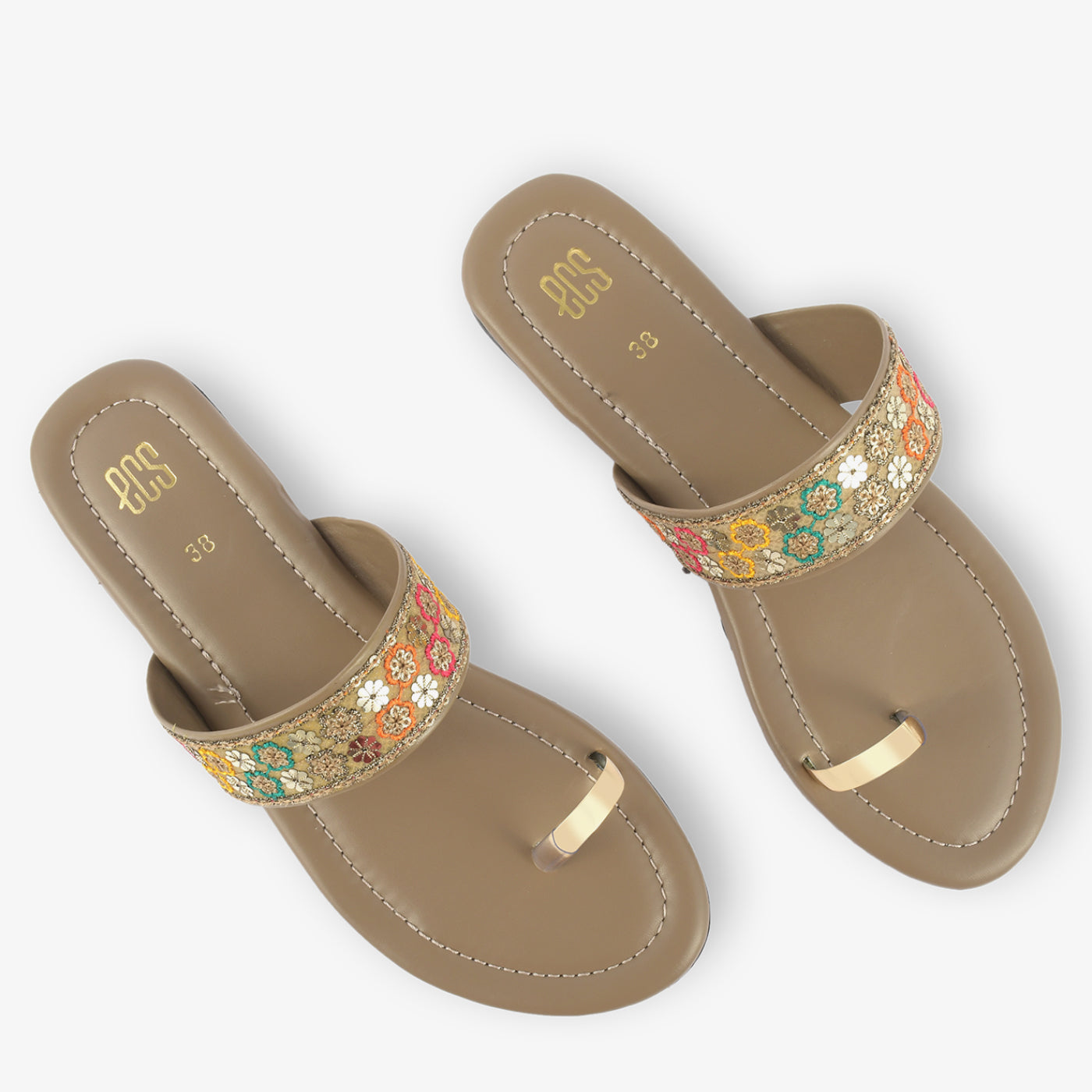Add a touch of vibrant detail to your look with the Floral Band Chappal. These chappals feature a beautifully embroidered floral band, creating a look that's both colorful and elegant. The comfortable flat sole makes them perfect for everyday wear.