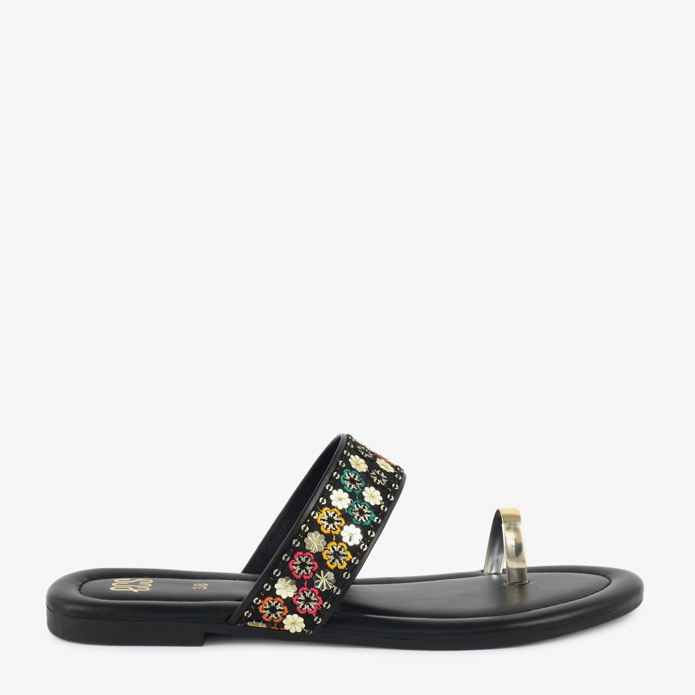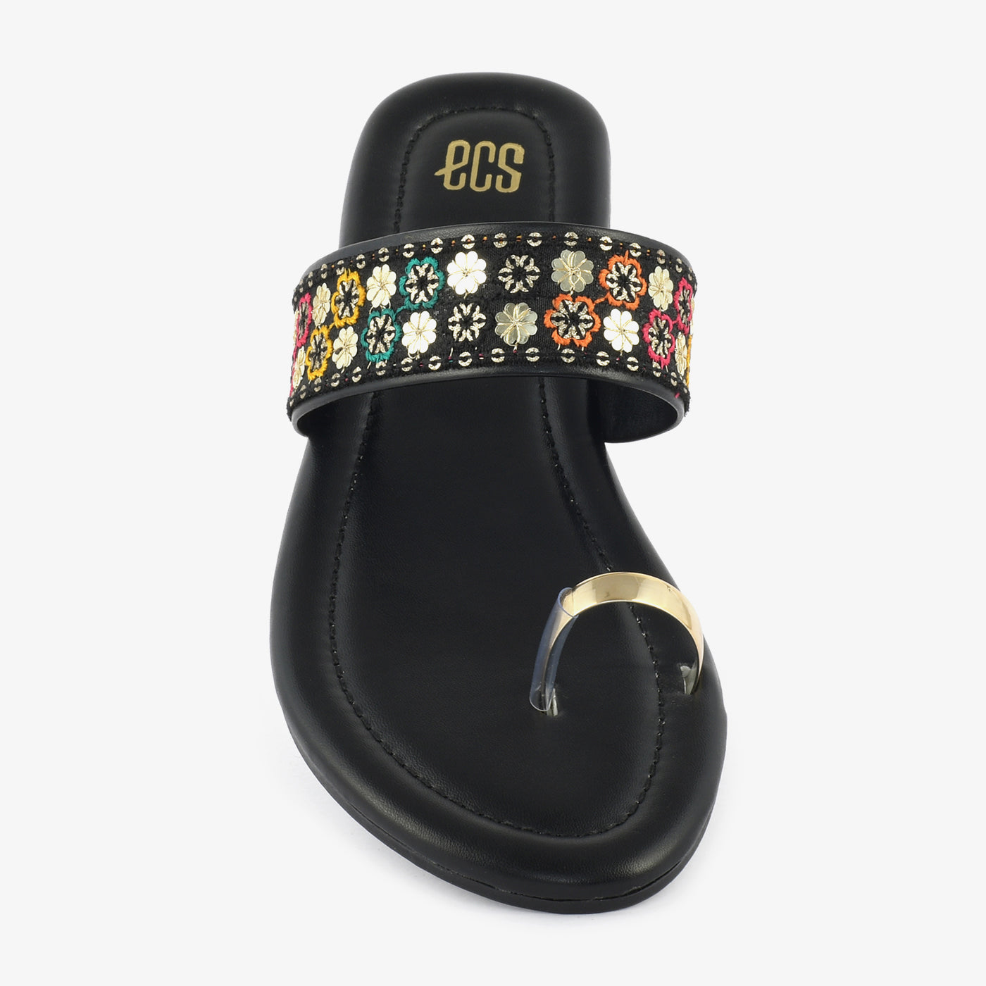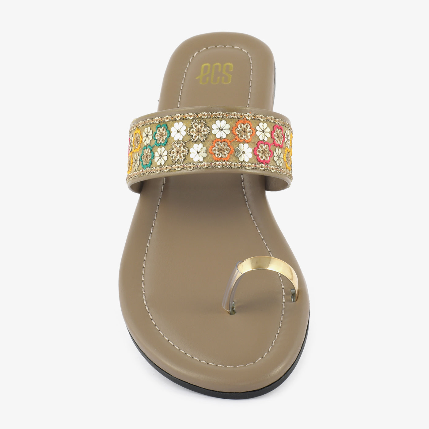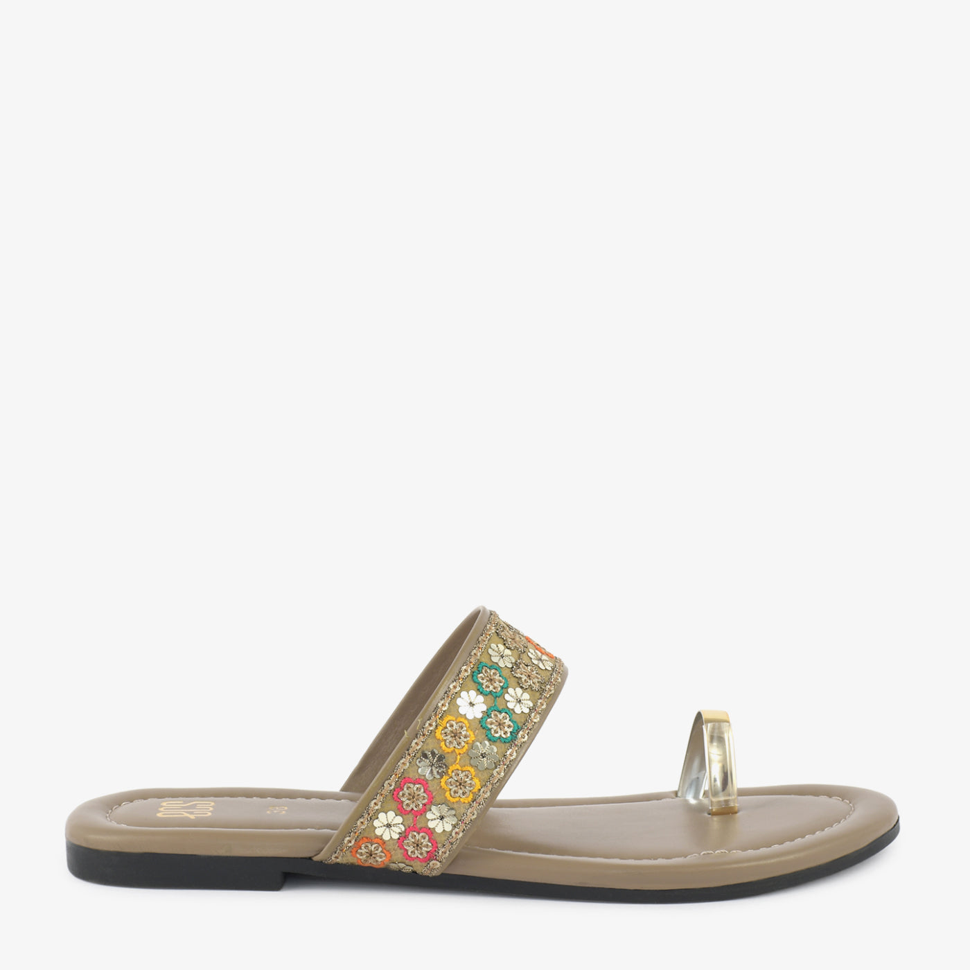 Add a touch of vibrant detail to your look with the Floral Band Chappal. These chappals feature a beautifully embroidered floral band, creating a look that's both colorful and elegant. The comfortable flat sole makes them perfect for everyday wear.