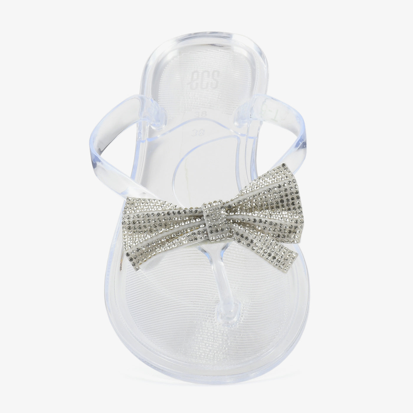 This elegant chappal features a transparent thong-style base that creates a light and modern look. The highlight of the design is a delicate crystal-studded bow placed on the upper, adding a graceful sparkle that enhances its refined appeal. The smooth, flexible sole offers comfortable wear, making it suitable for extended use. Easy to slip on and effortlessly stylish, this chappal balances simplicity with a touch of glamour, perfect for everyday elegance.
