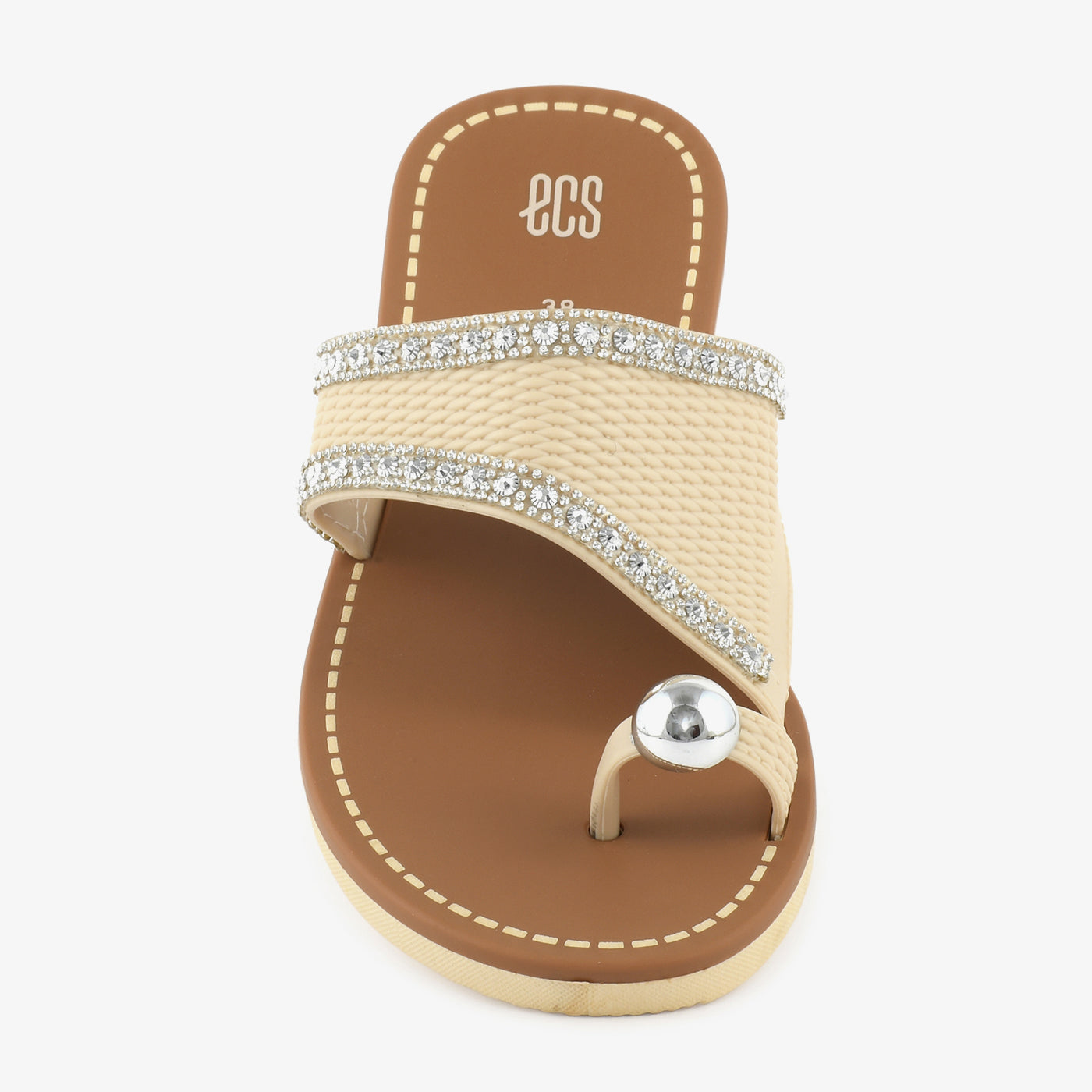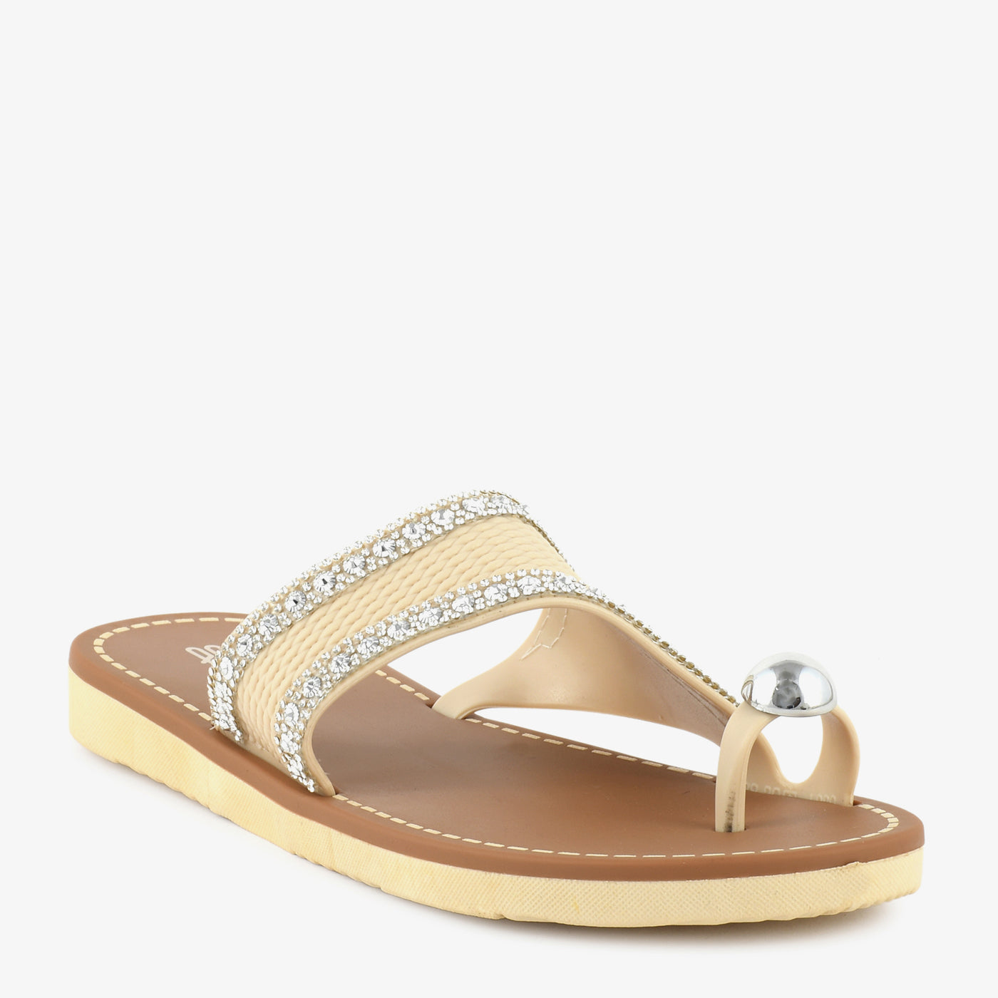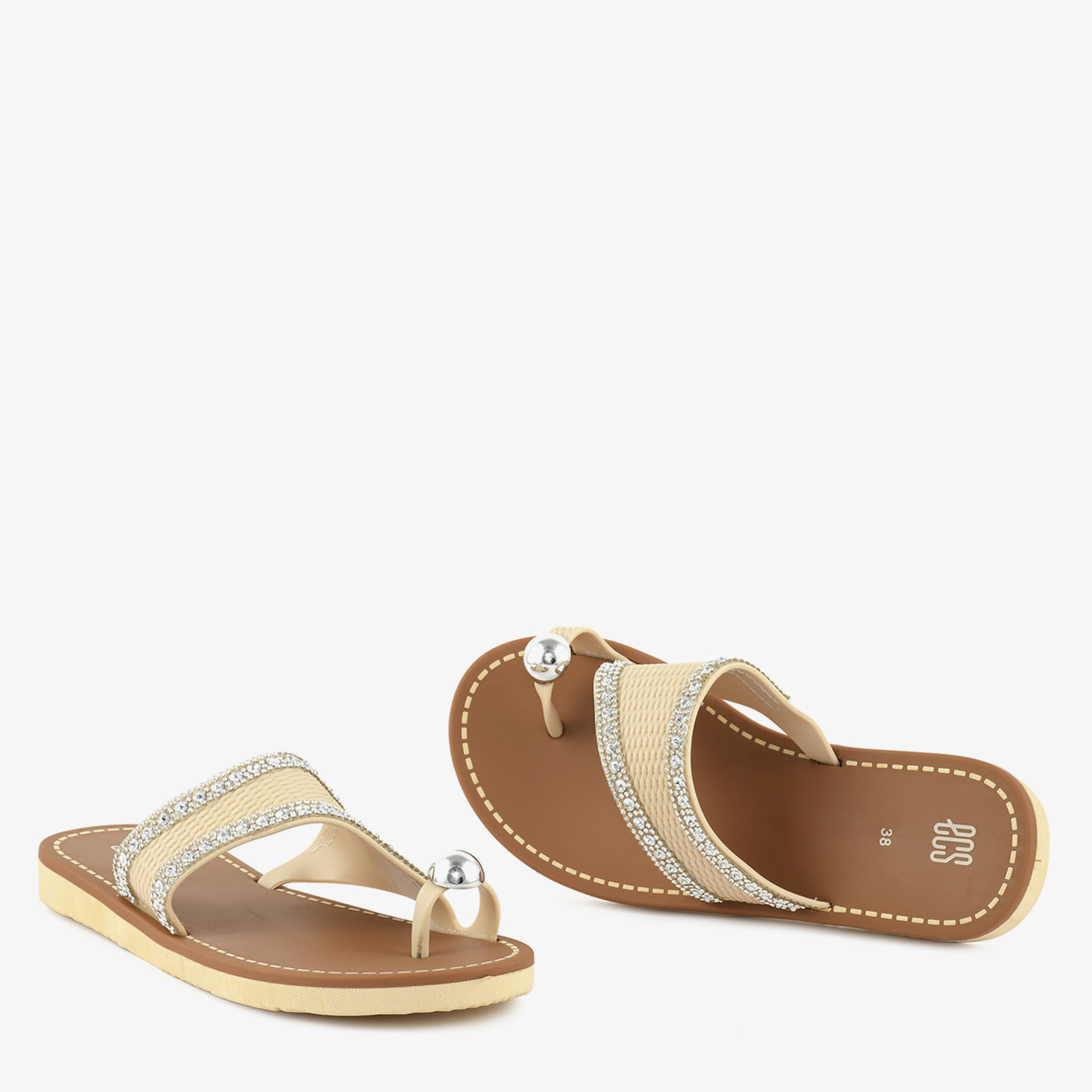 This elegant women’s chappal is designed to add subtle shine and everyday comfort to your footwear collection. Featuring a broad textured strap highlighted with delicate stone detailing and a stylish toe loop accent, it brings a refined yet modern appeal. The cushioned footbed supports relaxed movement, while the flat sole ensures easy all day wear. Lightweight and slip on in design, this chappal is ideal for daily outings as well as casual festive moments.