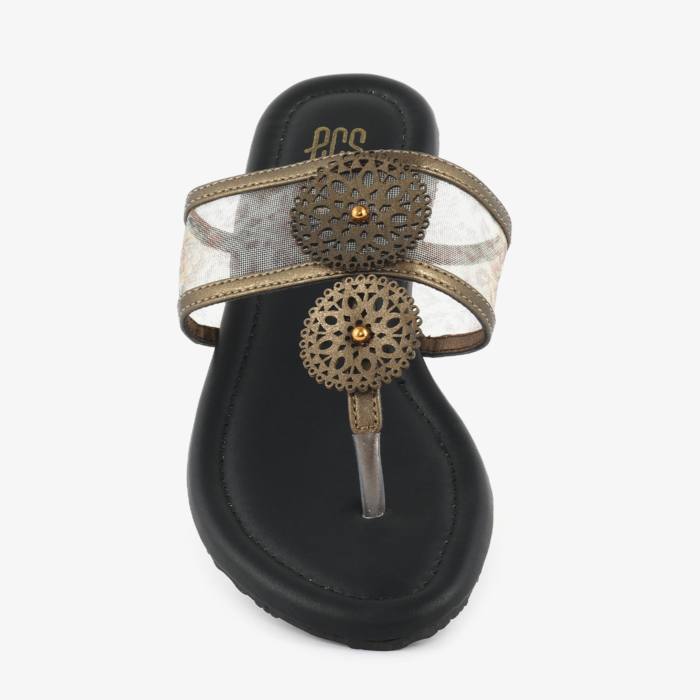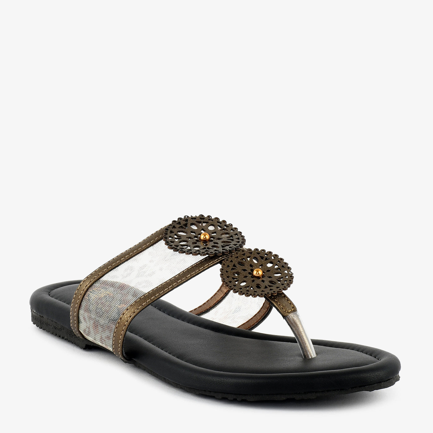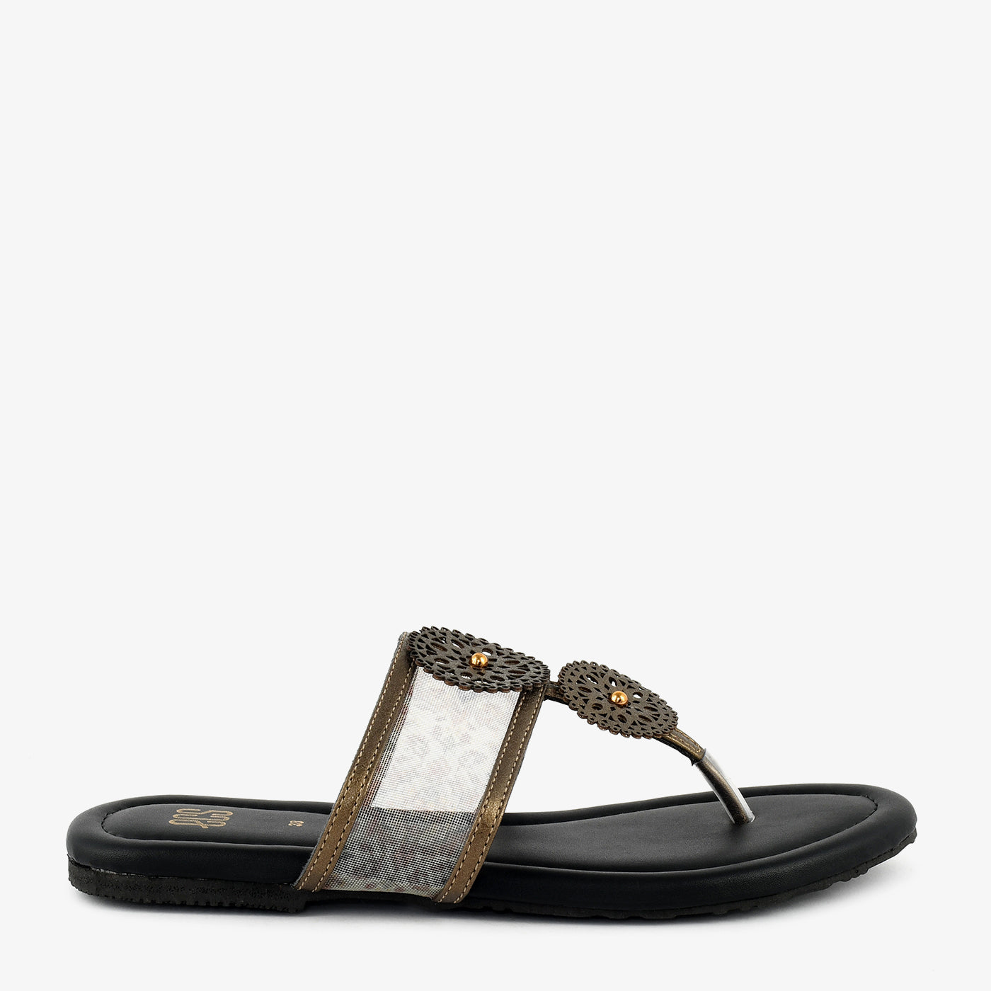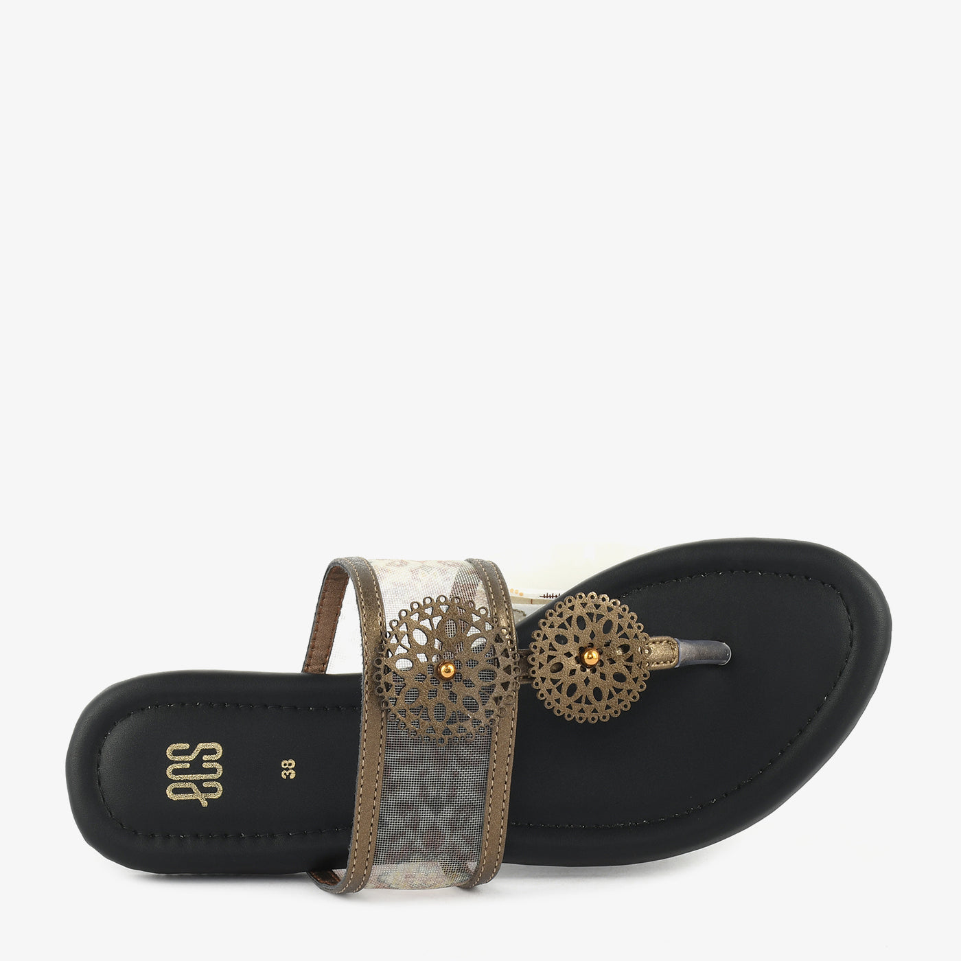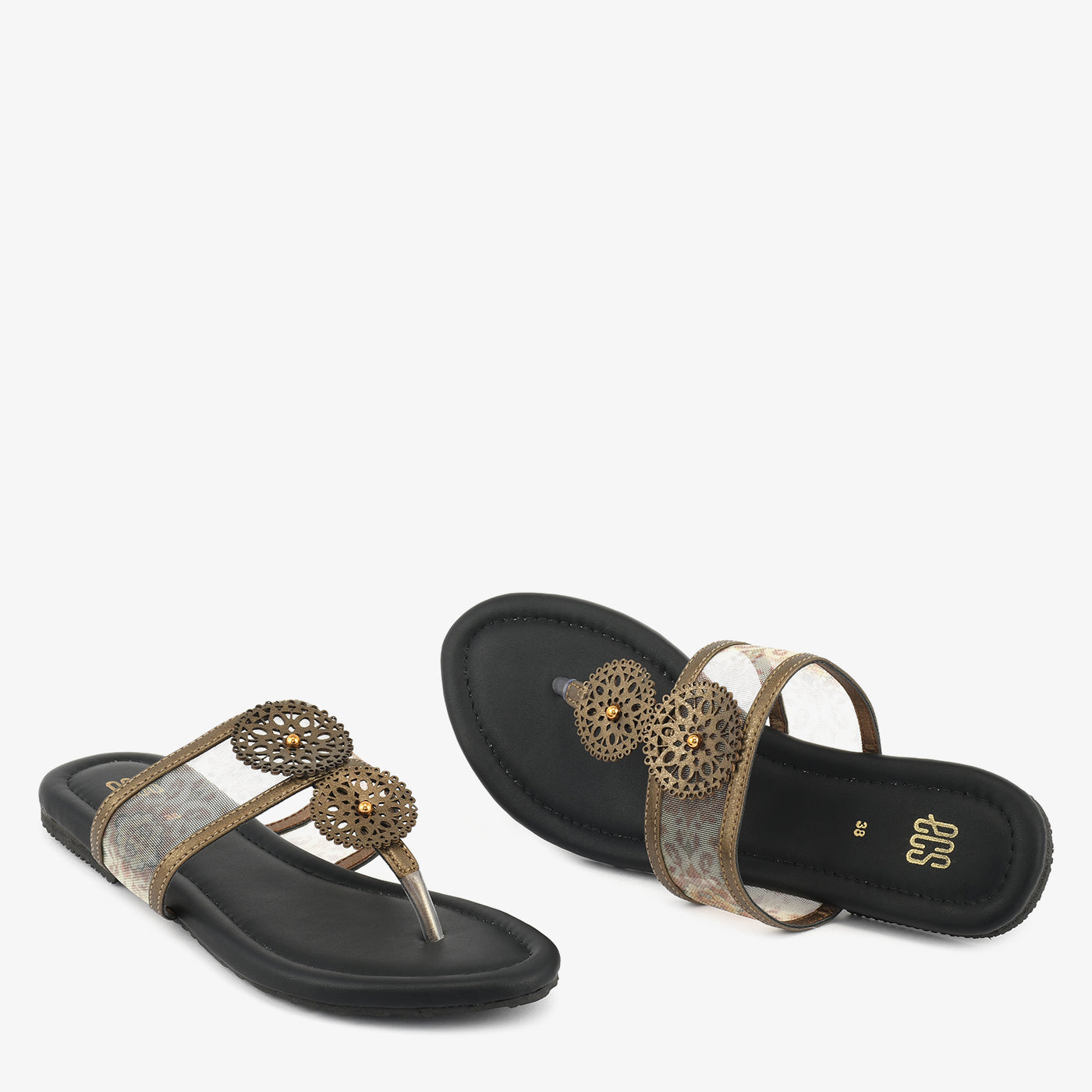 A flat toe-post chappal built on a cushioned footbed, featuring a semi-transparent printed strap with antique gold-tone trim that runs across the vamp. Two ornate filigree medallion accents sit prominently on the strap, each crafted with intricate lattice detailing and a small bead centre, drawing from traditional decorative motifs. The toe-post construction offers a secure and familiar fit, while the contoured sole provides comfort for extended casual wear. A refined take on an everyday chappal that blends traditional ornamentation with a practical flat silhouette.