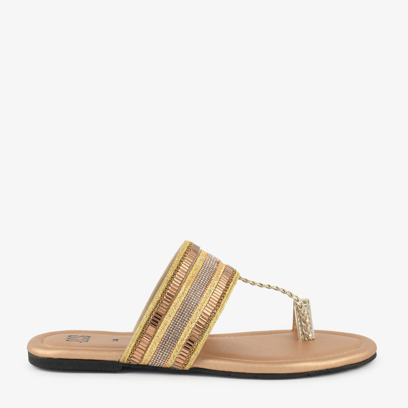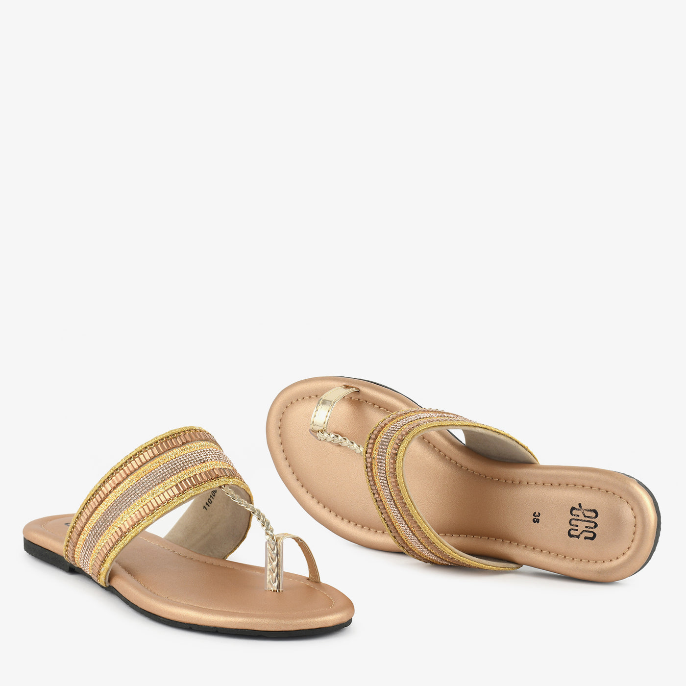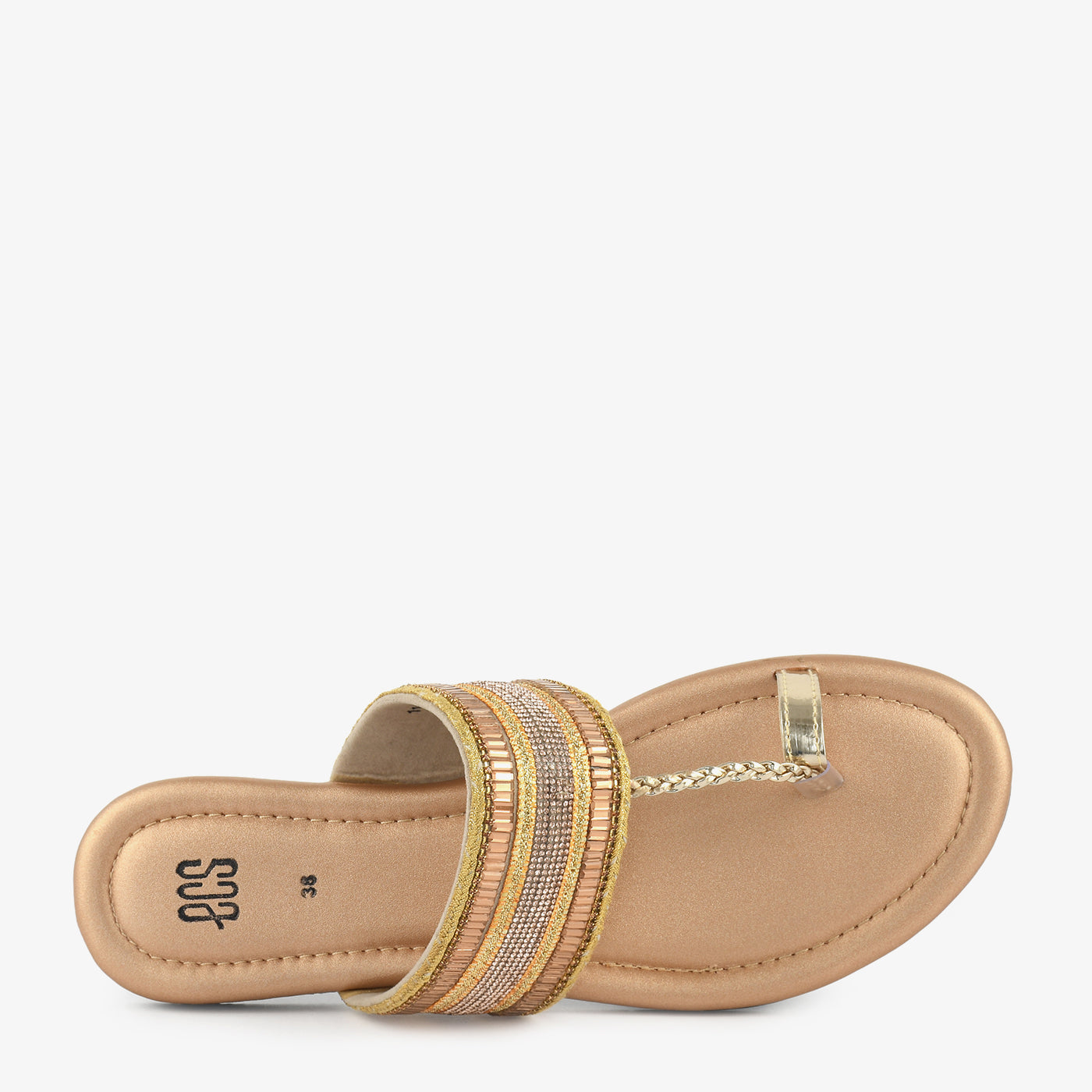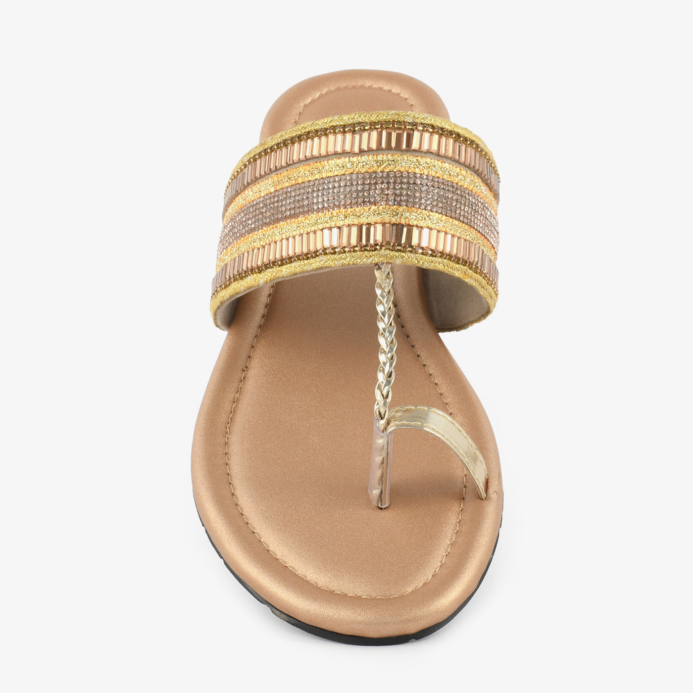 This elegant women’s chappal is crafted to add a festive touch to your everyday and occasion wear. Designed with a broad embellished strap and a delicate braided toe loop, it features intricate detailing that enhances its graceful appeal. The flat slip-on silhouette ensures easy wear, while the refined finish makes it suitable for both casual outings and special gatherings. Lightweight and stylish, this chappal brings together traditional charm and modern simplicity in one versatile design.