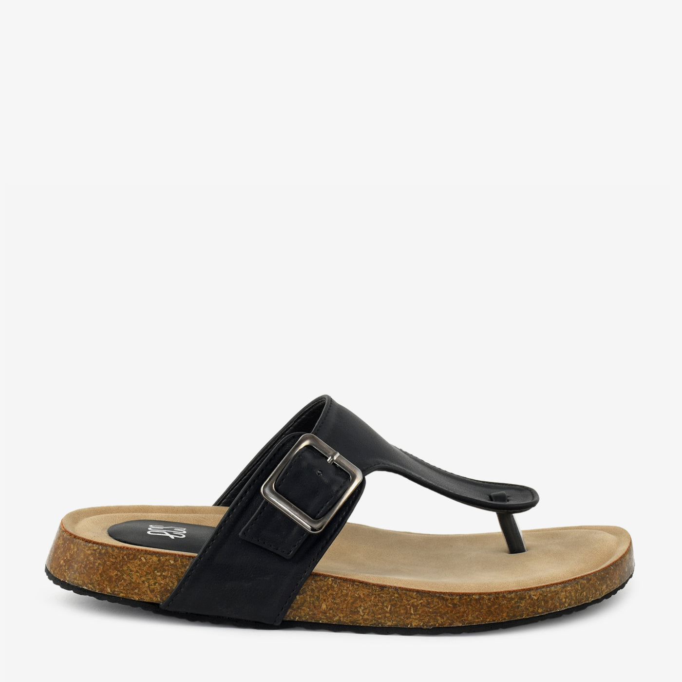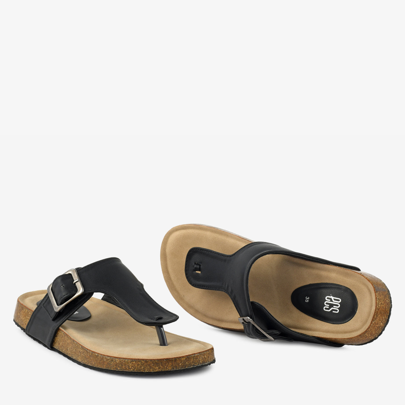 - Material: Synthetic upper with buckle hardware and cork-effect sole