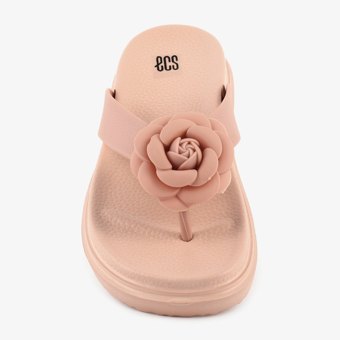 - Design: Wedge flip-flop with floral embellishment