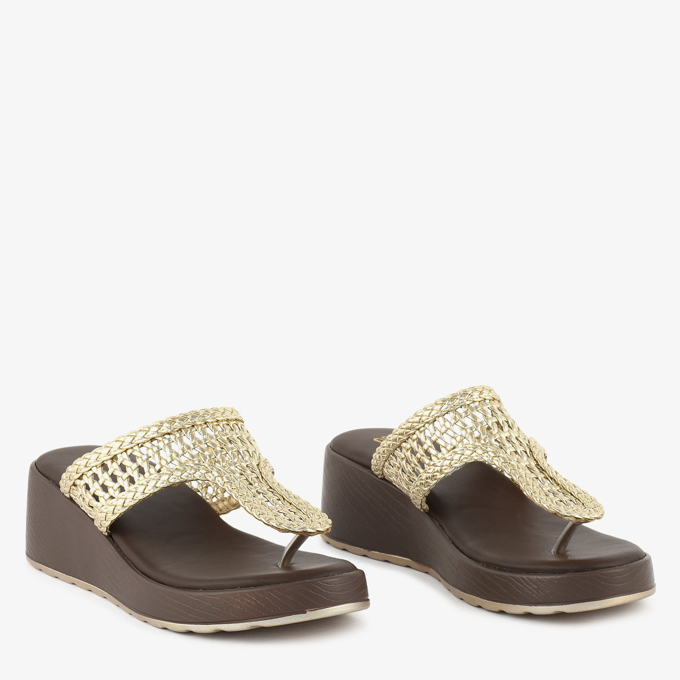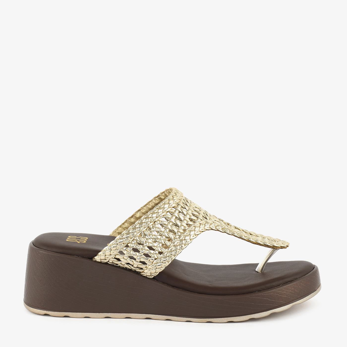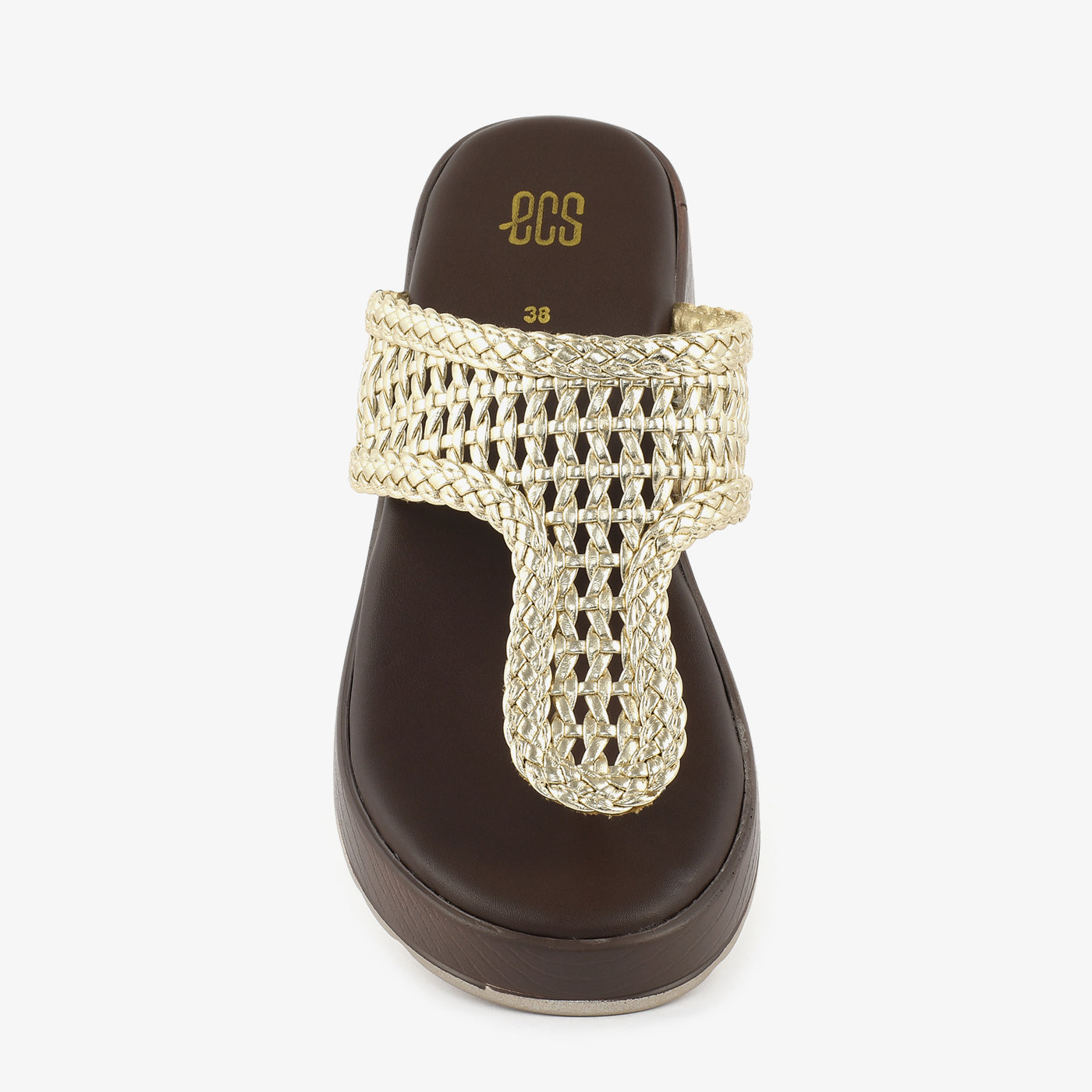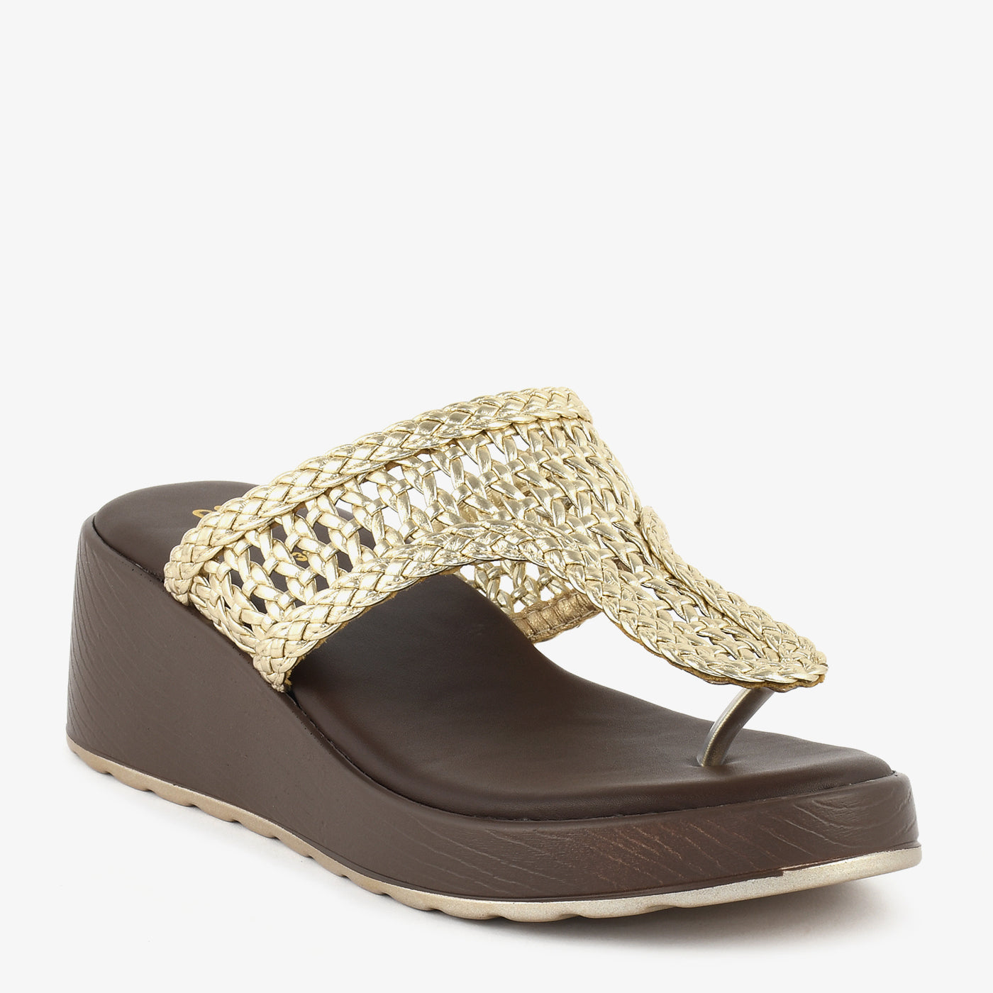 - Design: Wide open-lattice woven strap toe-post chappal set on a platform wedge sole with smooth toe fitting