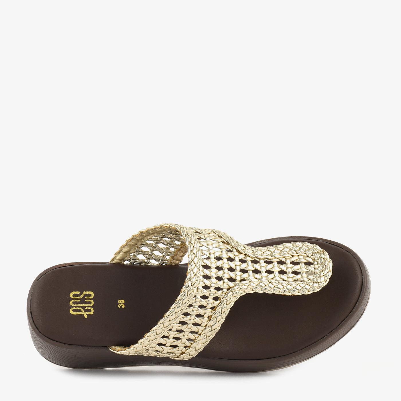 A toe-post chappal featuring a wide metallic woven strap that drapes generously across the vamp in an open lattice weave construction. The interlaced braid pattern creates a textured and dimensional upper that catches light with a subtle sheen, adding a refined character to a casual silhouette. Set on a structured platform wedge sole, this chappal delivers a confident lift while maintaining a comfortable and stable stride. The cushioned footbed and smooth toe-post fitting ensure ease of wear throughout extended use. A well-considered chappal that balances artisanal texture with everyday wearability.