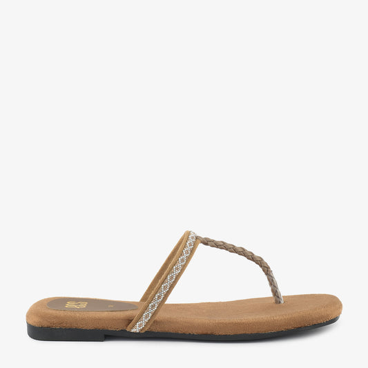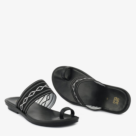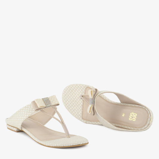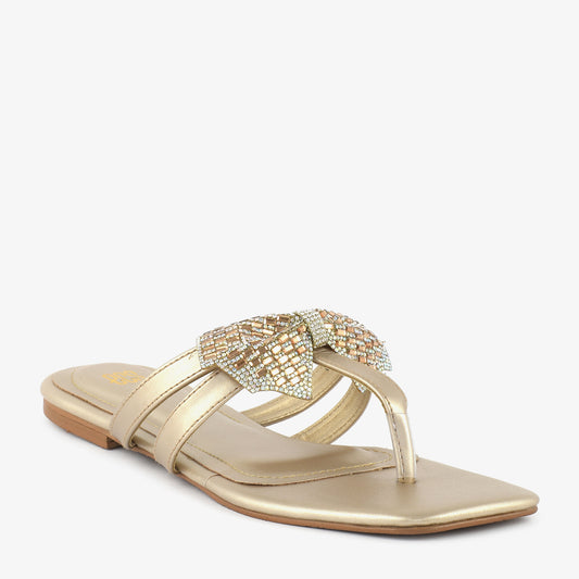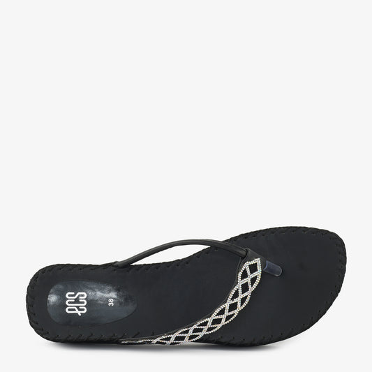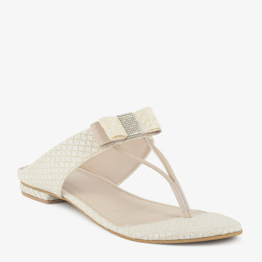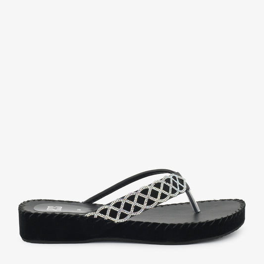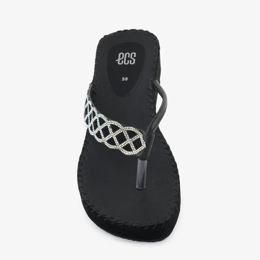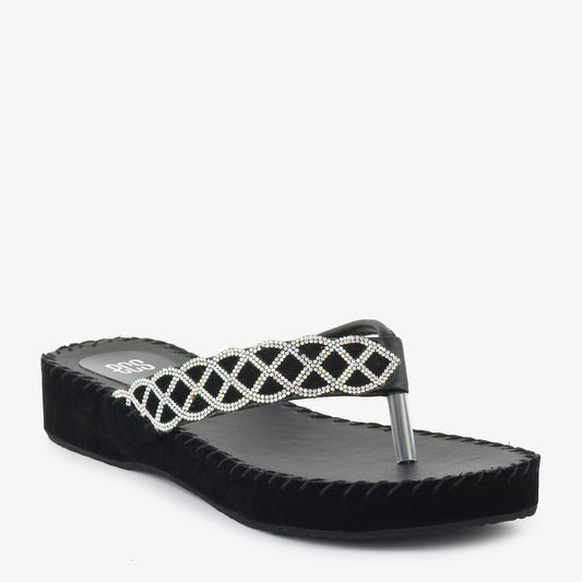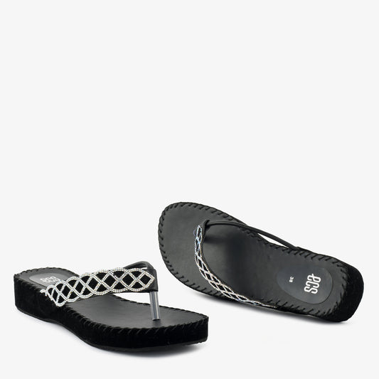 Step into the spotlight with the "Midnight Sparkle" chappal. Featuring a glittery synthetic PU upper and exquisite embellishments, this chappal is perfect for any evening or party event. The slip-on fastening provides convenience, while the round toe shape and flat heel ensure a comfortable fit. Elevate your evening wardrobe with these dazzling chappals.