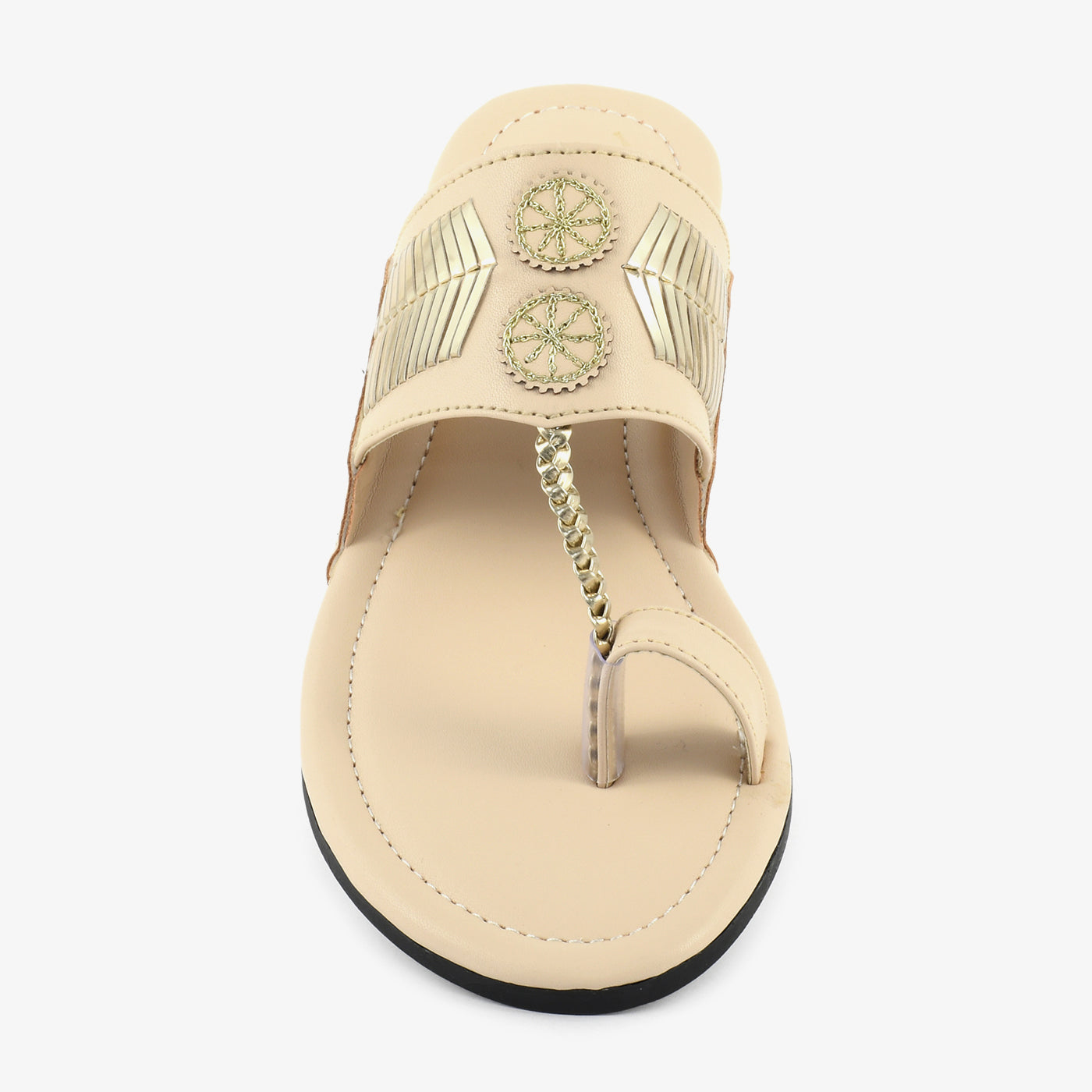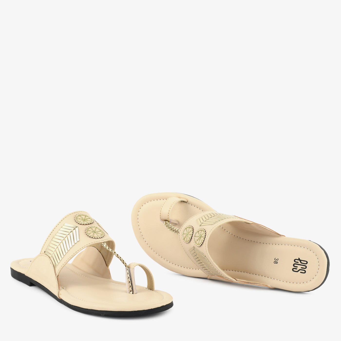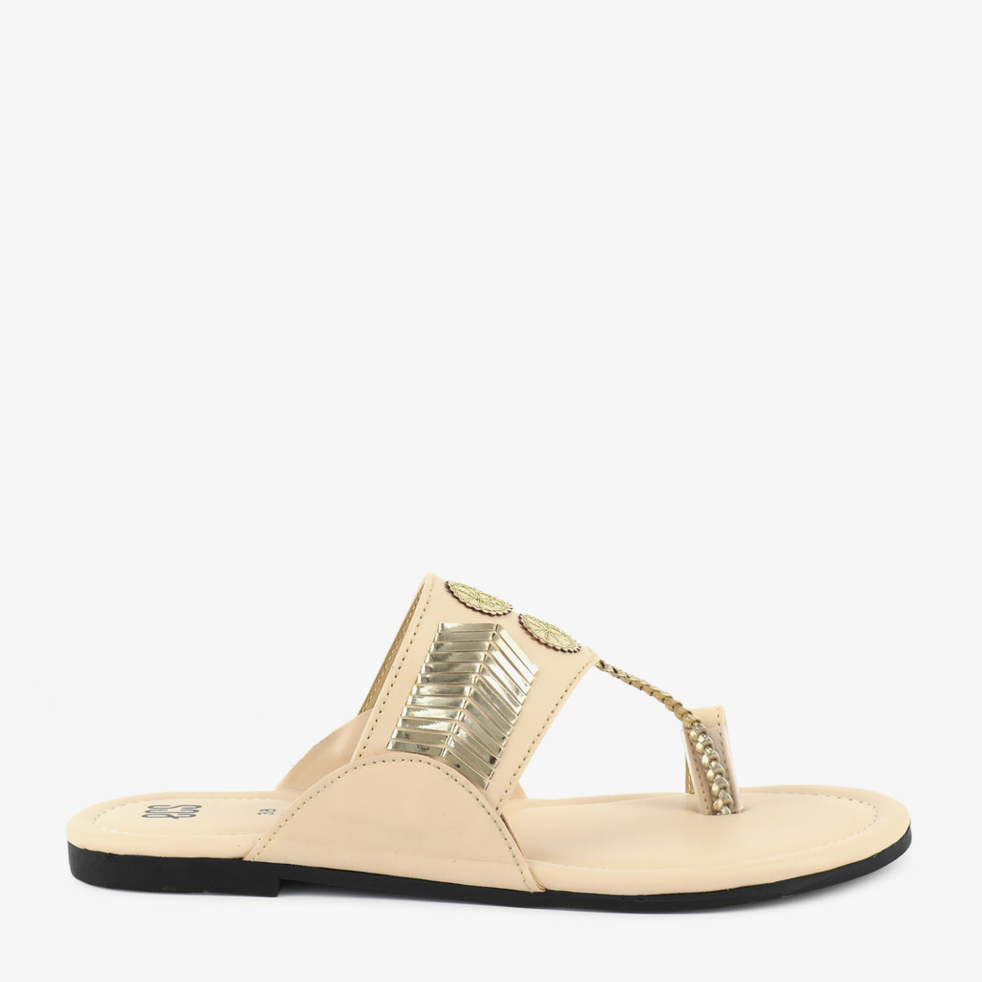 Flat chappals with a toe post and a wide upper featuring geometric cutout patterns and circular embellishments. The slip-on design offers effortless wear for casual and semi-formal occasions. Crafted with a cushioned footbed that provides comfort throughout extended periods. The flat sole ensures ease of movement while maintaining a refined aesthetic. Perfect for daytime events that call for both comfort and a polished appearance. A versatile addition that complements casual and tailored ensembles with ease.