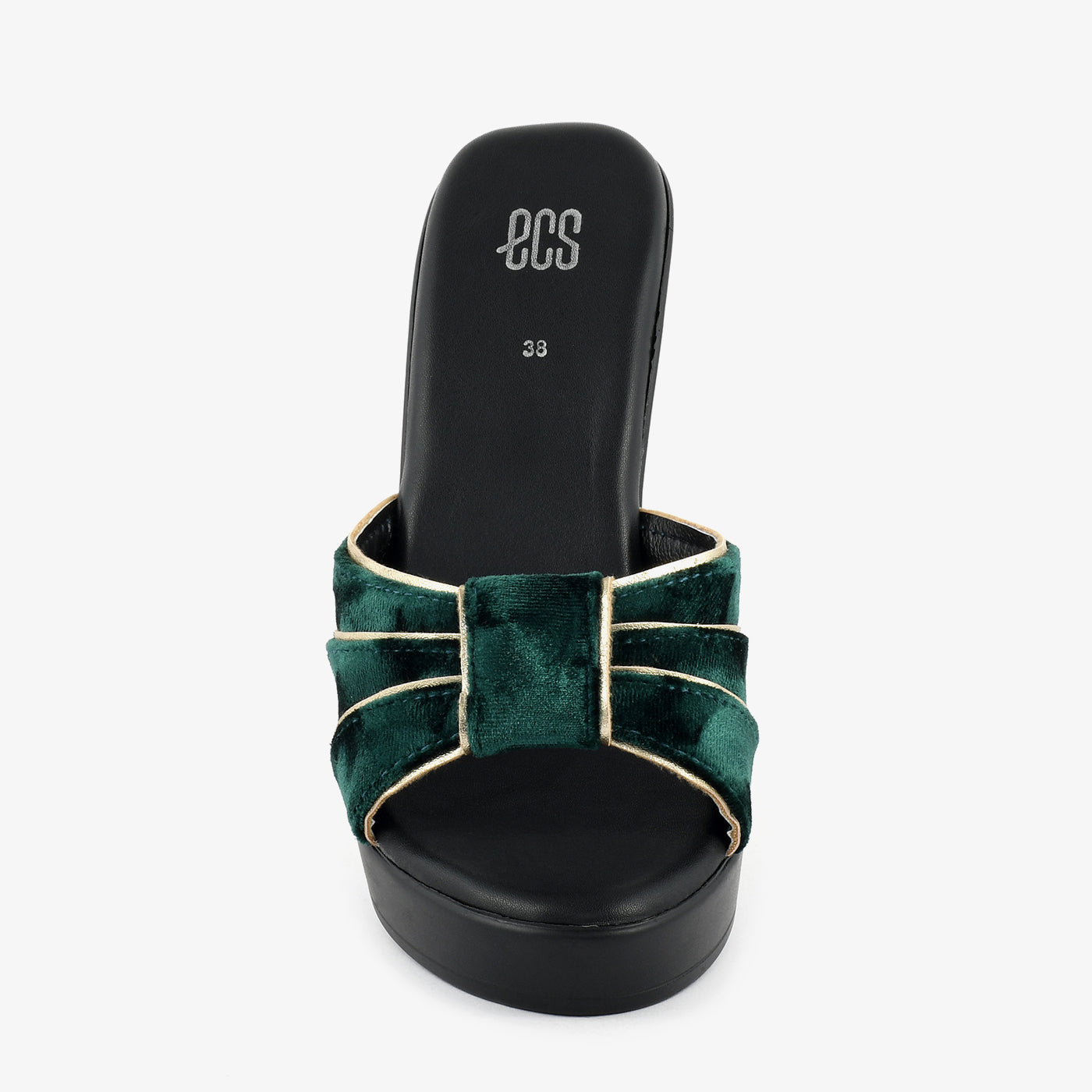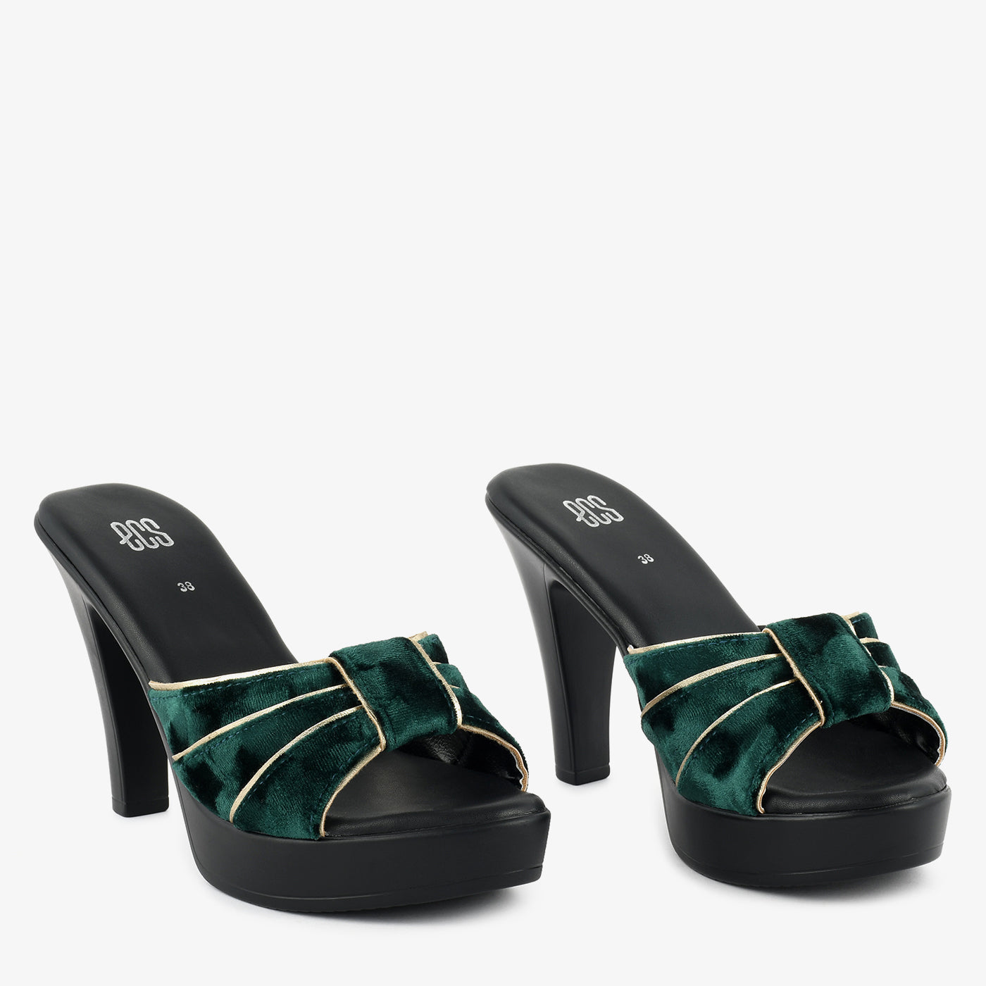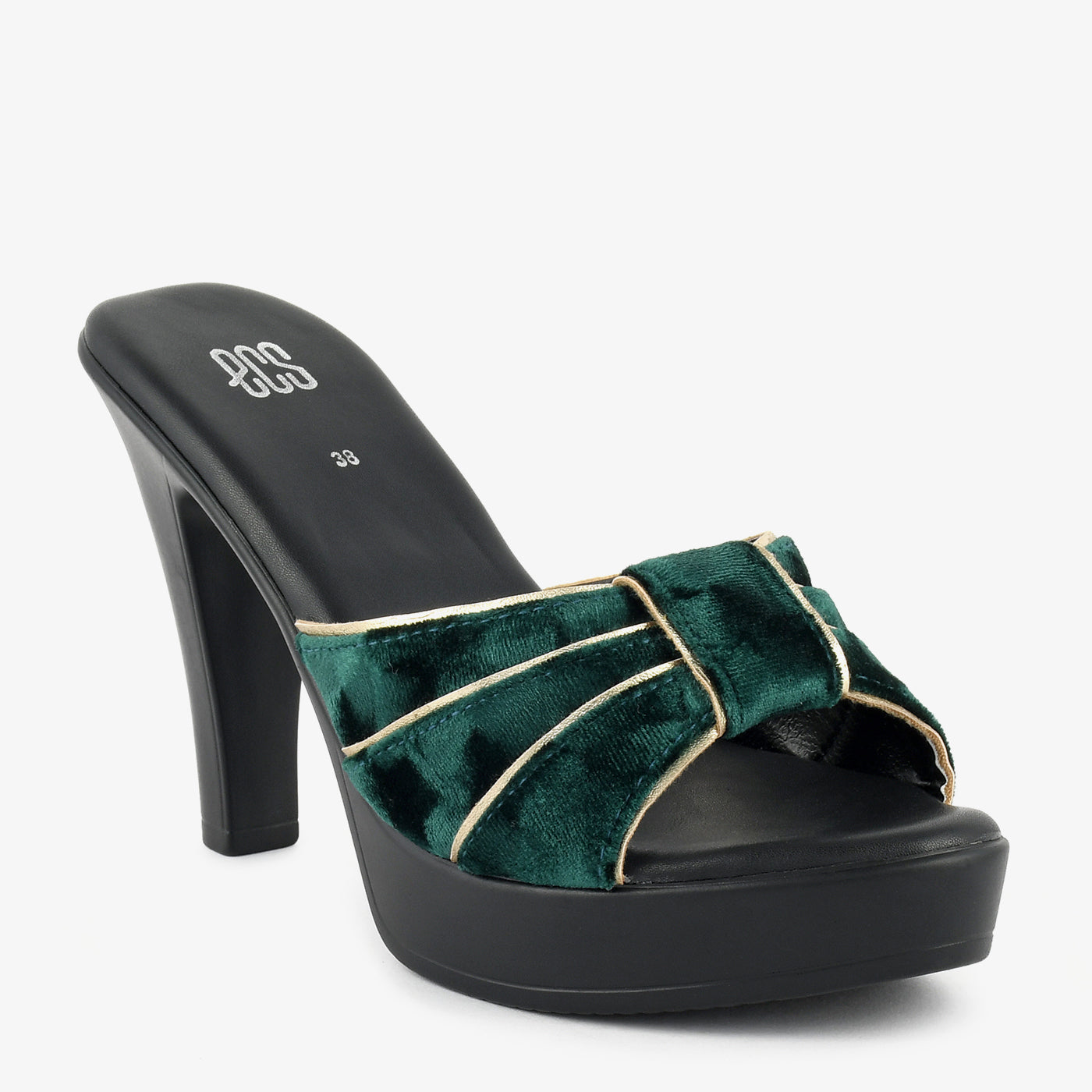 - Design: Wide pleated velvet strap open-toe heel with gold piping detail set on a platform stiletto base
