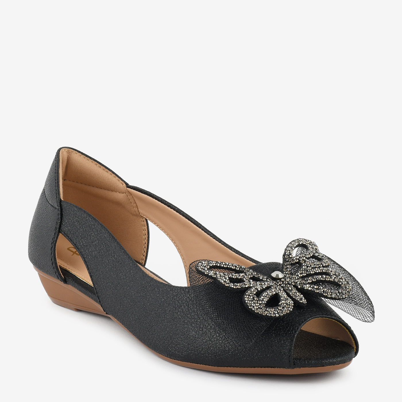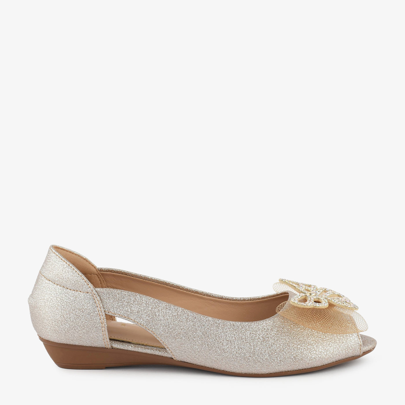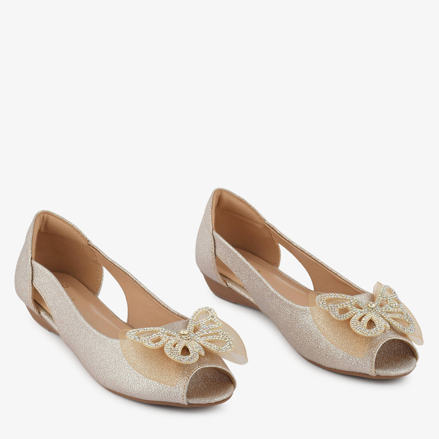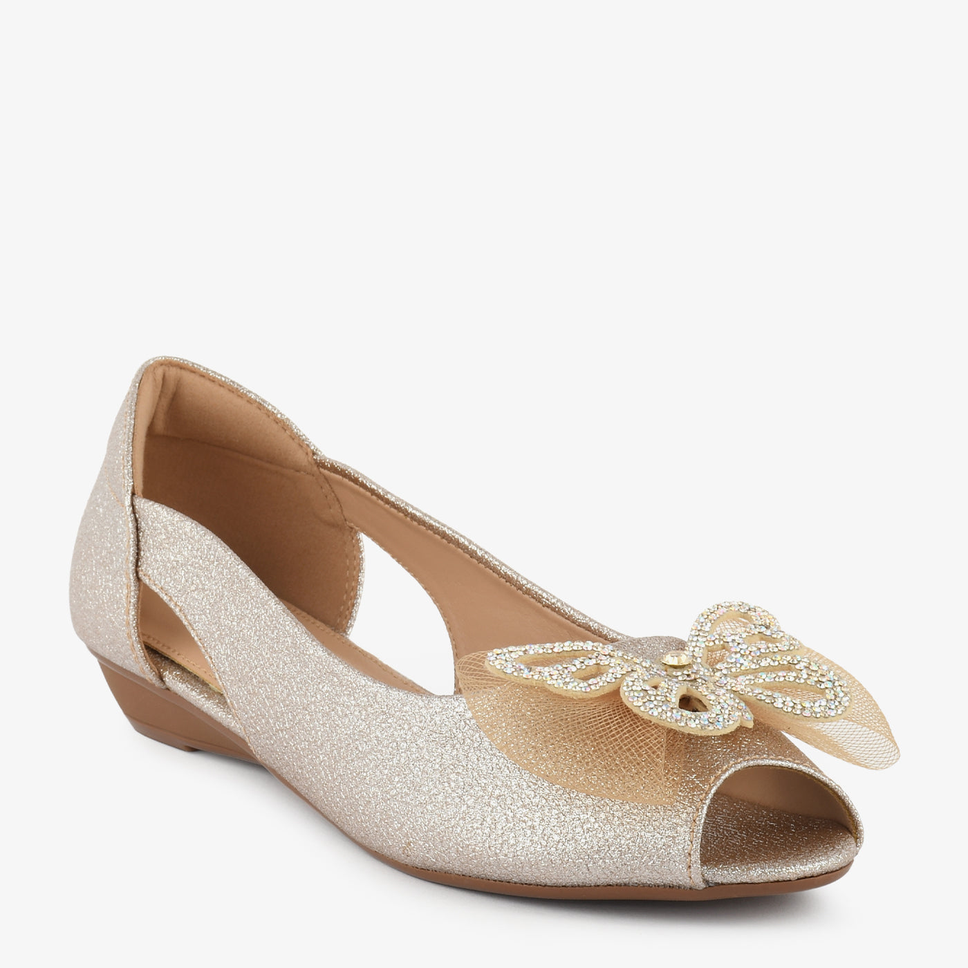 Add a hint of sparkle to your step with the Golden Butterfly Embellished Peep Toe Wedges. Designed with shimmering texture and a stunning butterfly ornament on the front, these wedges bring effortless glamour to any outfit. The side cut-out detail adds a touch of elegance while ensuring breathability and comfort.