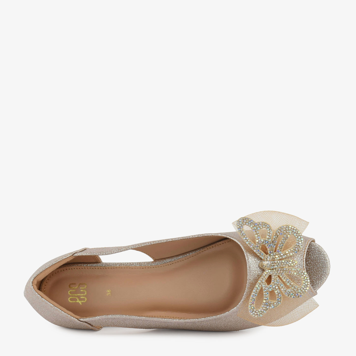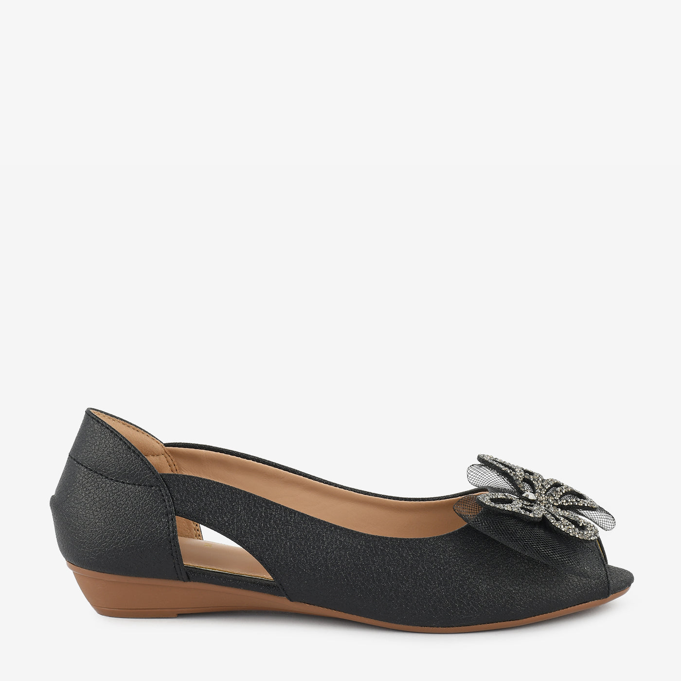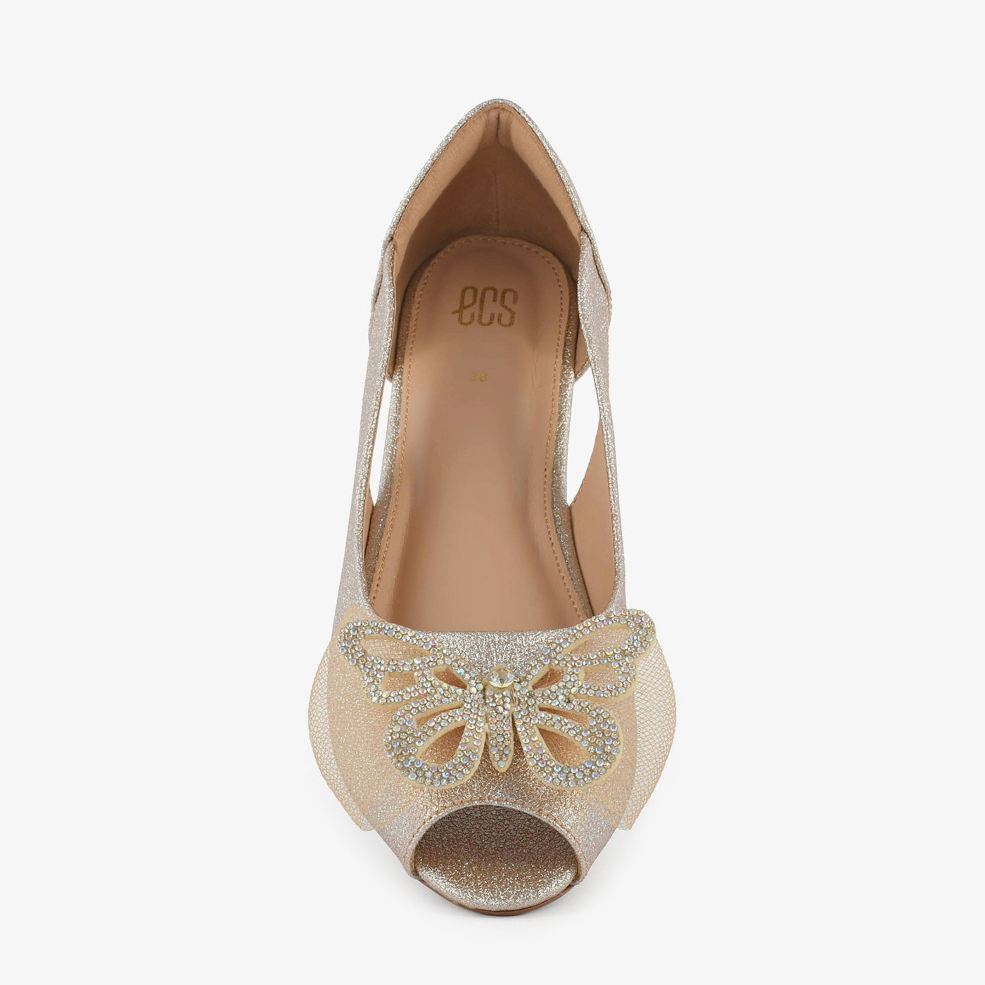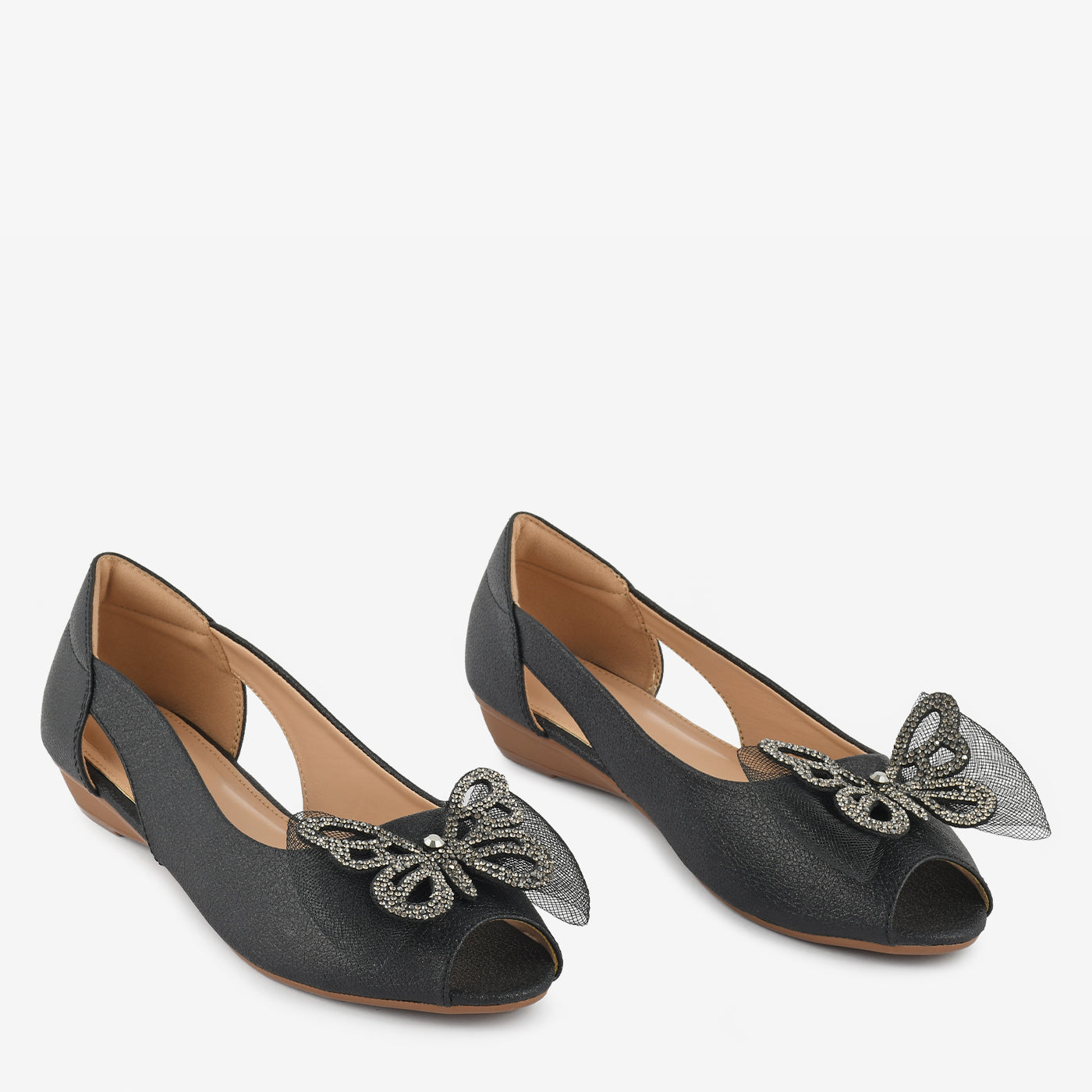 Add a hint of sparkle to your step with the Golden Butterfly Embellished Peep Toe Wedges. Designed with shimmering texture and a stunning butterfly ornament on the front, these wedges bring effortless glamour to any outfit. The side cut-out detail adds a touch of elegance while ensuring breathability and comfort.