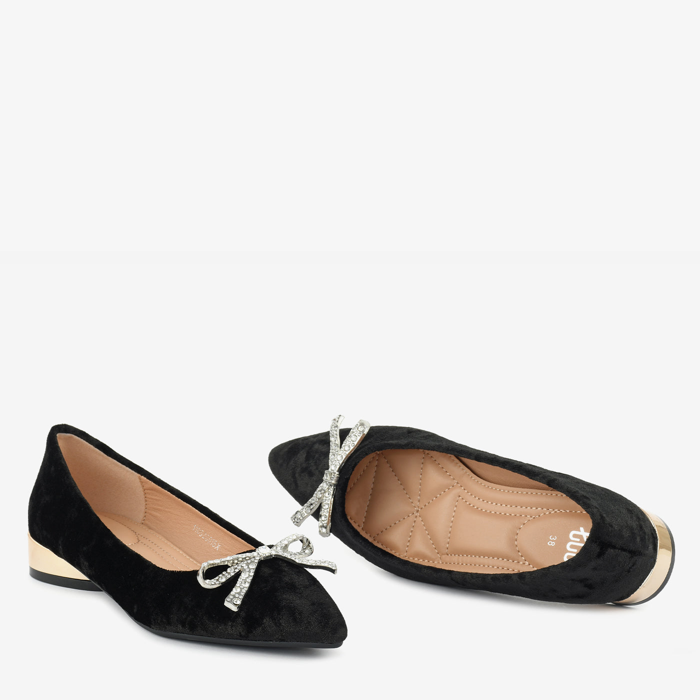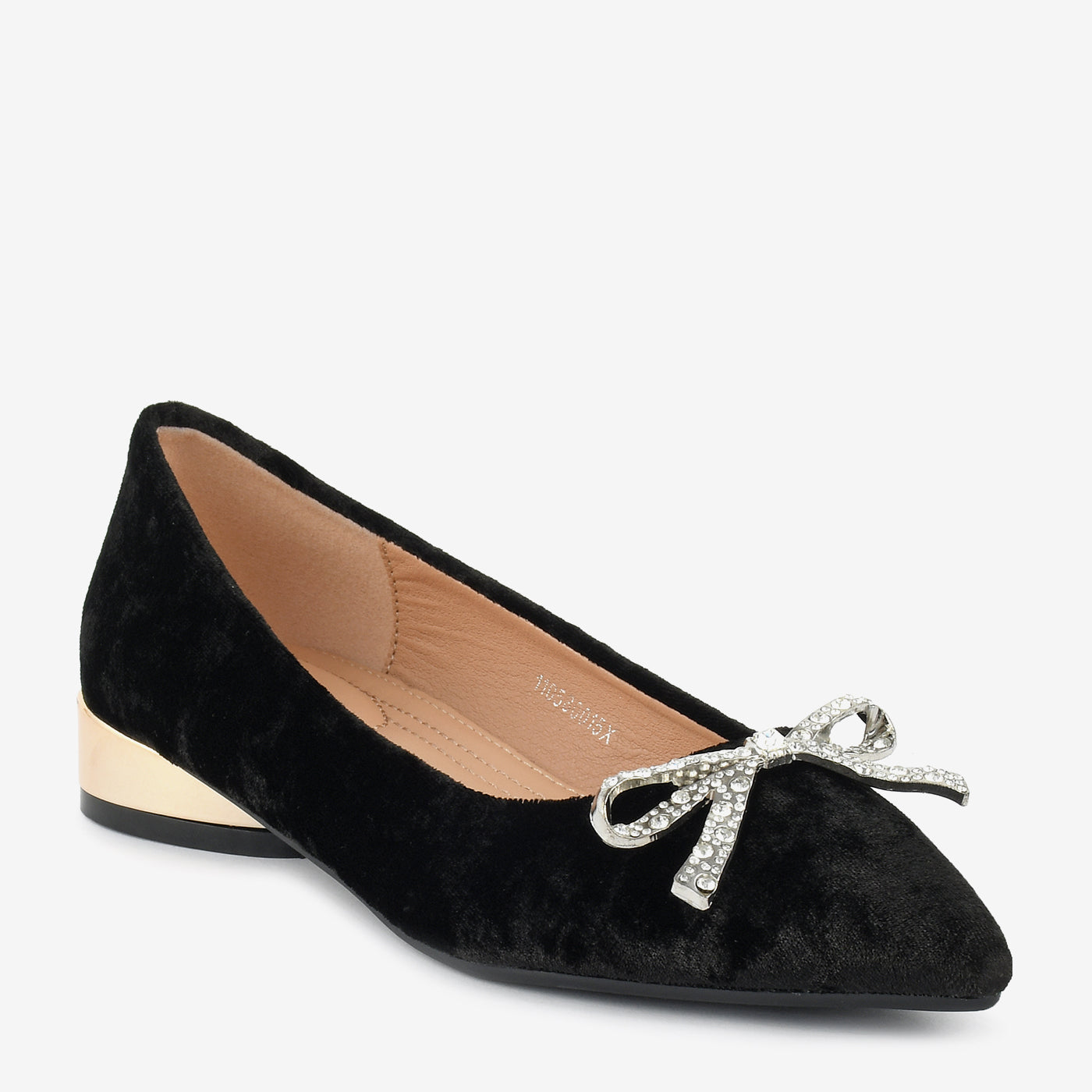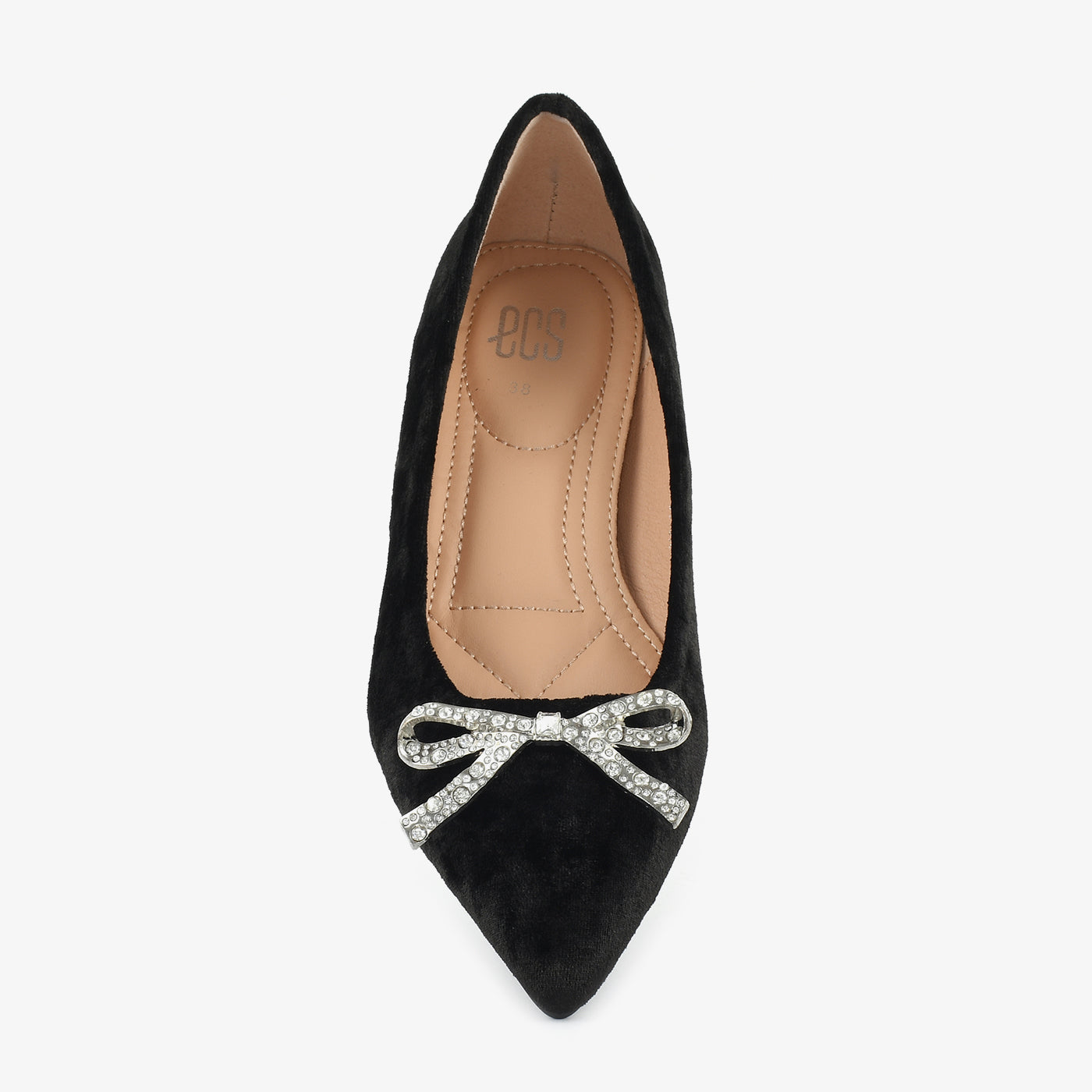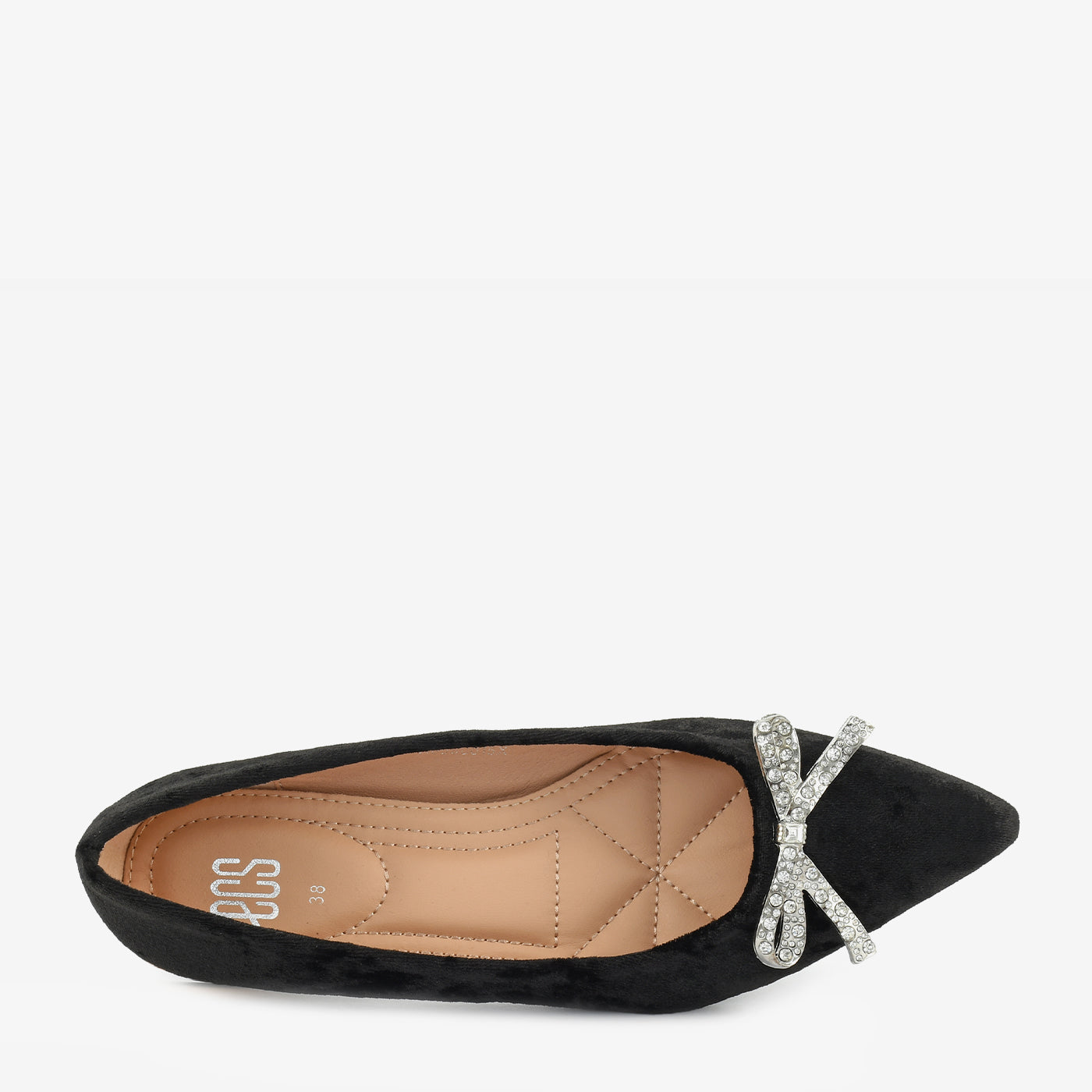 This pointed-toe flat is adorned with a sparkling crystal bow, adding feminine elegance to its sleek design. Lightweight and chic, it makes a graceful option for evenings.