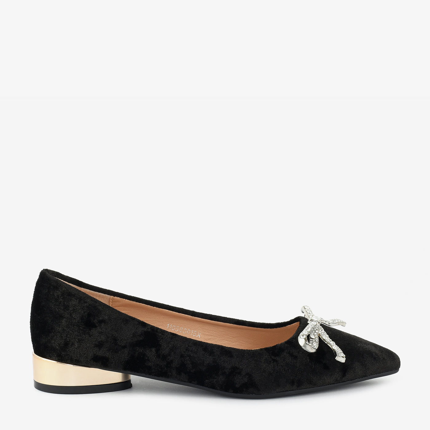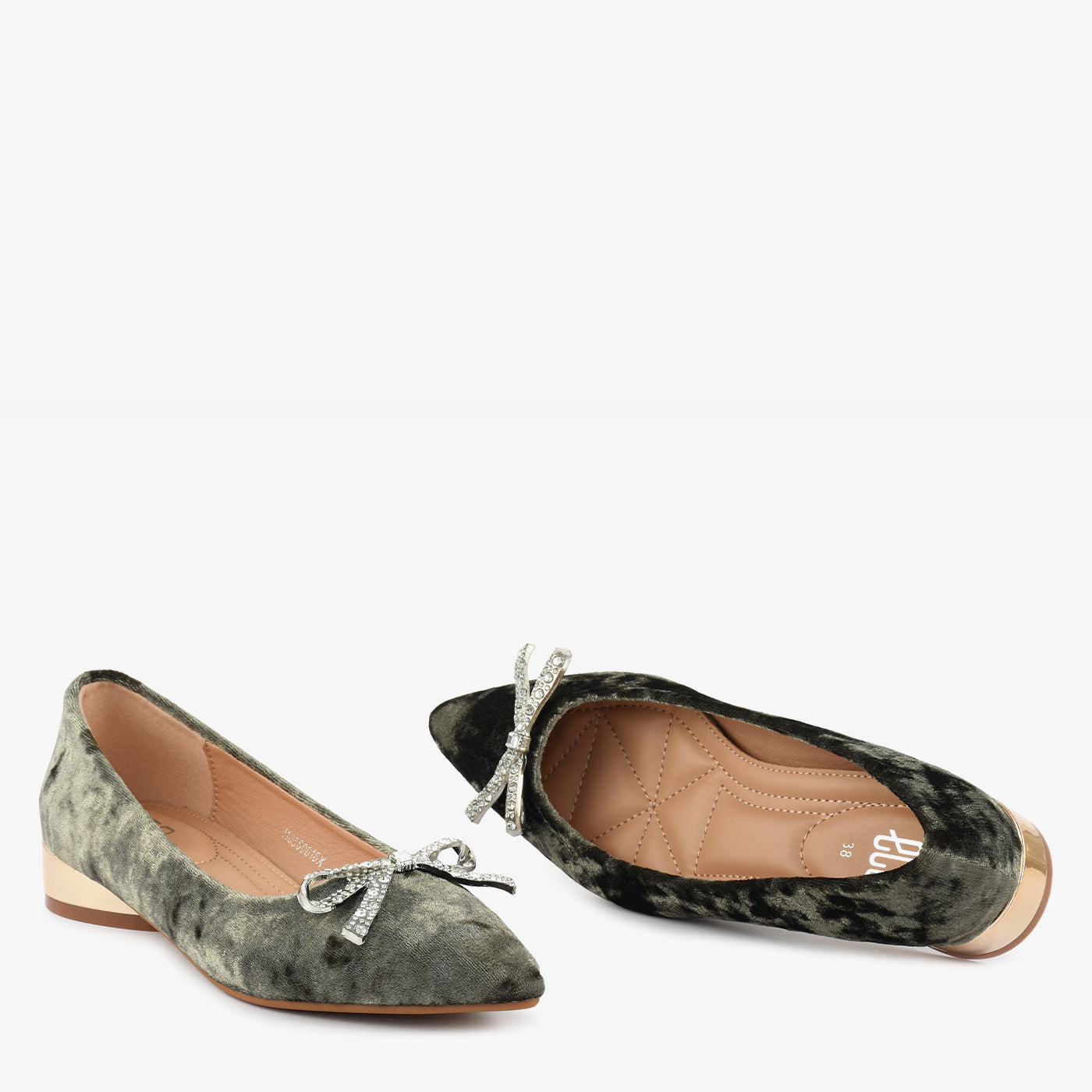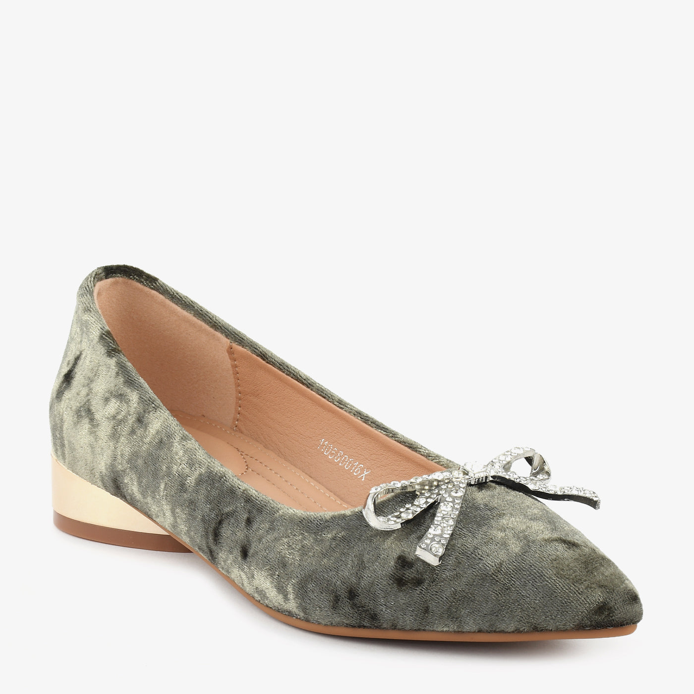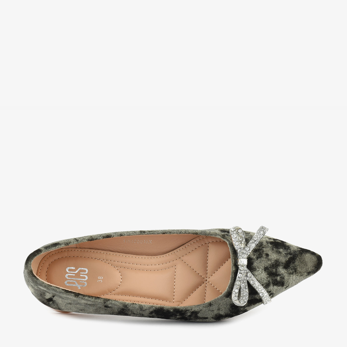 This pointed-toe flat is adorned with a sparkling crystal bow, adding feminine elegance to its sleek design. Lightweight and chic, it makes a graceful option for evenings.