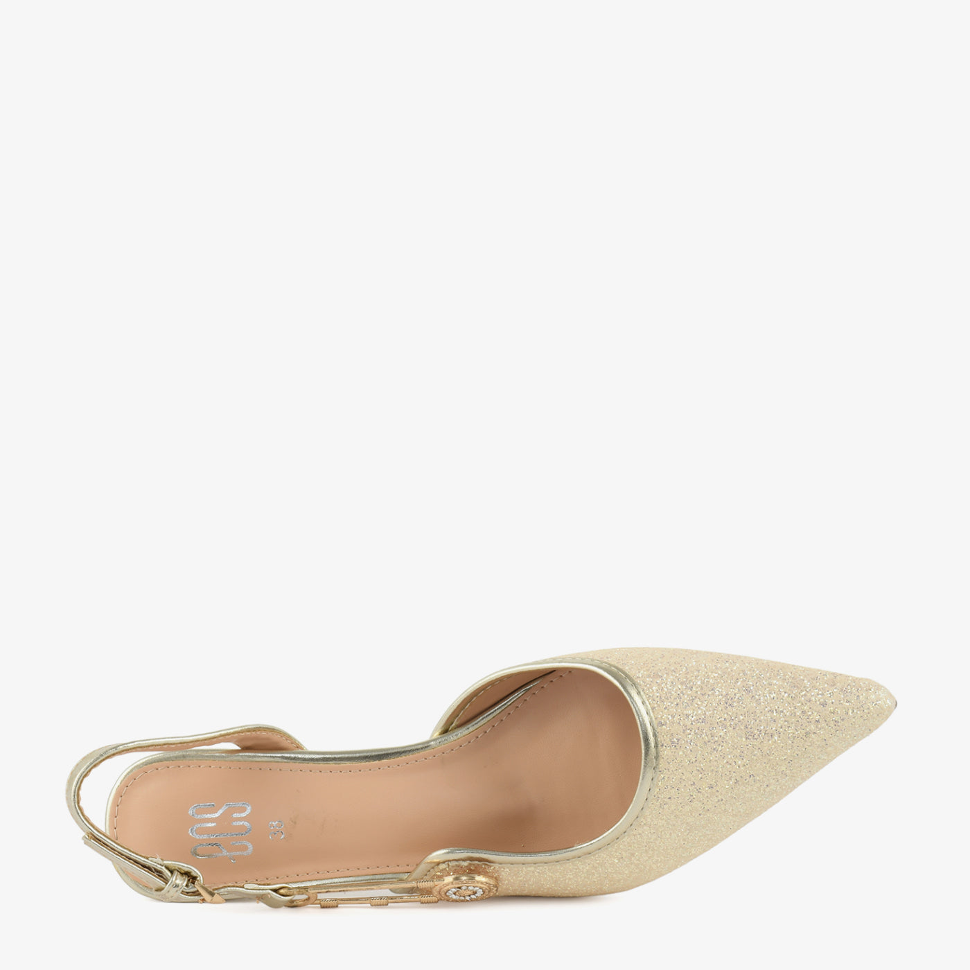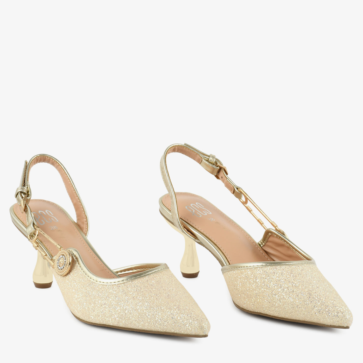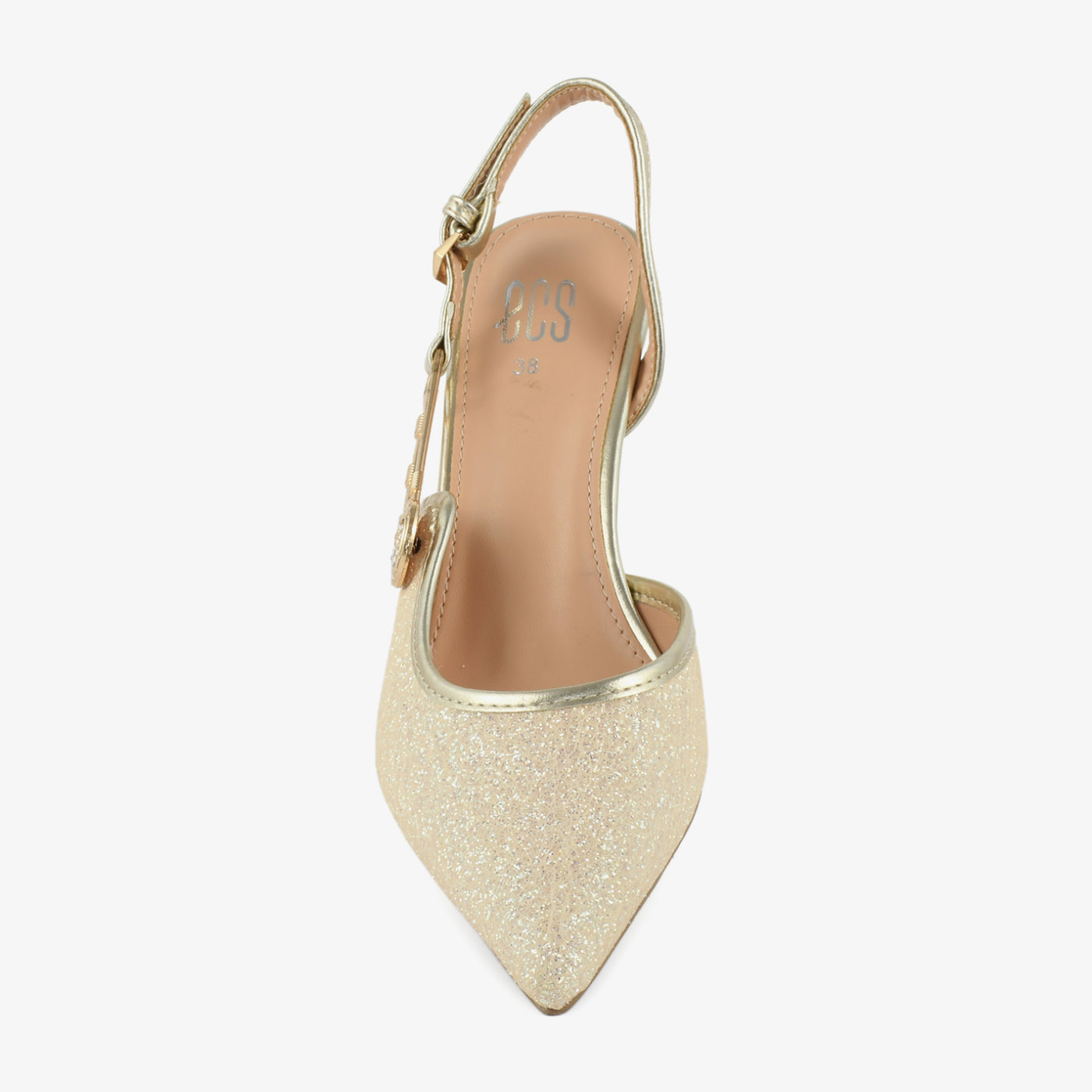 Indulge in pure glamour with these stunning heels. Crafted with a luxurious glitter fabric, these heels exude sophistication. The unique heel design and slingback strap offer a glamorous and stylish look.