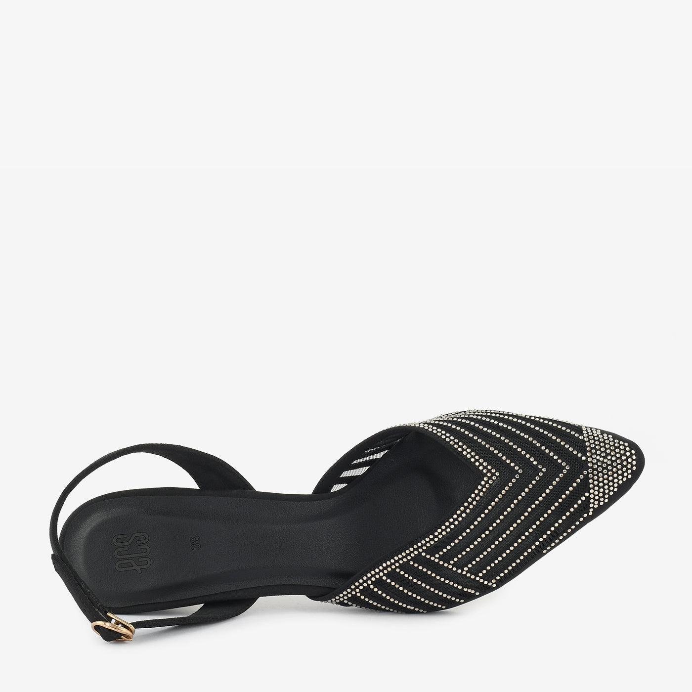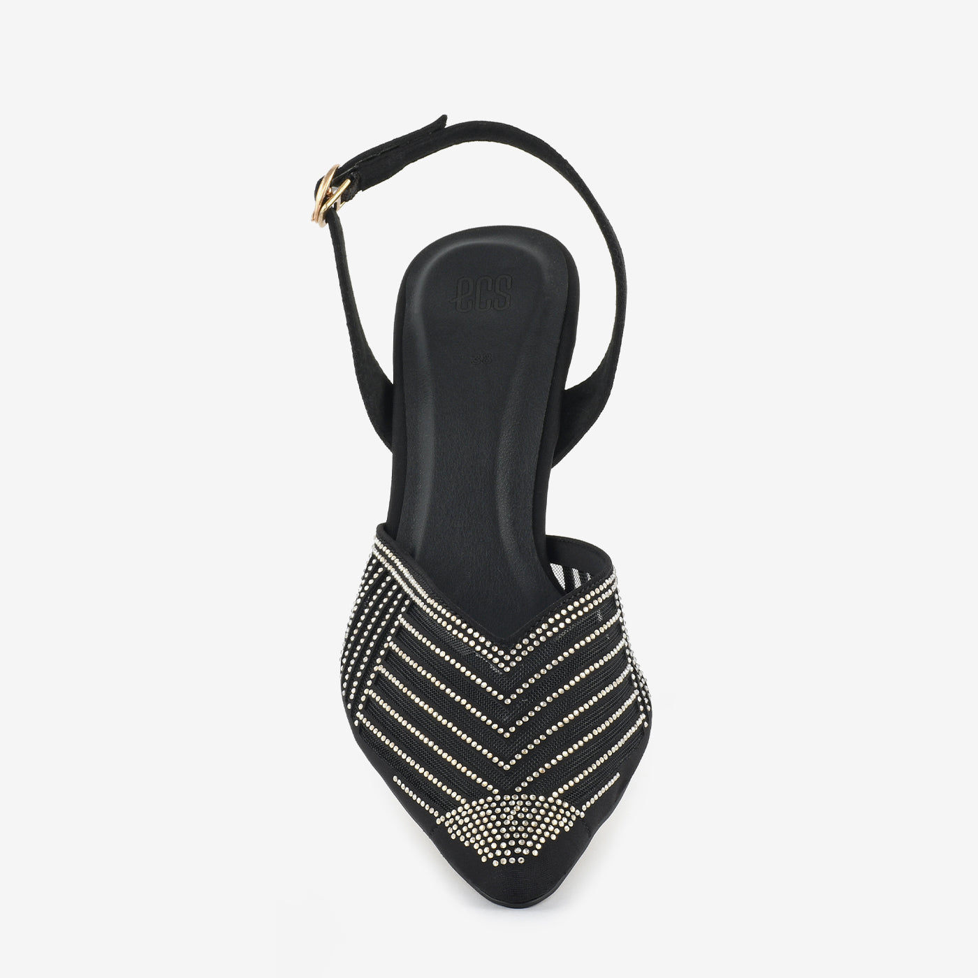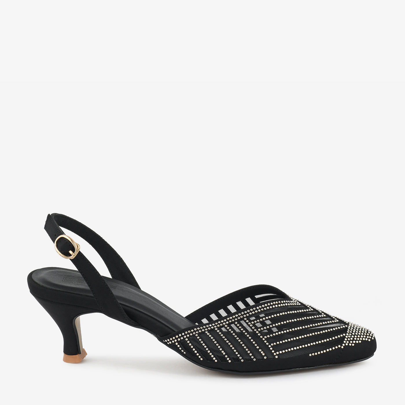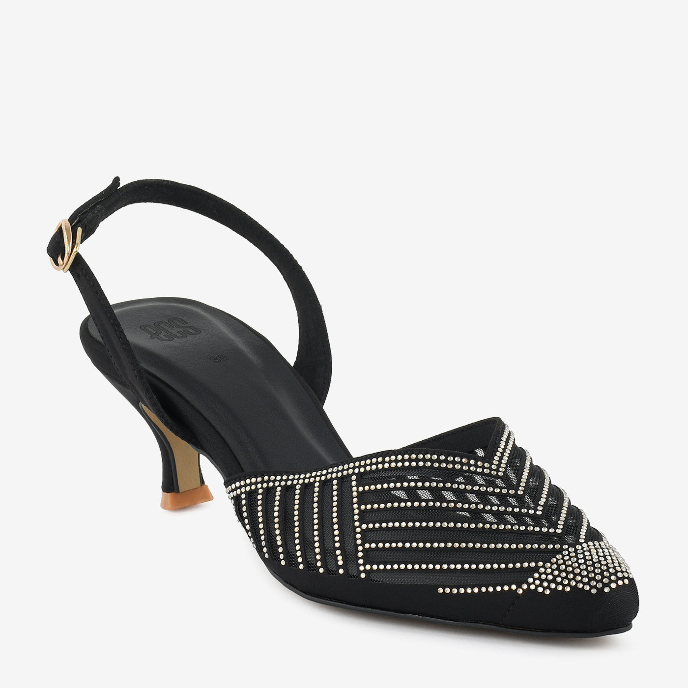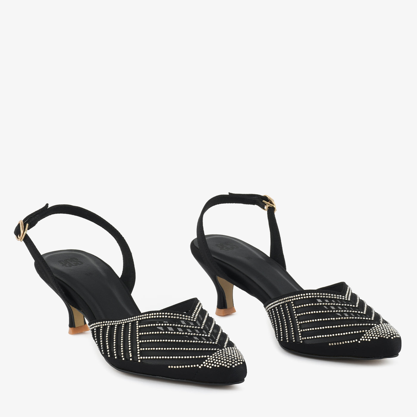 A sleek black sandal adorned with metallic studs for modern sophistication. The open-back design and pointed toe lend a refined yet edgy charm. Crafted for comfort, it transitions seamlessly from daywear to evening looks.