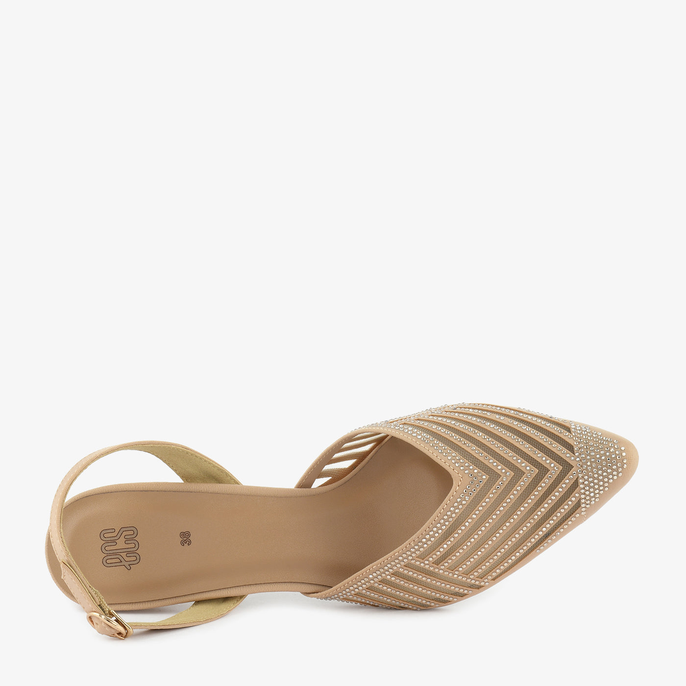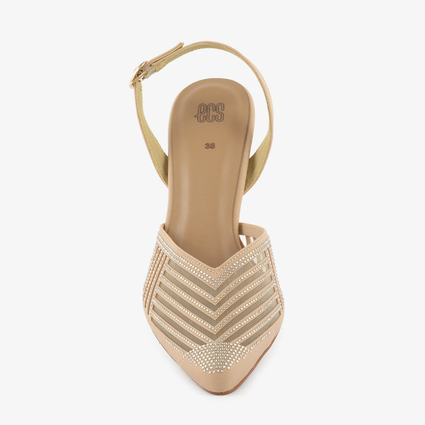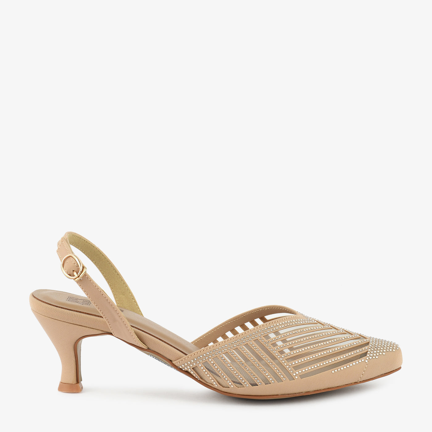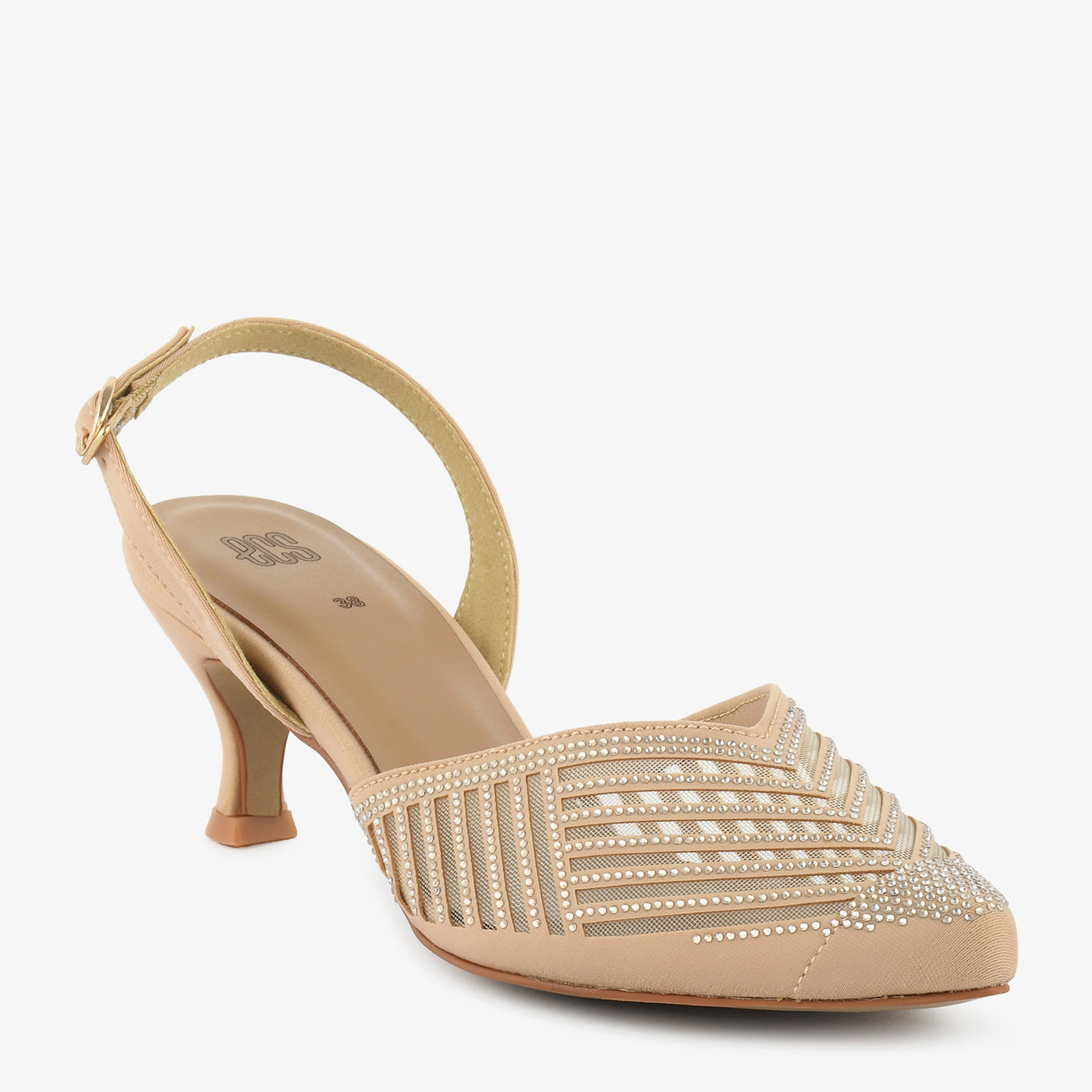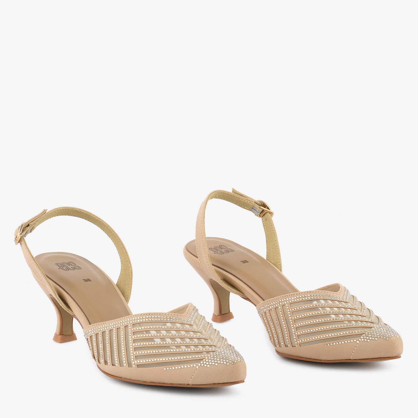 A sleek black sandal adorned with metallic studs for modern sophistication. The open-back design and pointed toe lend a refined yet edgy charm. Crafted for comfort, it transitions seamlessly from daywear to evening looks.