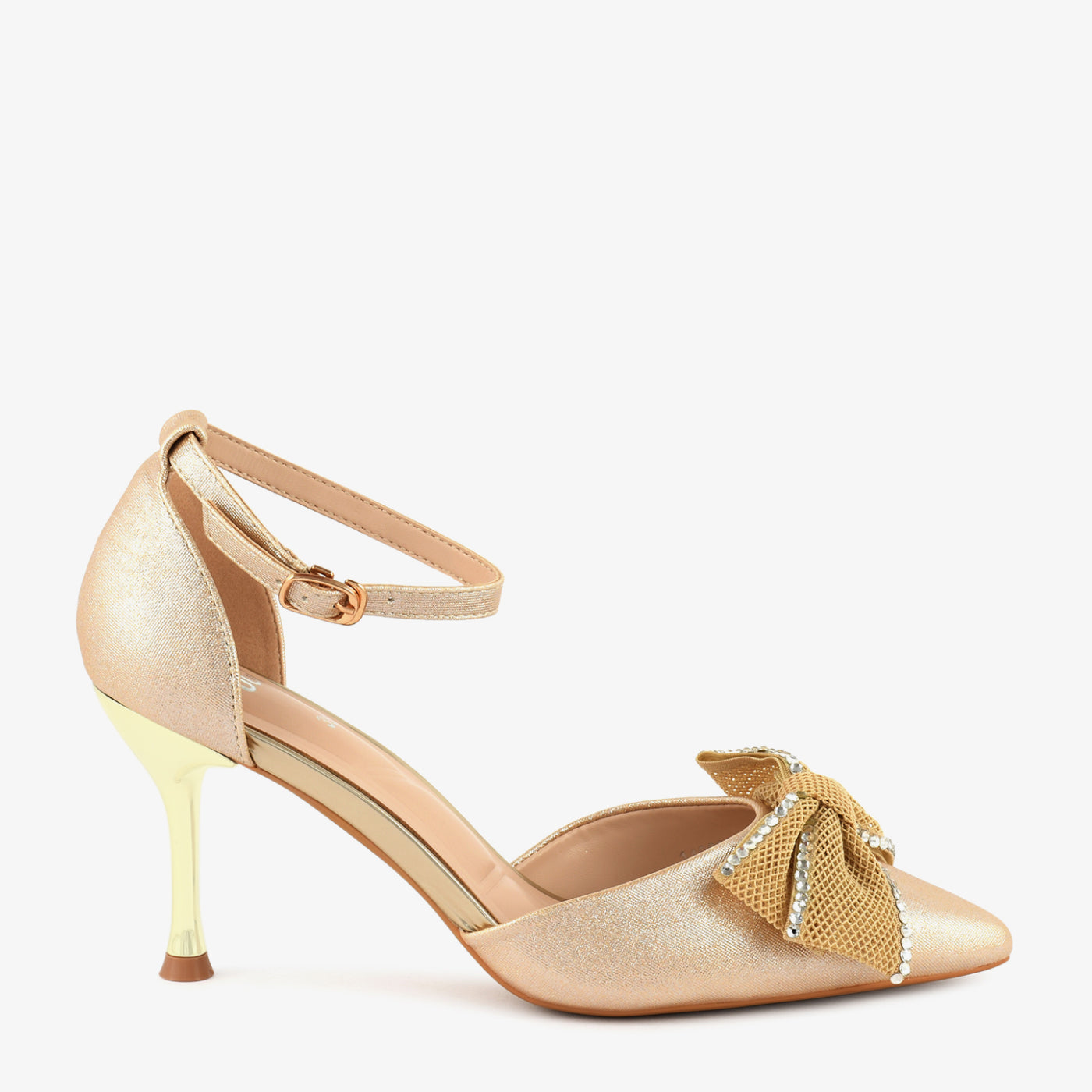 A stunning coat shoe with a luminous finish and metallic ankle strap for secure, glamorous wear. The oversized bow detailing adds drama while the pointed toe keeps it sophisticated. Ideal for receptions, formal nights, and bridal festivities. Comfortable mid heel makes it a standout yet wearable option for long events.
