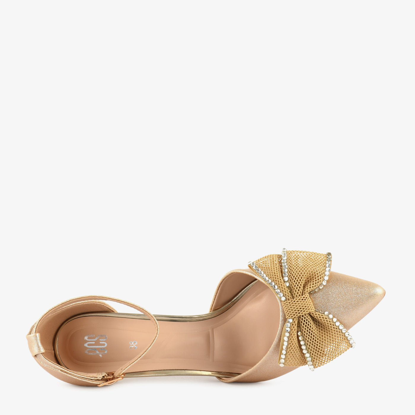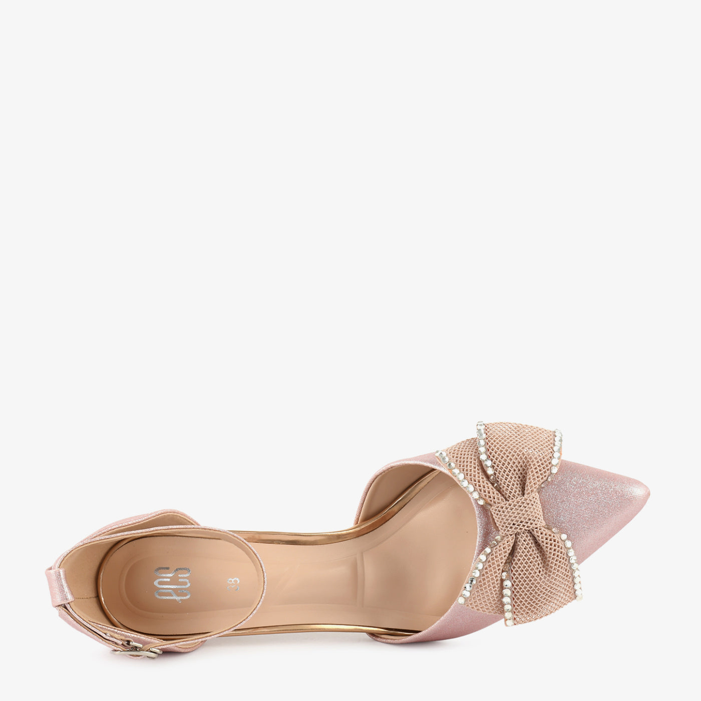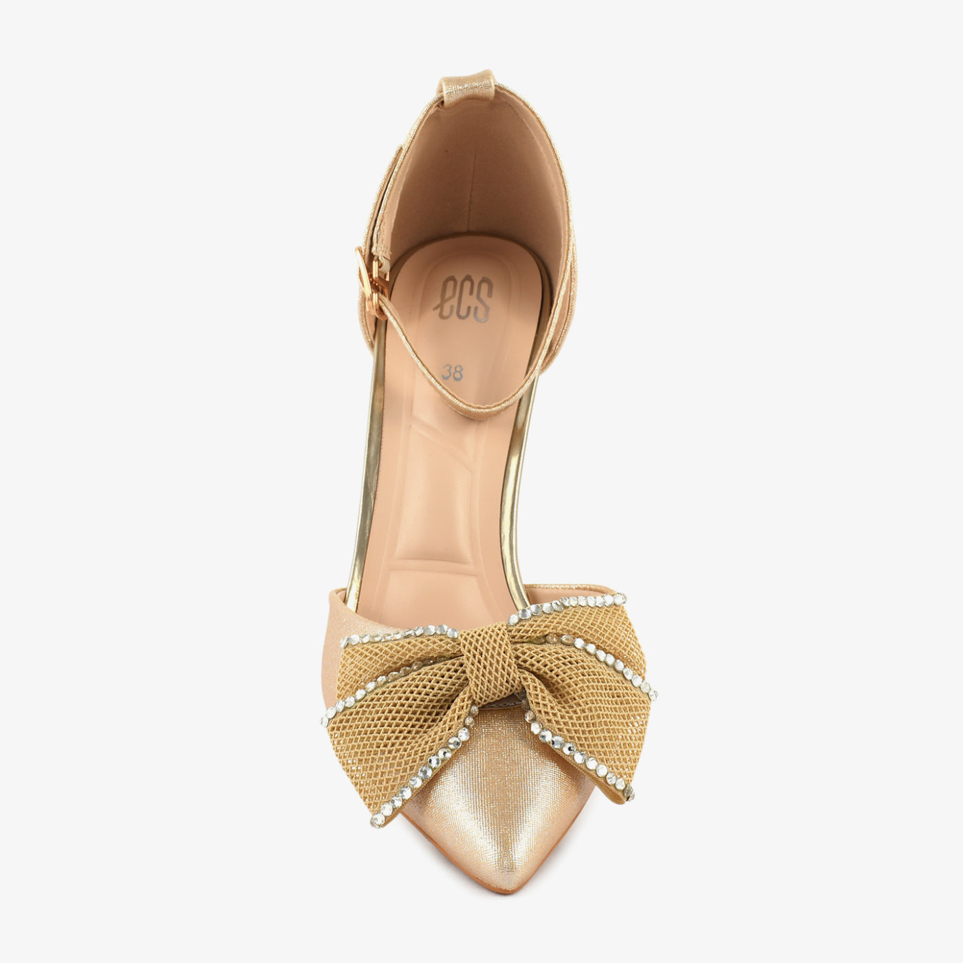 - Design: Ankle-strap pointed coat shoe with embellished bow
