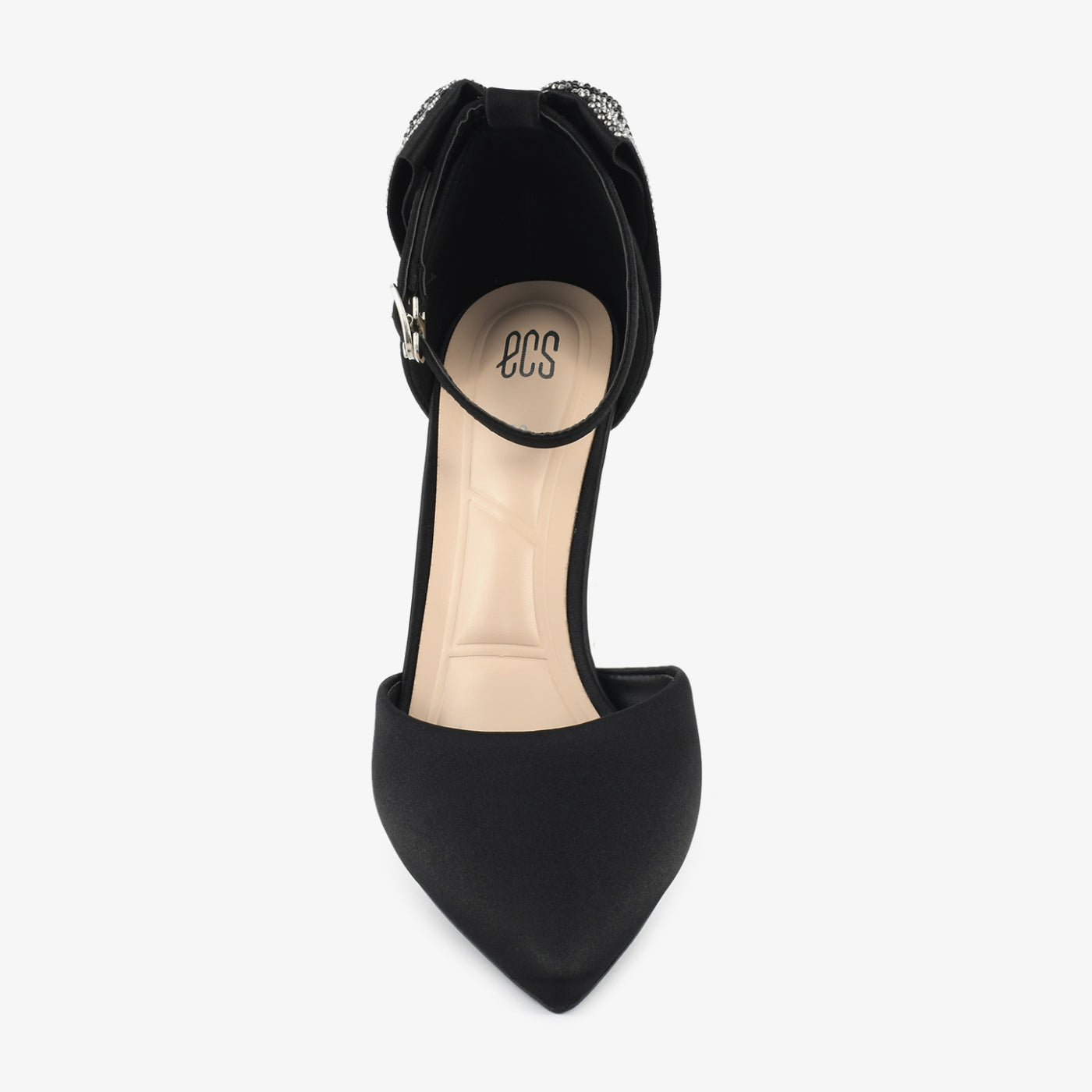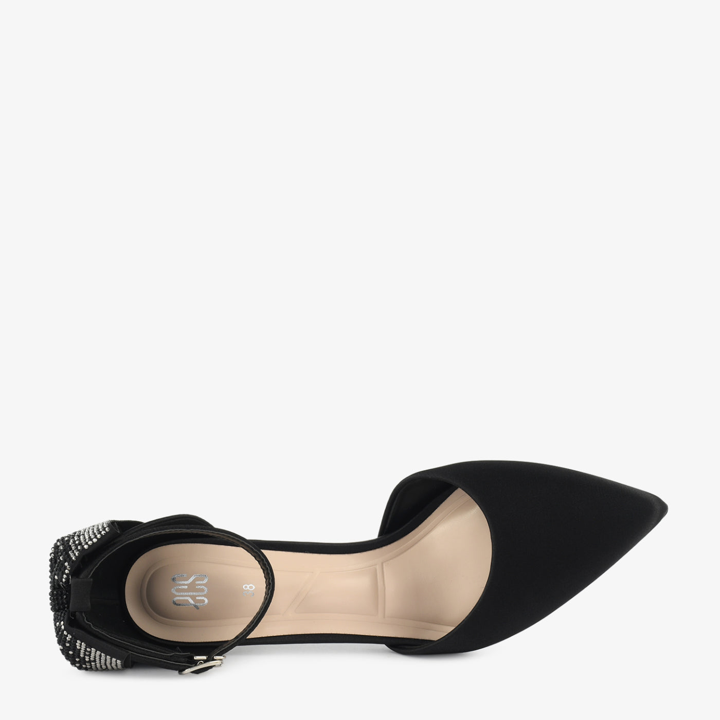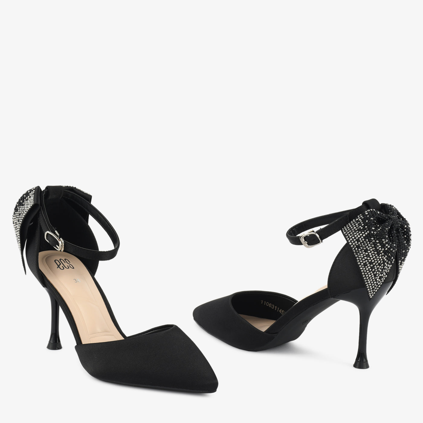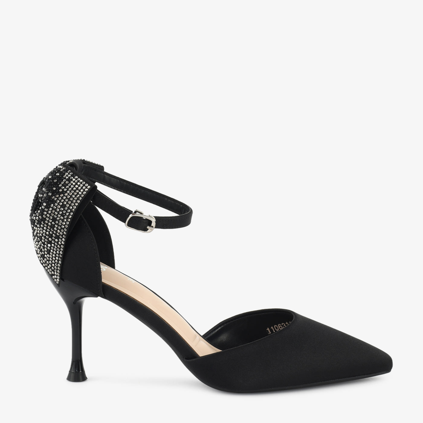 - Design: Ankle-strap pointed coat shoe with rhinestone detail