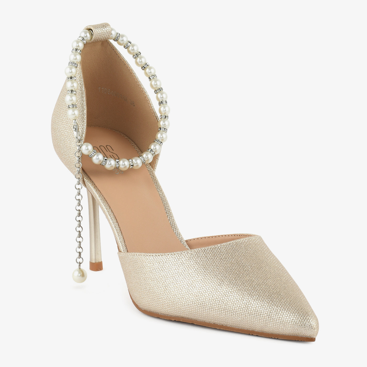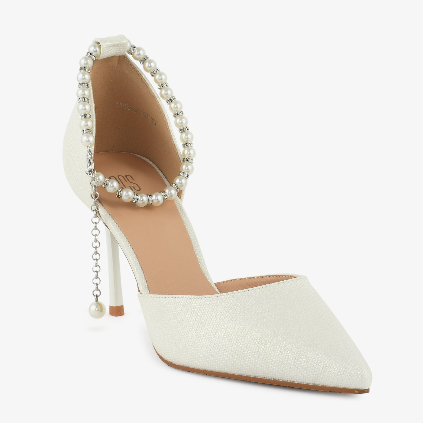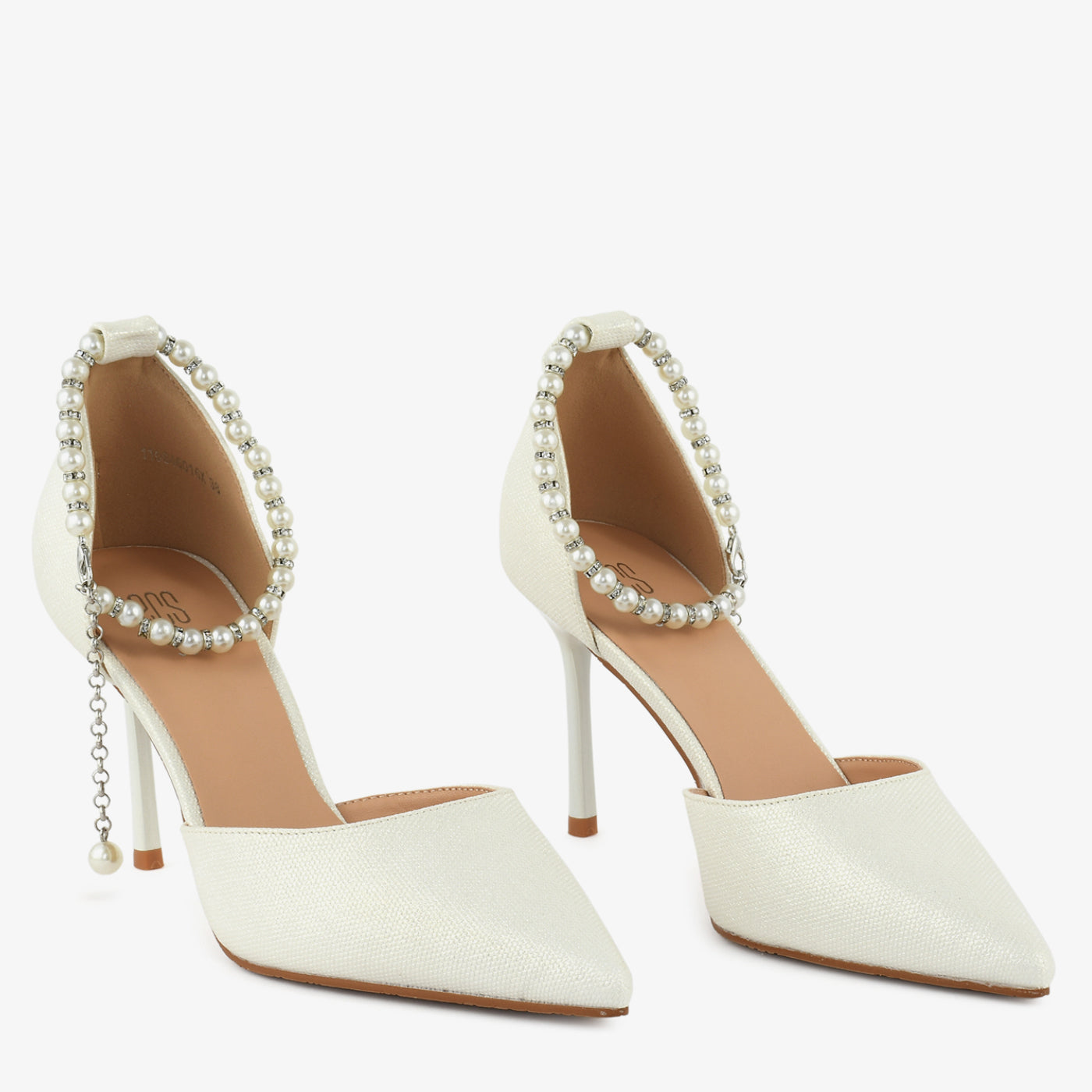 Elevate your elegance with the Aurora Pearl Ankle Strap Heels. Designed with a shimmering textured finish and a statement pearl-embellished ankle strap, these heels bring glamour and grace to any look. The pointed toe and slim stiletto heel create a sleek silhouette, perfect for evening events or special occasions.