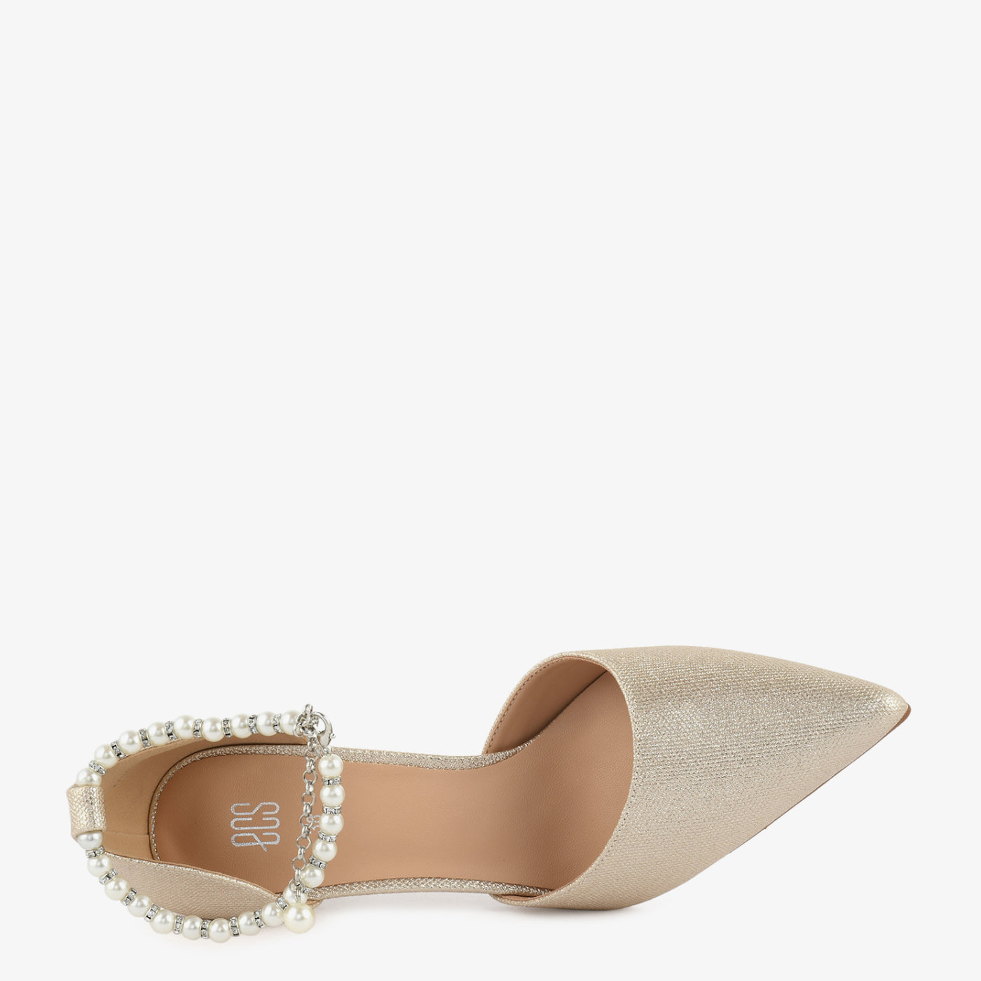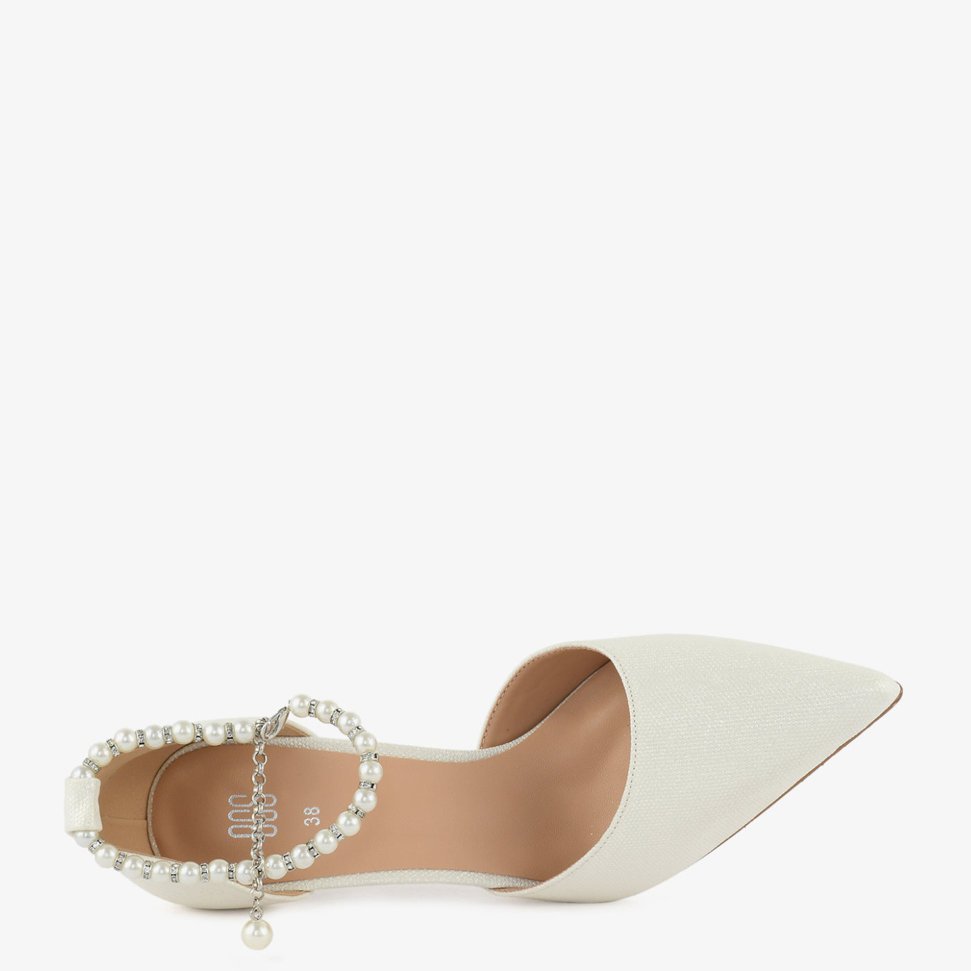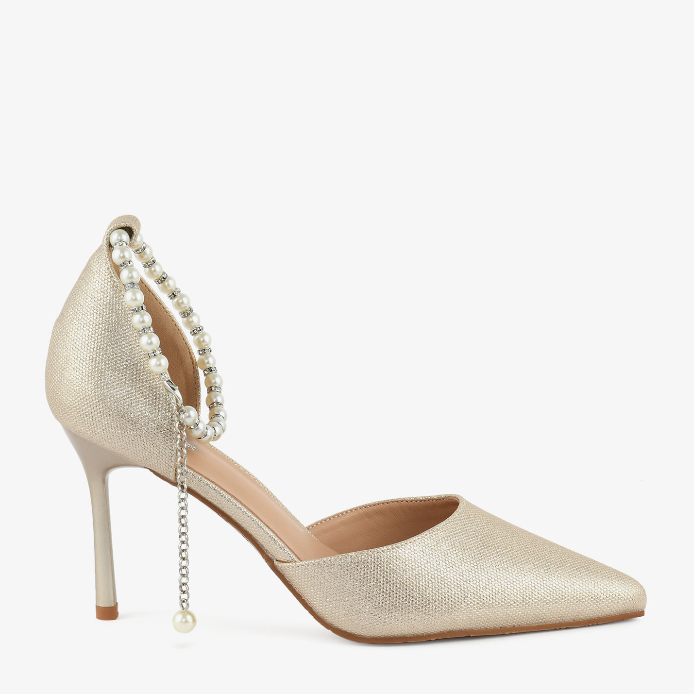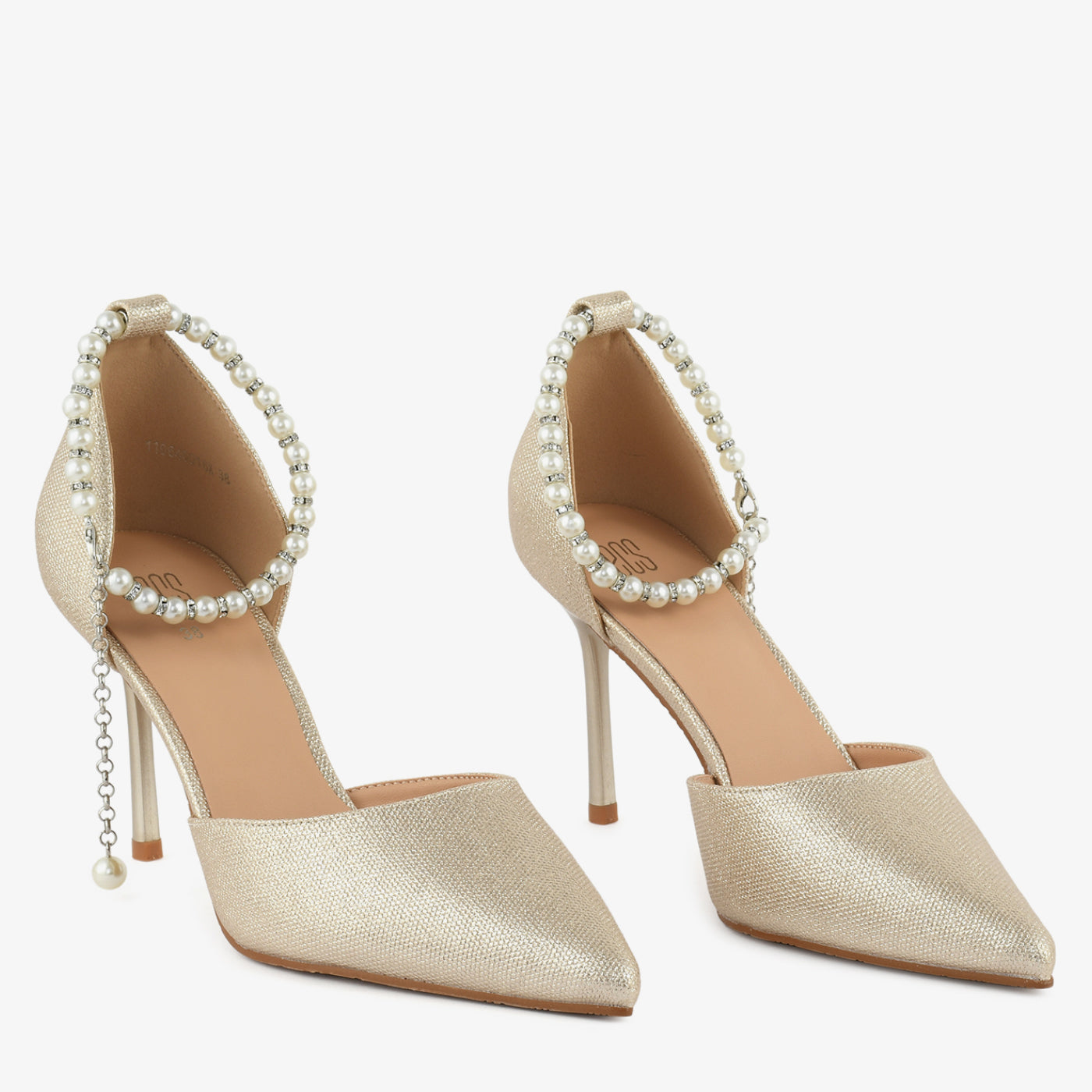 Elevate your elegance with the Aurora Pearl Ankle Strap Heels. Designed with a shimmering textured finish and a statement pearl-embellished ankle strap, these heels bring glamour and grace to any look. The pointed toe and slim stiletto heel create a sleek silhouette, perfect for evening events or special occasions.