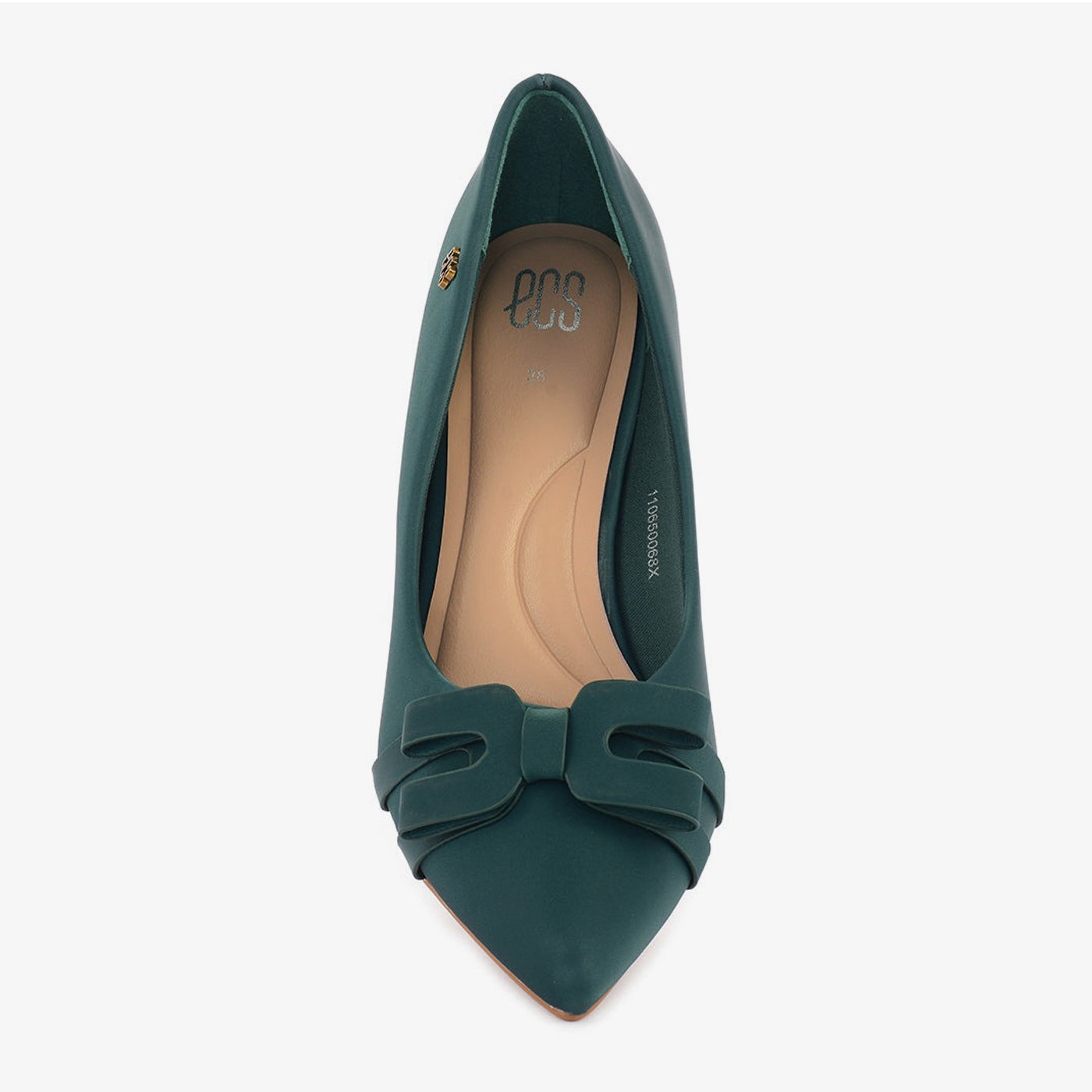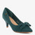 An elegant pump in a deep green hue, featuring a pointed toe and a stylish bow detail. The low kitten heel makes it a comfortable and sophisticated choice.