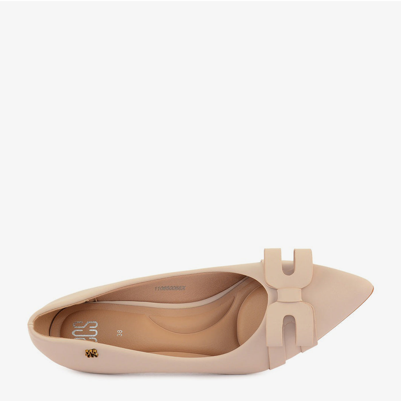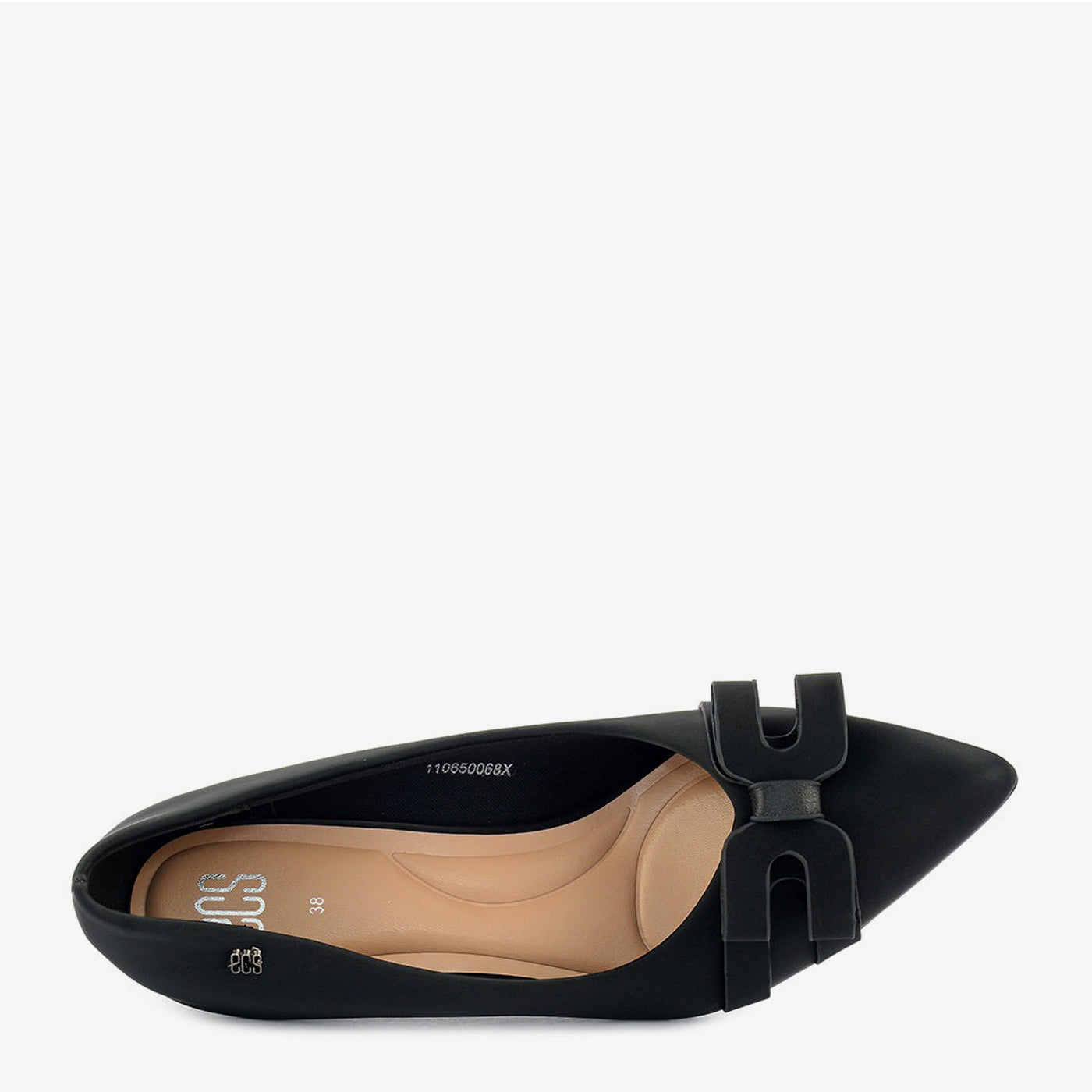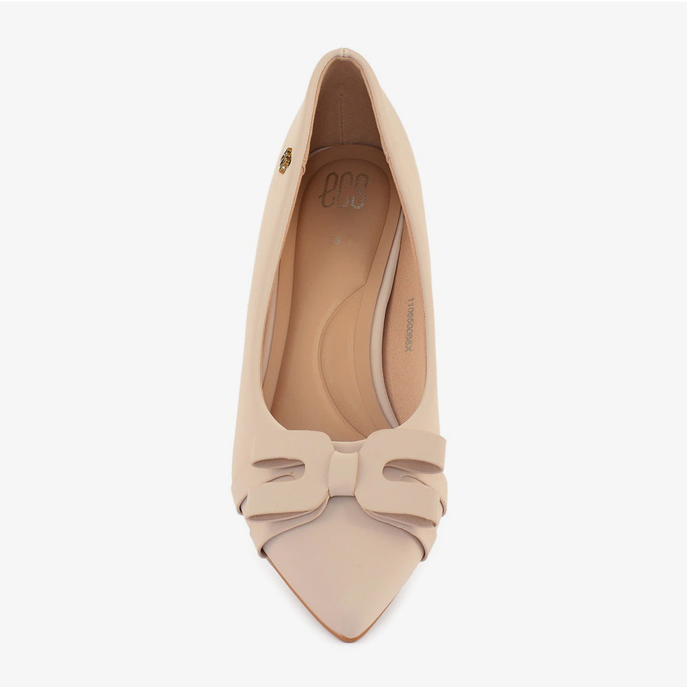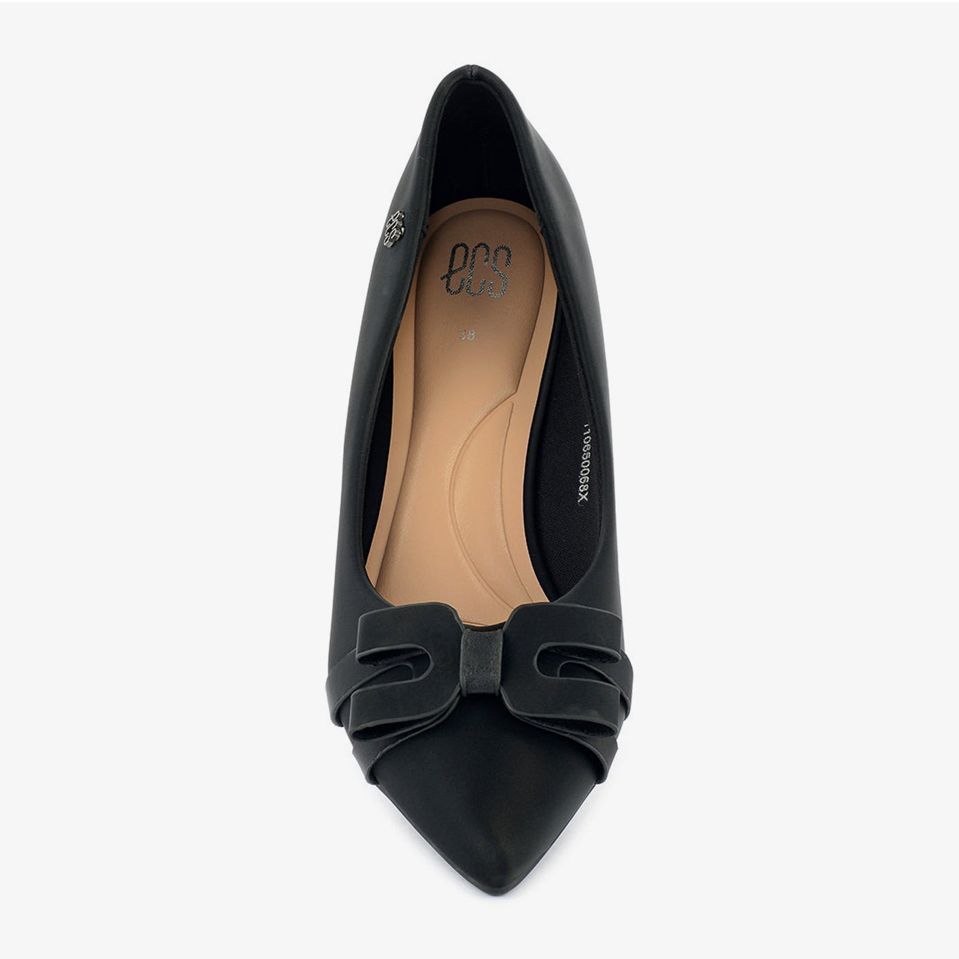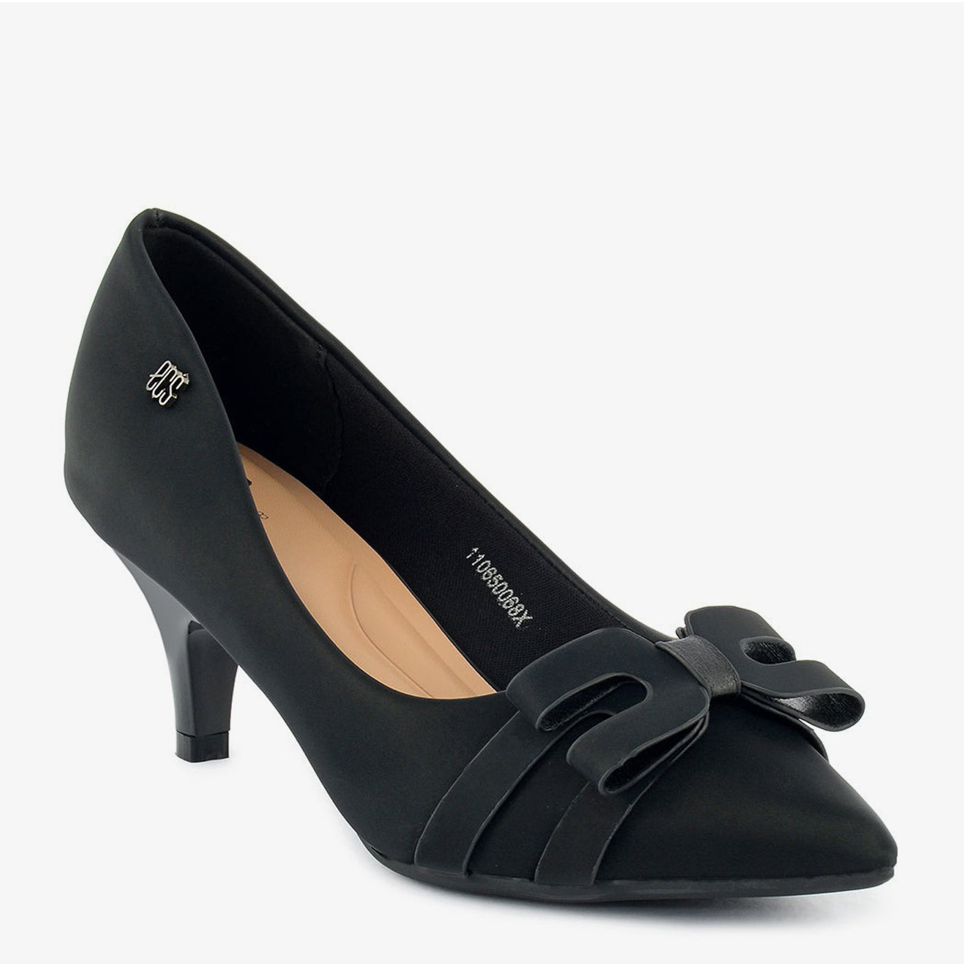 - Design: Pointed-toe pump with a low kitten heel and bow detail