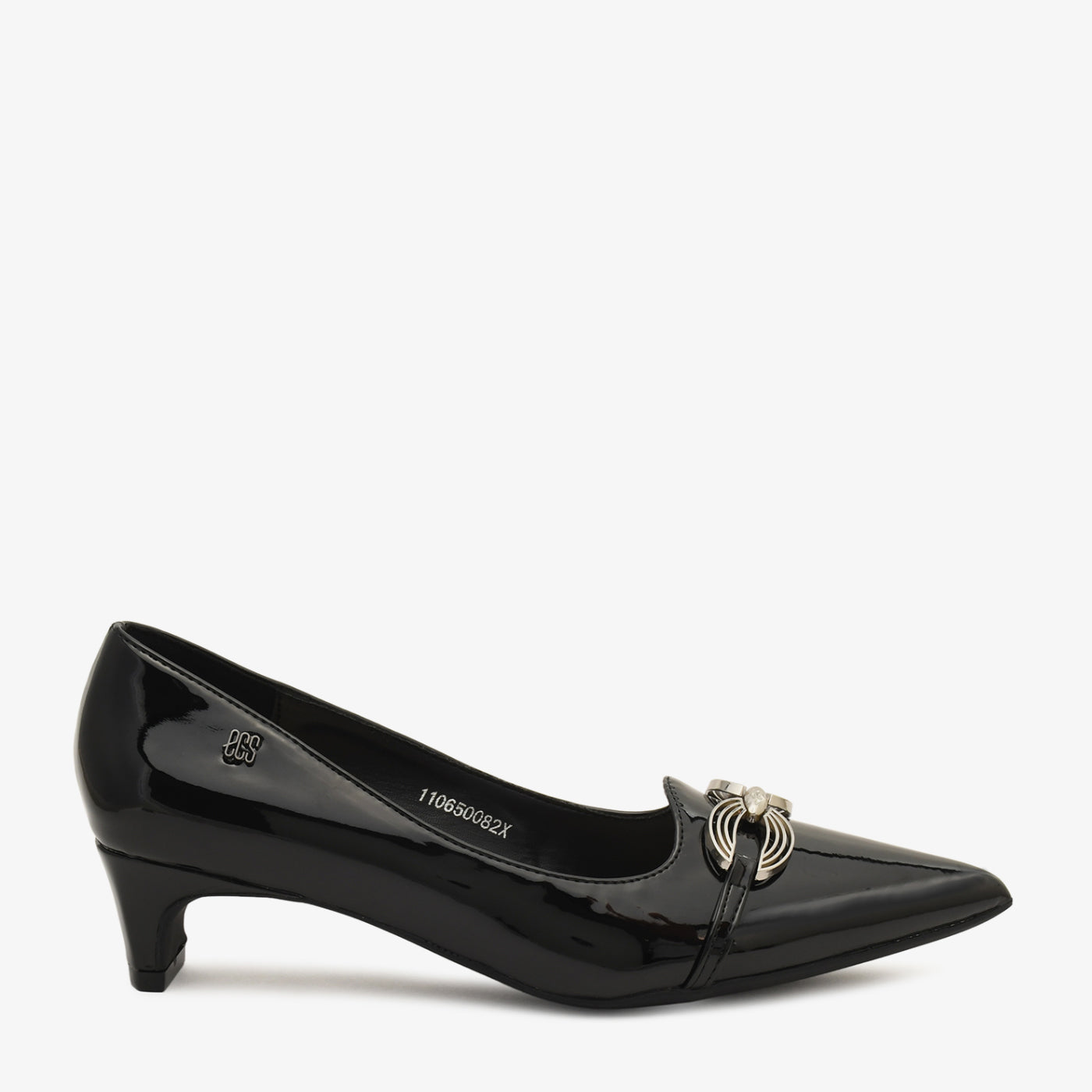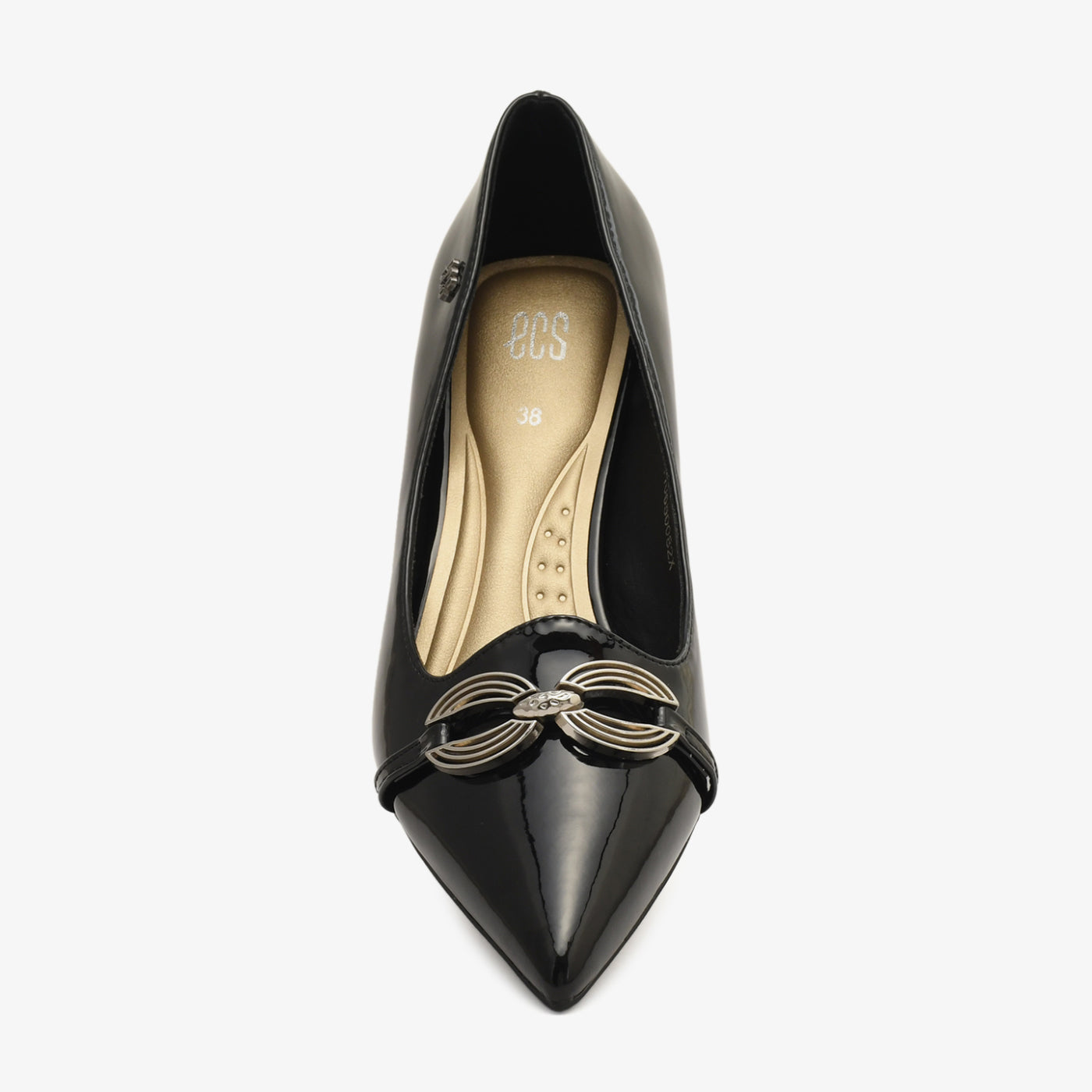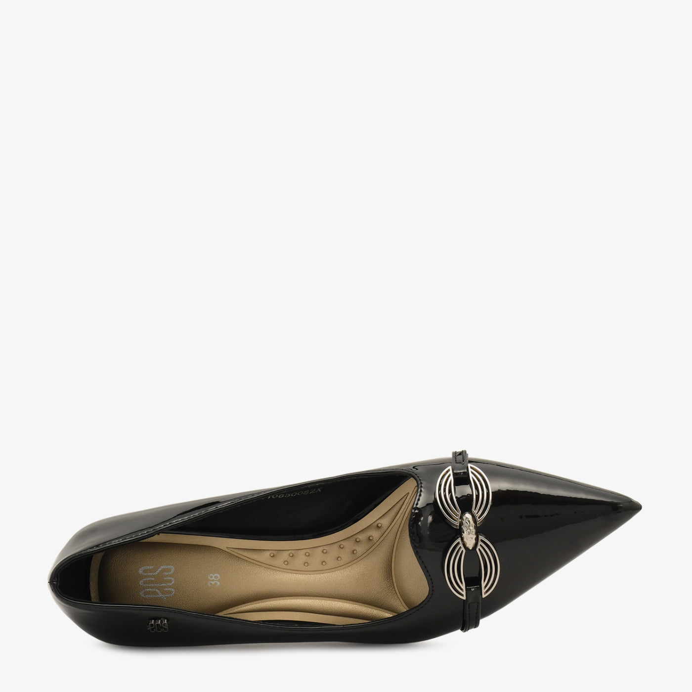 A glossy coat shoe detailed with a sleek metallic ornament, giving it a minimal yet luxe appearance. Its pointed design ensures a refined, elongated look.