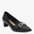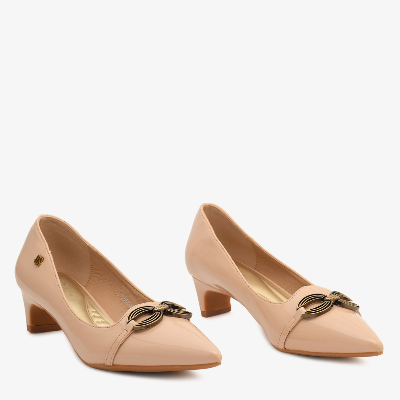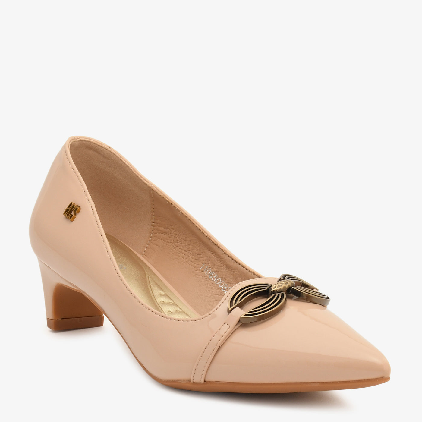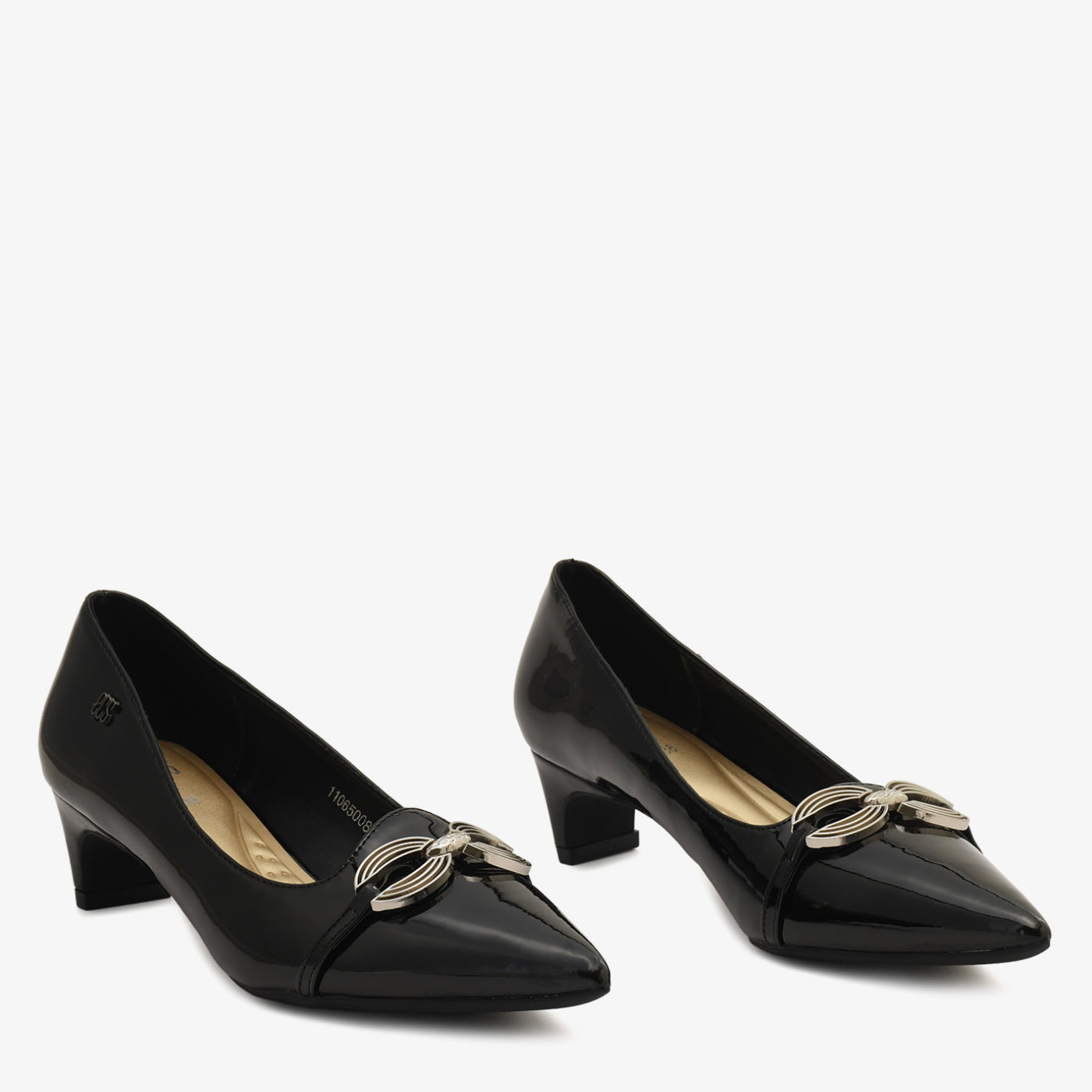A glossy coat shoe detailed with a sleek metallic ornament, giving it a minimal yet luxe appearance. Its pointed design ensures a refined, elongated look.