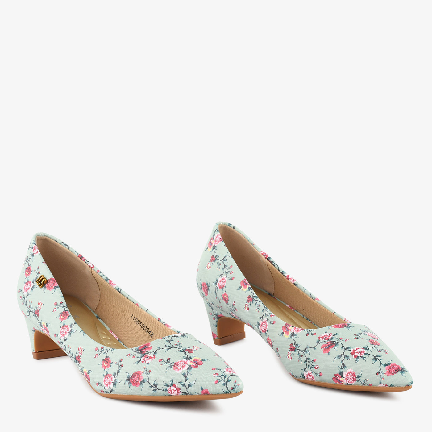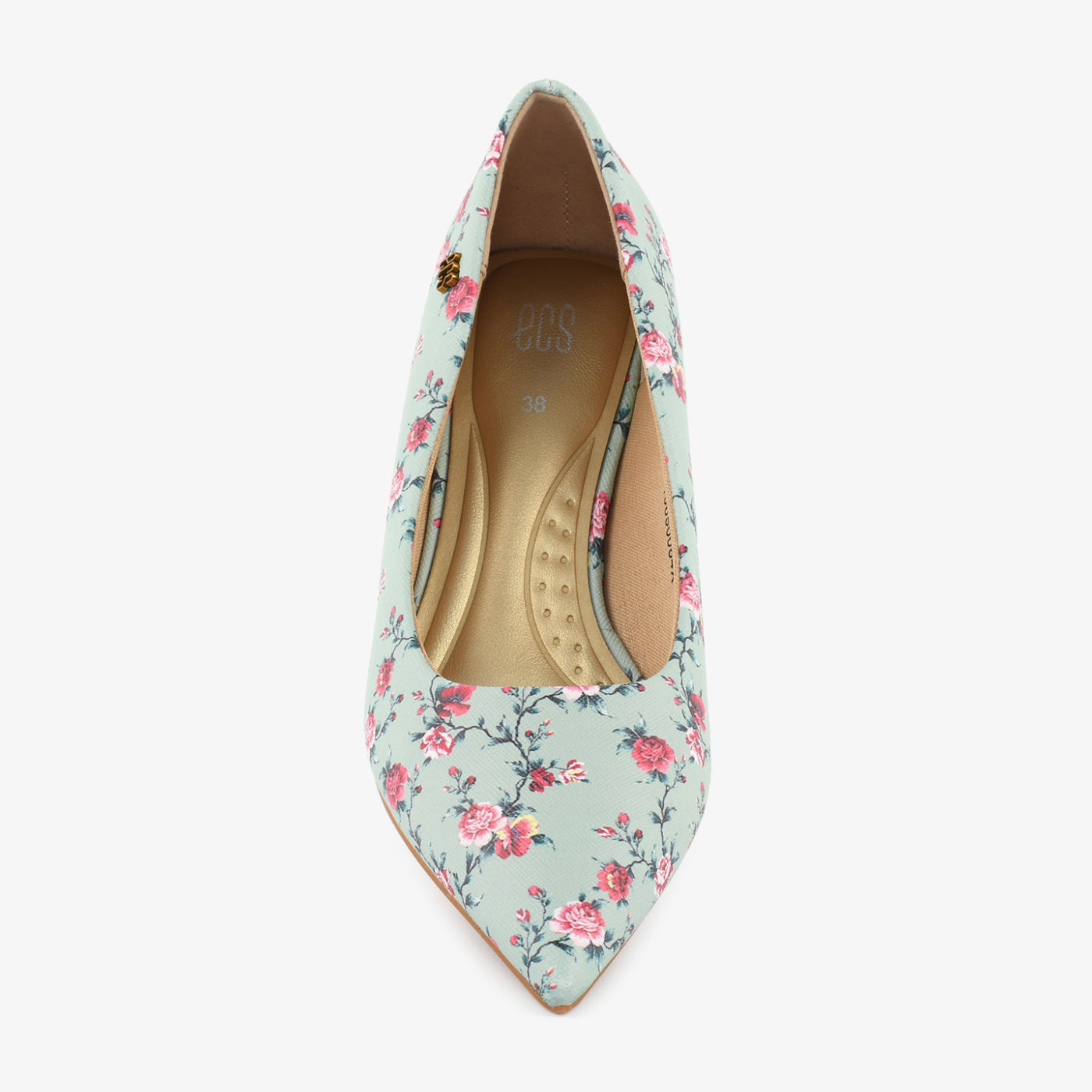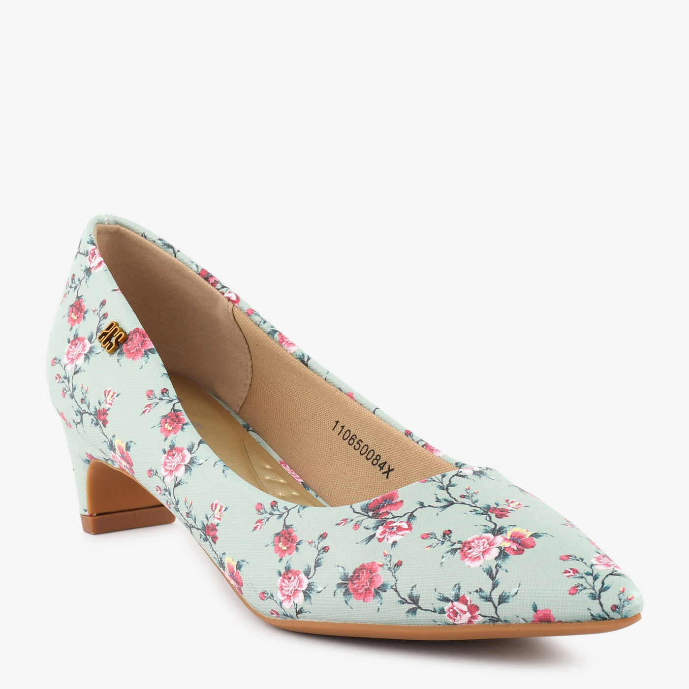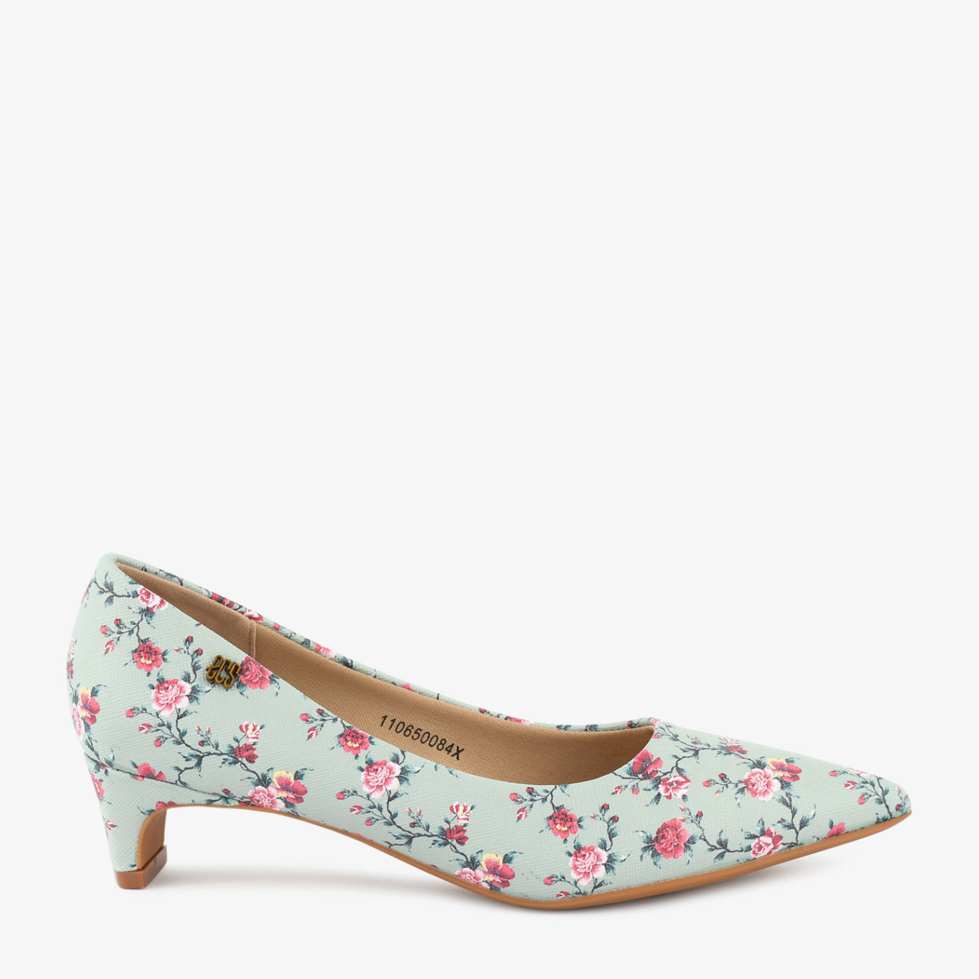 This floral coat shoe features a pastel mint base with delicate pink blooms, bringing a soft and feminine vibe. Its low block heel ensures both comfort and charm, perfect for day outings or semi-formal events.