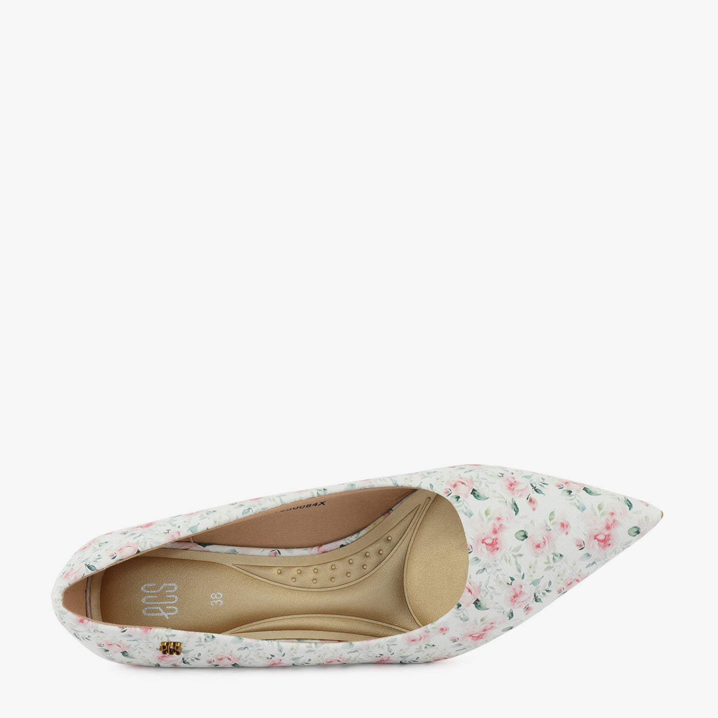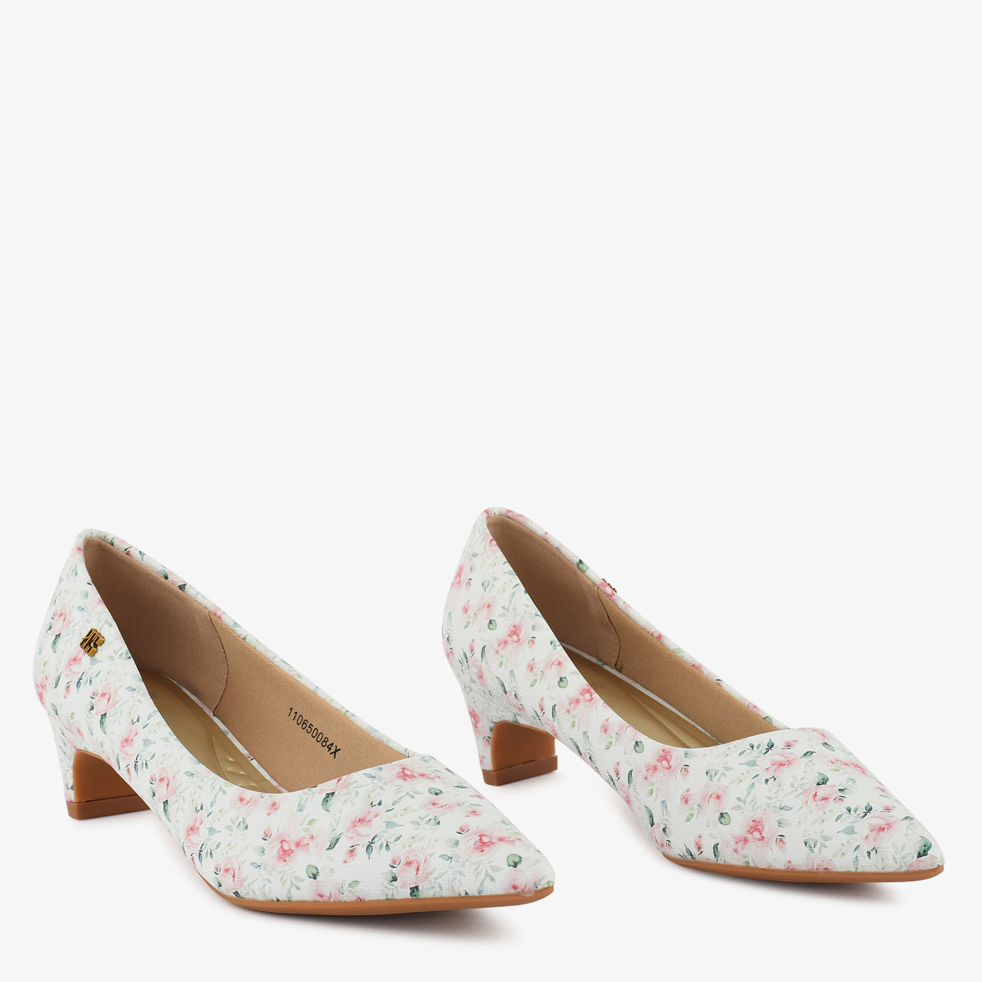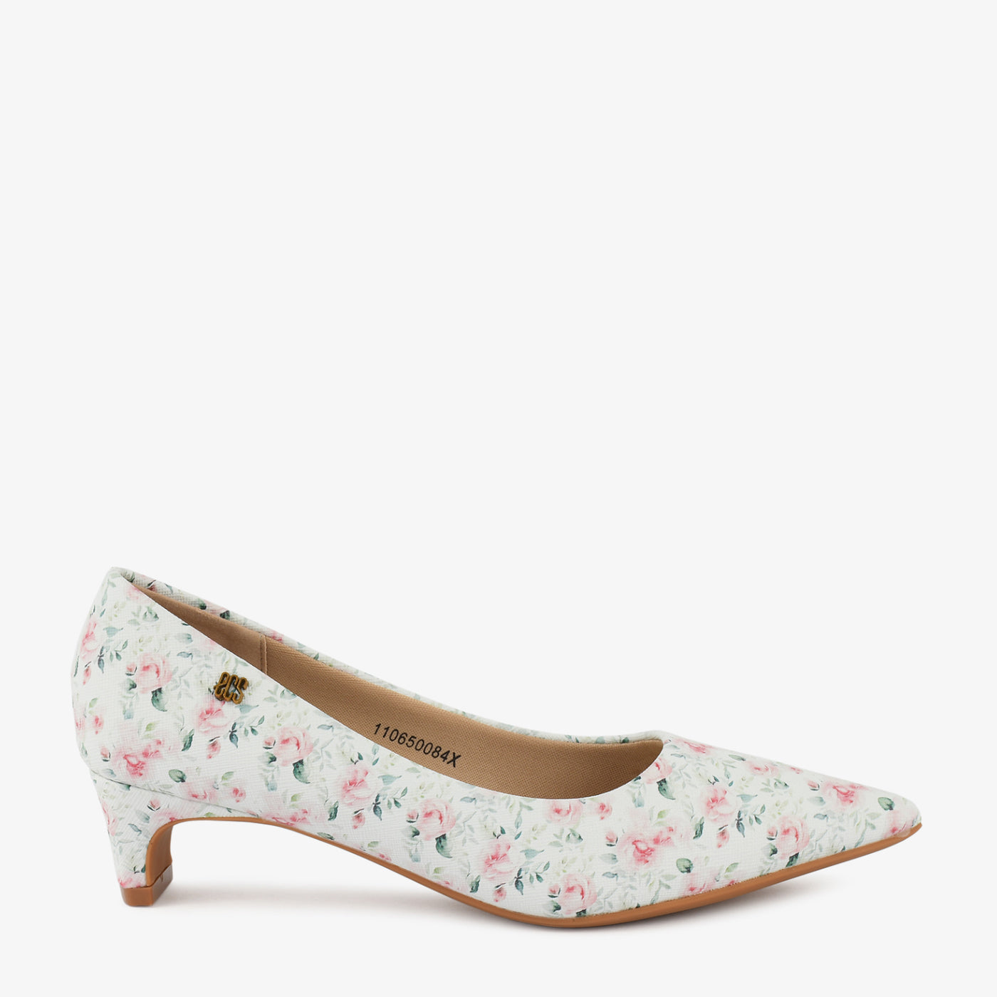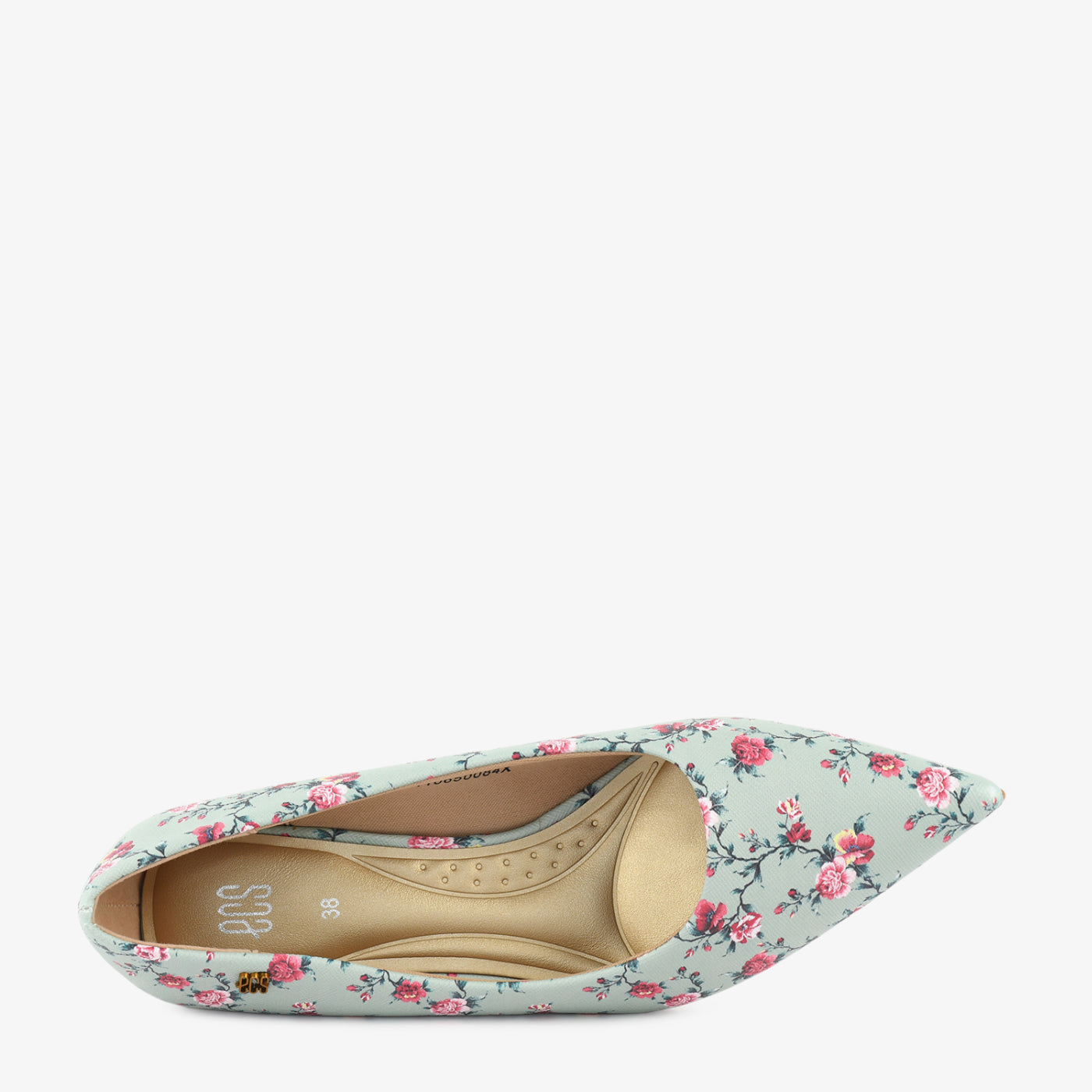 This floral coat shoe features a pastel mint base with delicate pink blooms, bringing a soft and feminine vibe. Its low block heel ensures both comfort and charm, perfect for day outings or semi-formal events.