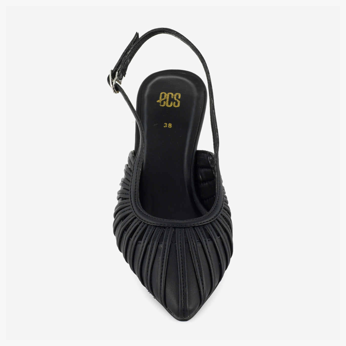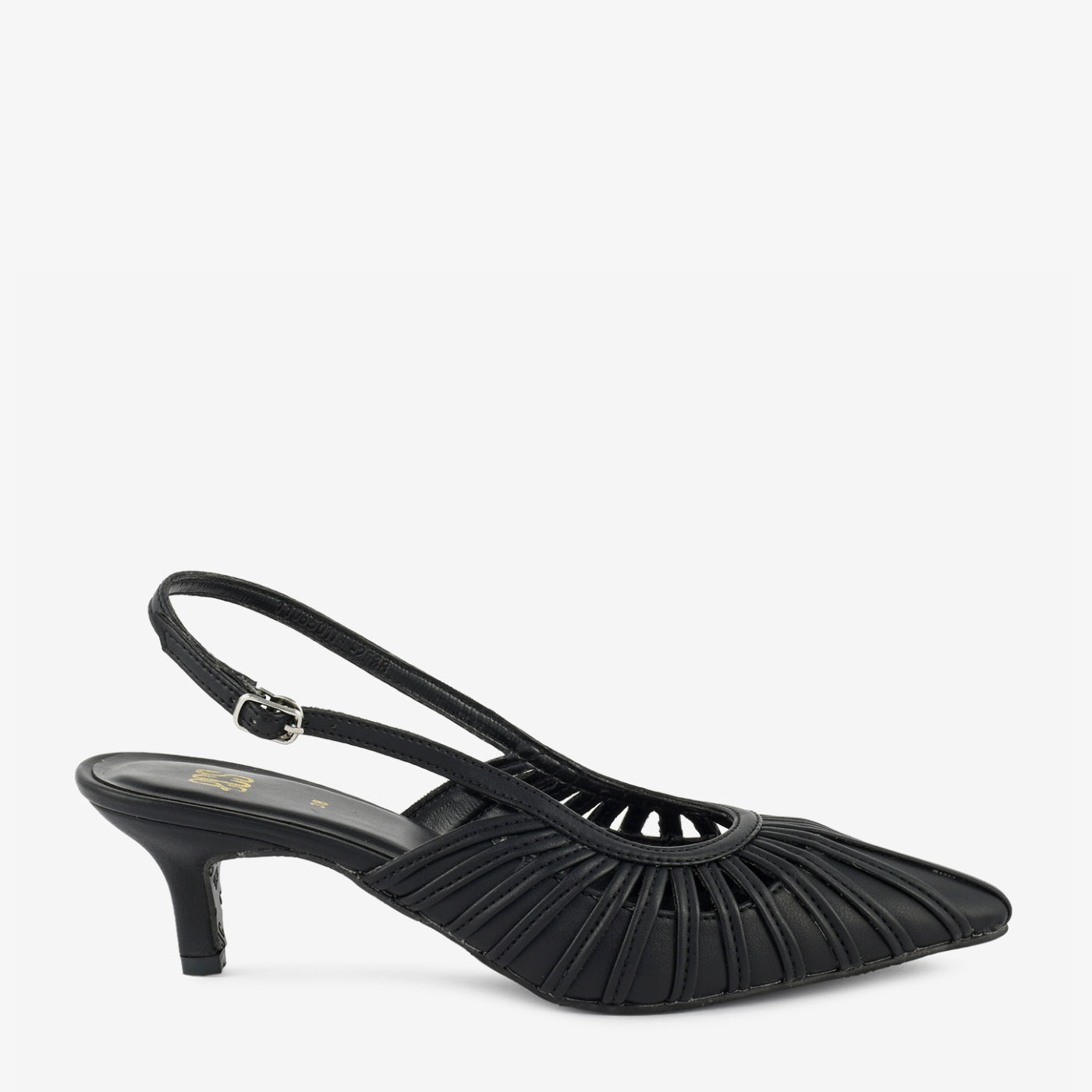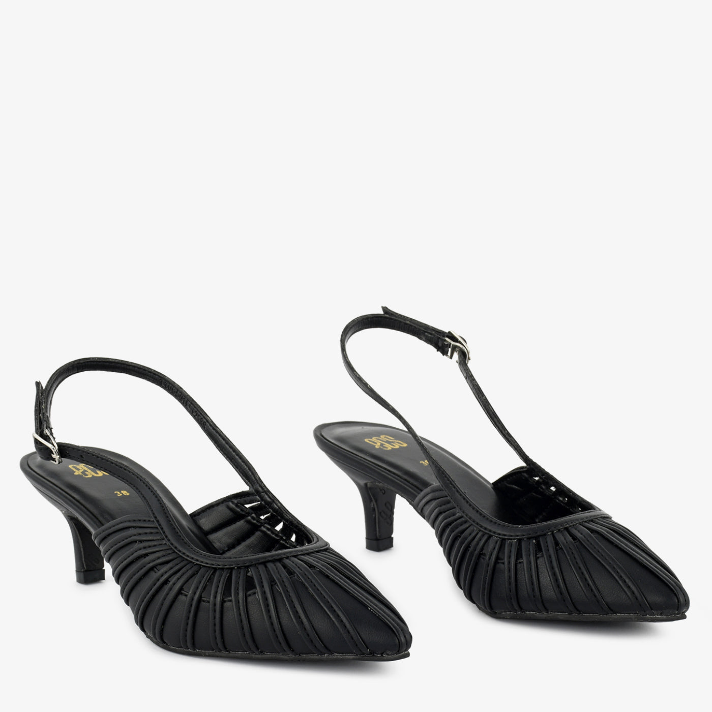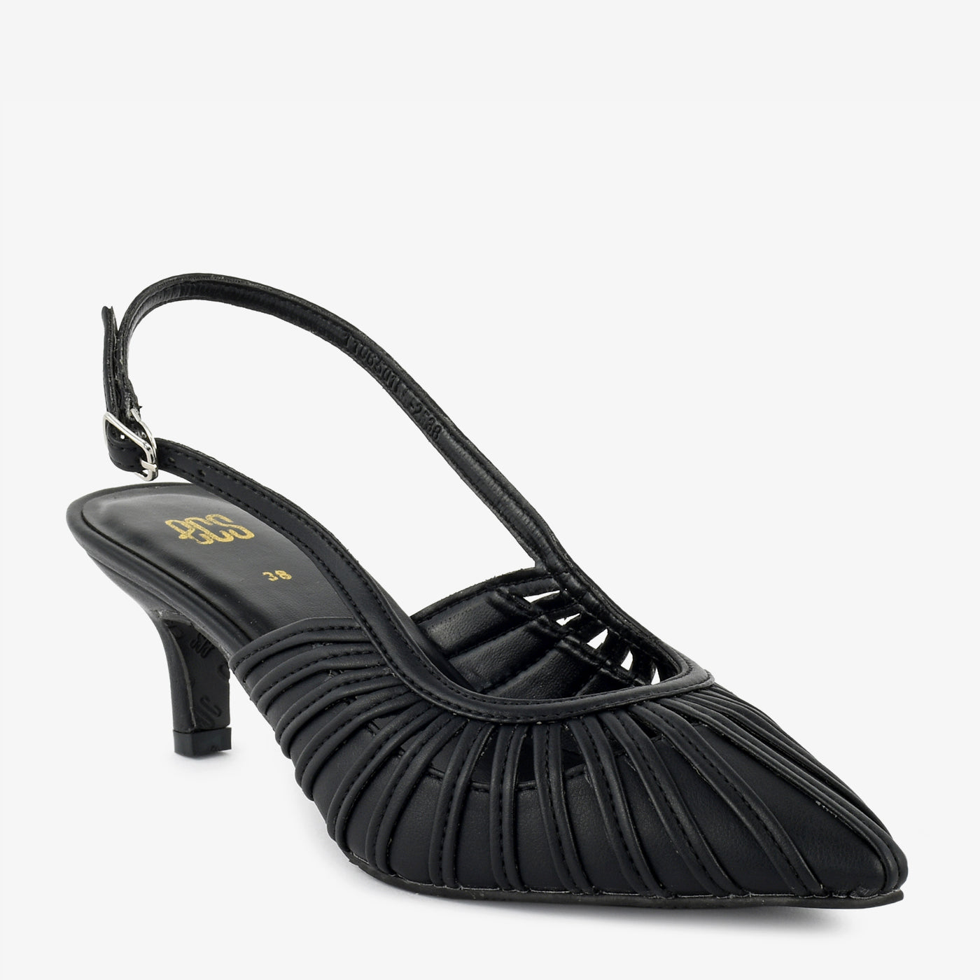 An elegant slingback heel crafted with intricate stitched panels that create a refined pleated texture. The pointed toe and delicate strap add poise, while the mid-heel ensures lasting comfort. Perfect for formal events or everyday sophistication.