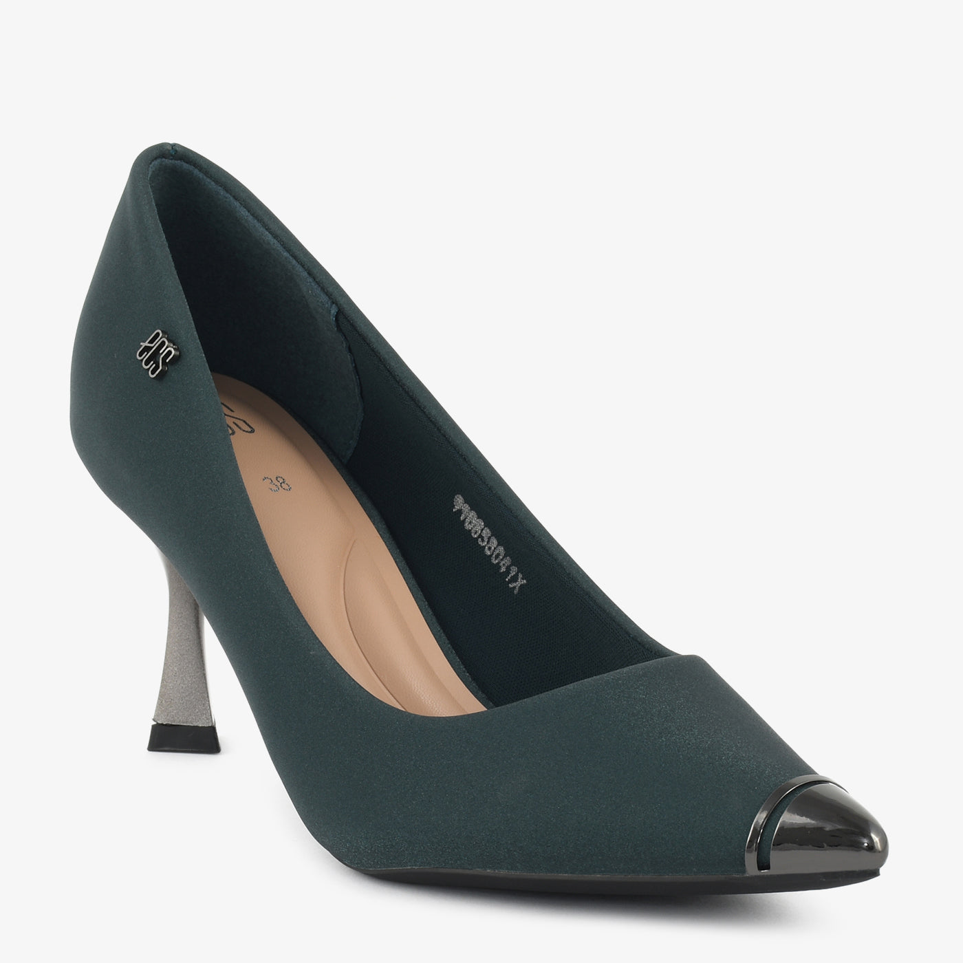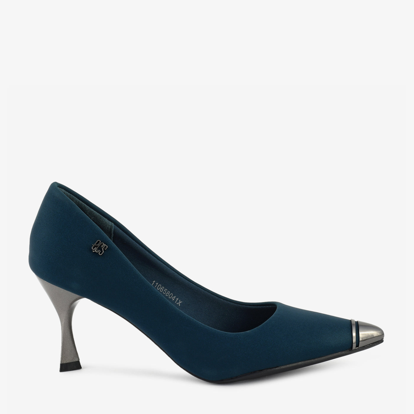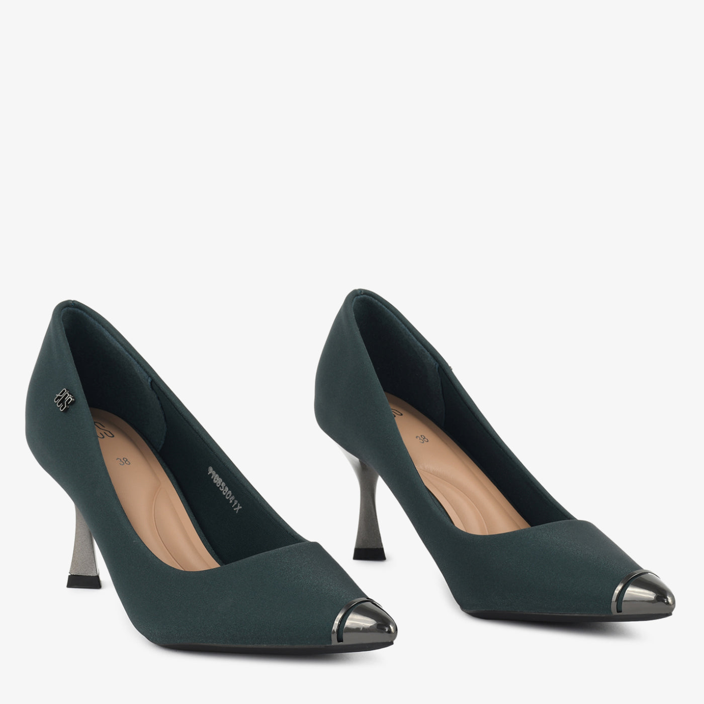 - Design: Pointed-toe pump with a sculpted heel and metal toe cap