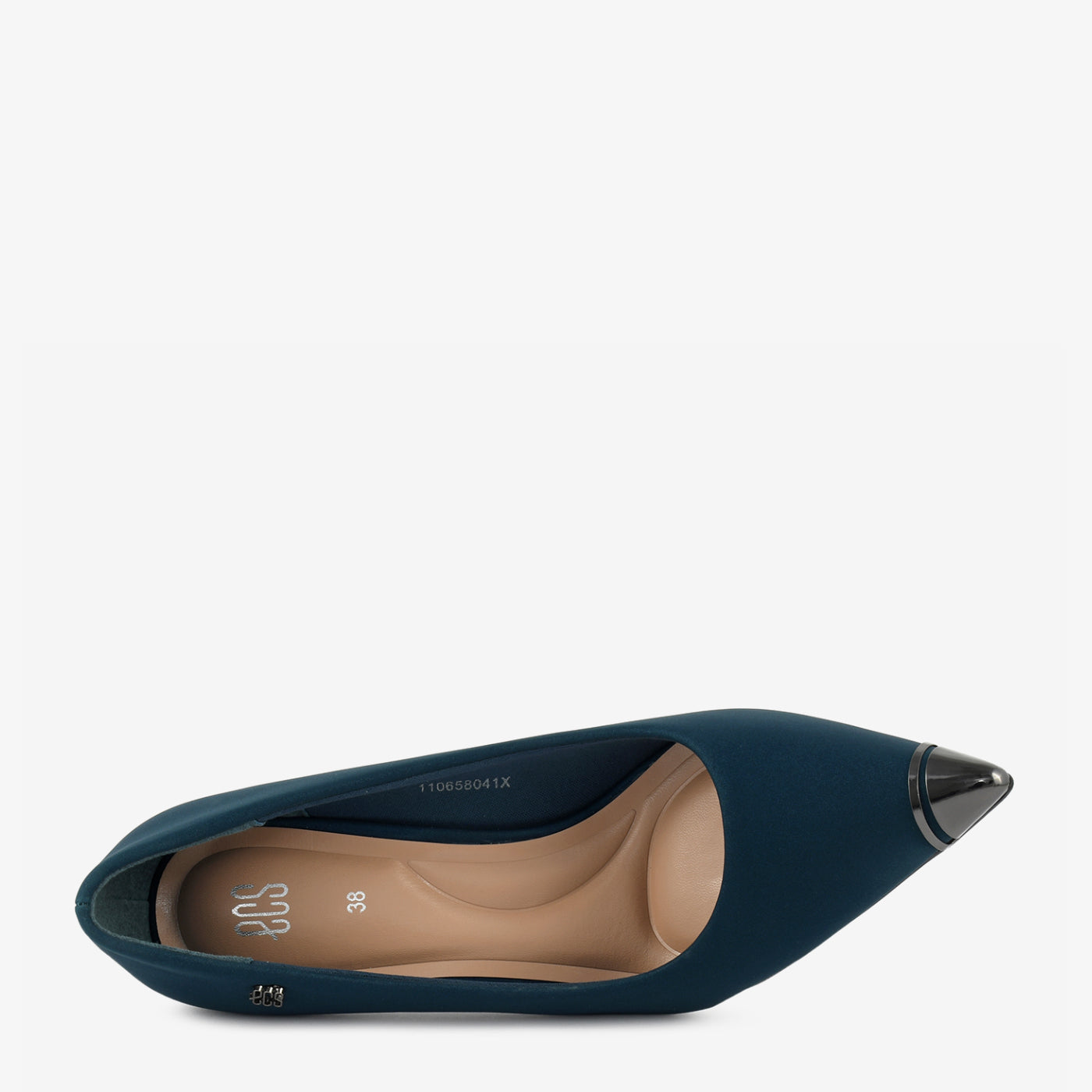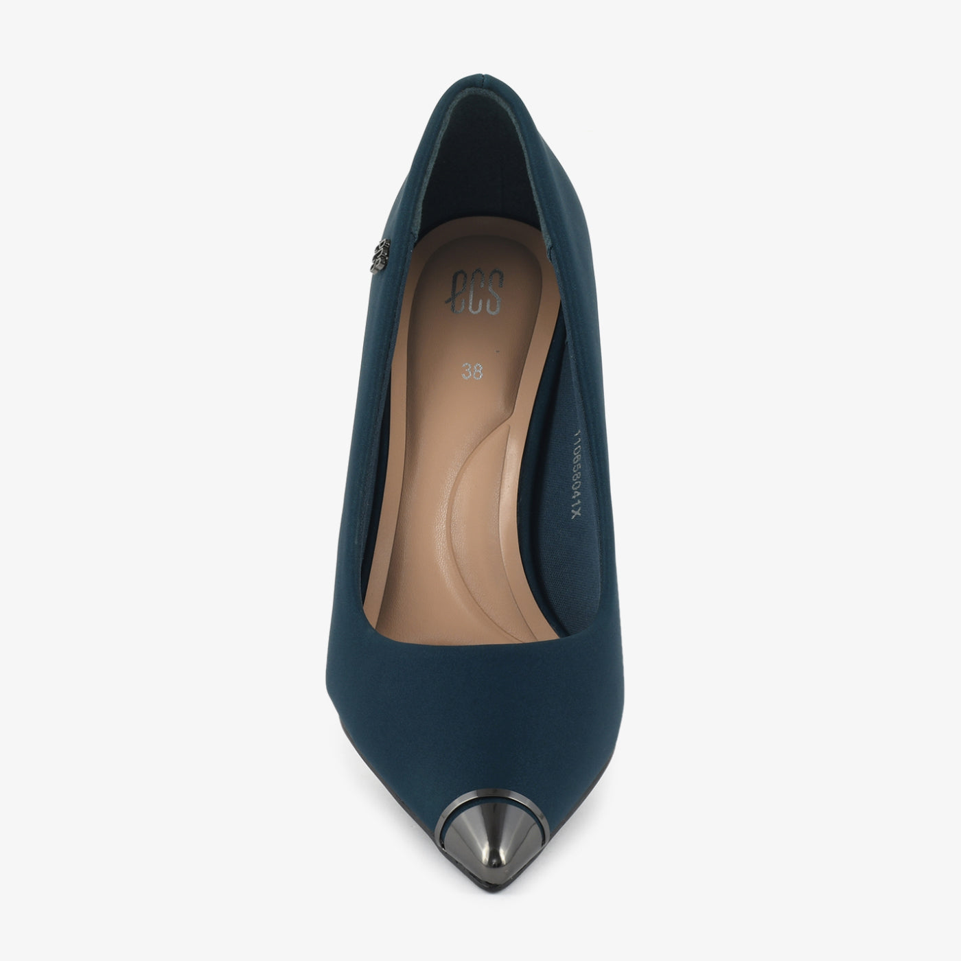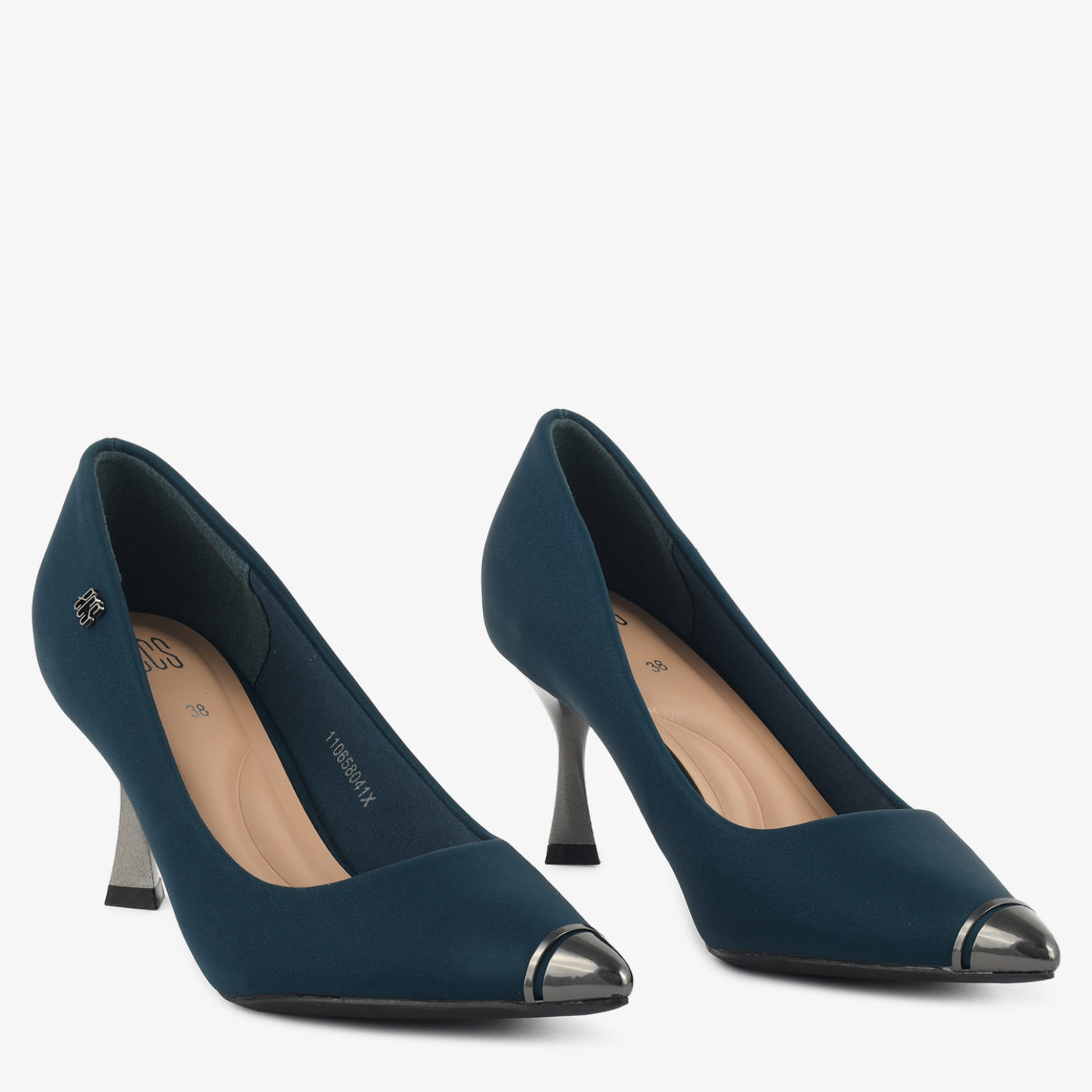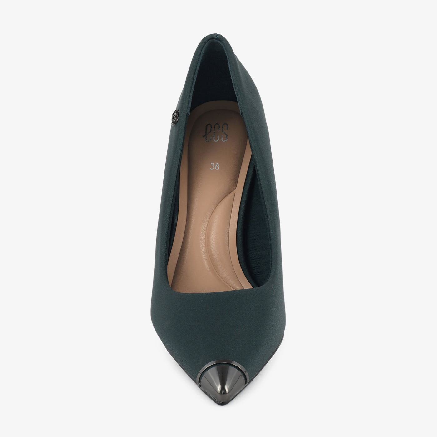 - Design: Pointed-toe pump with a sculpted heel and metal toe cap