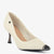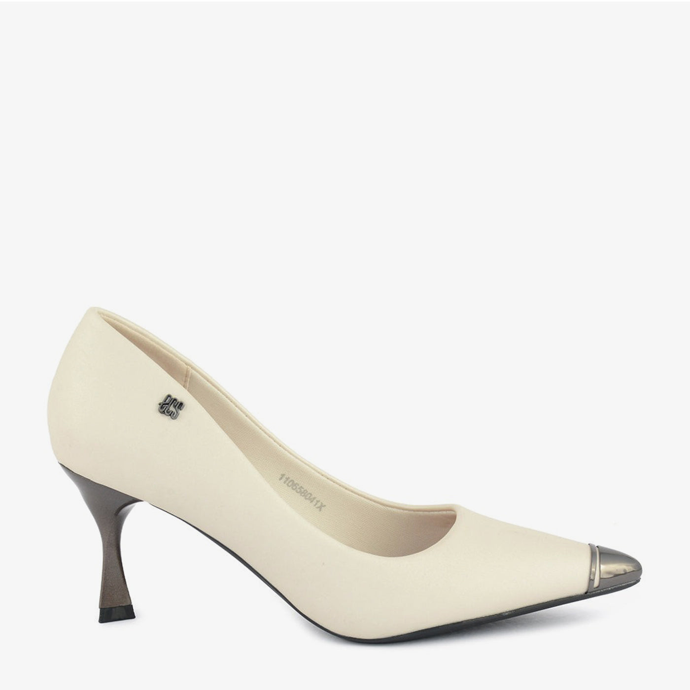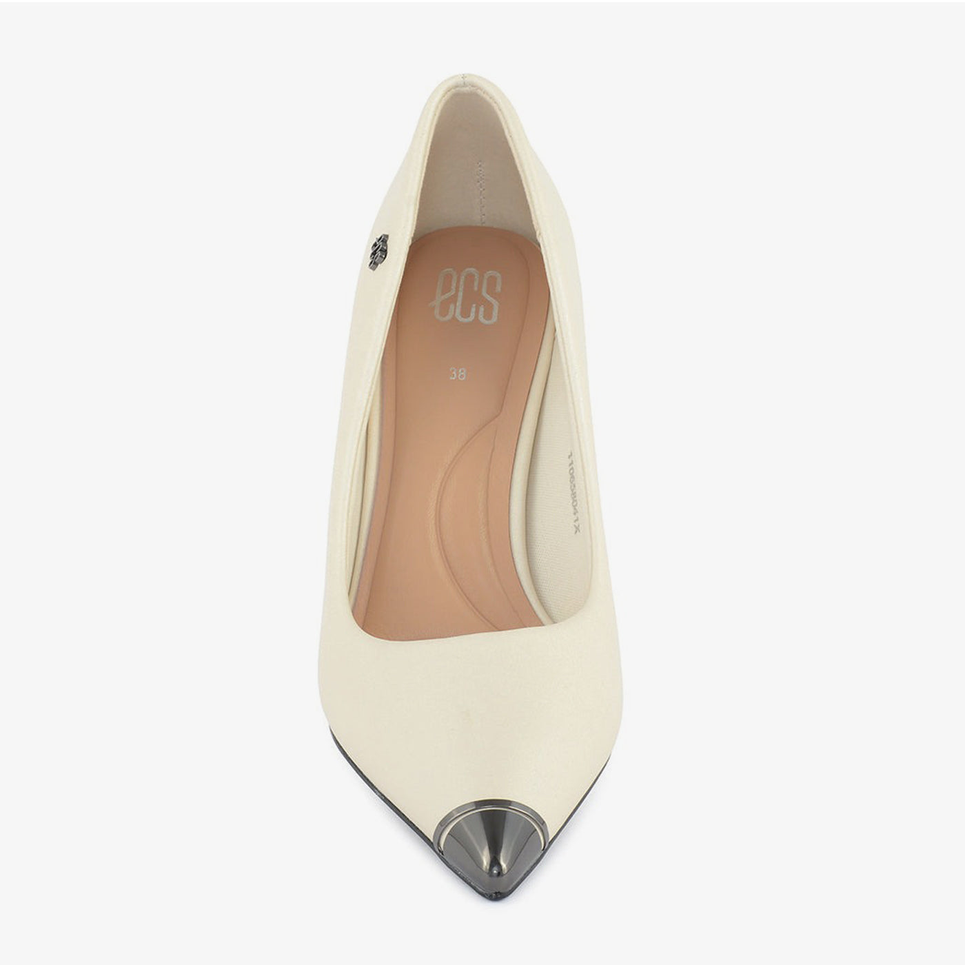 An elegant ivory pump featuring a sleek, pointed toe with a metallic silver cap. It has a slender, sculpted heel in a contrasting dark shade, offering a sophisticated and modern silhouette.