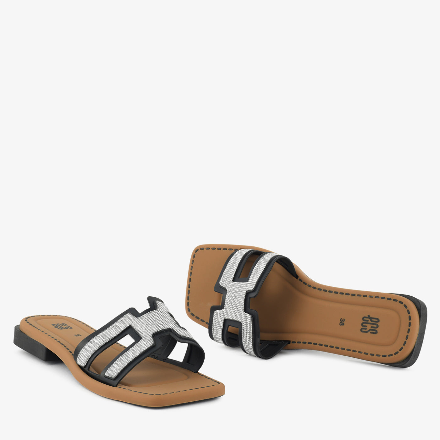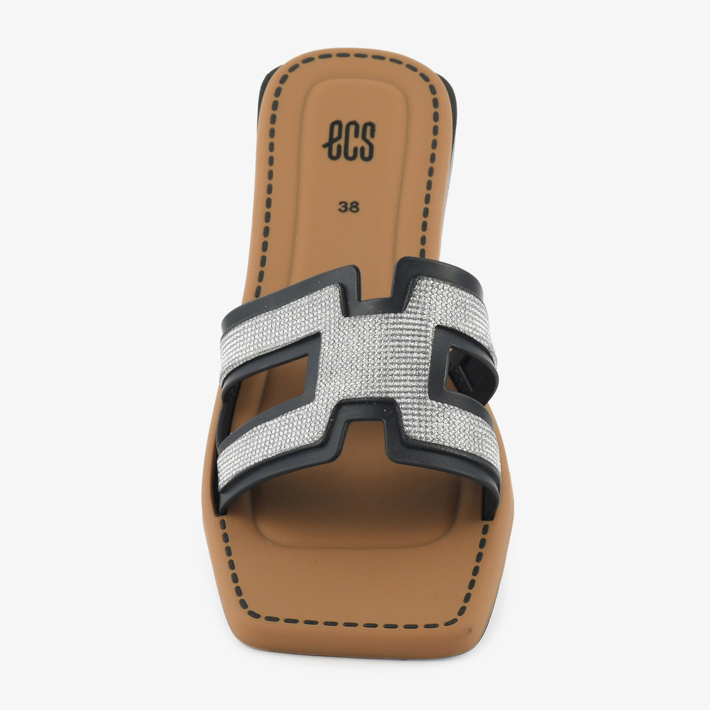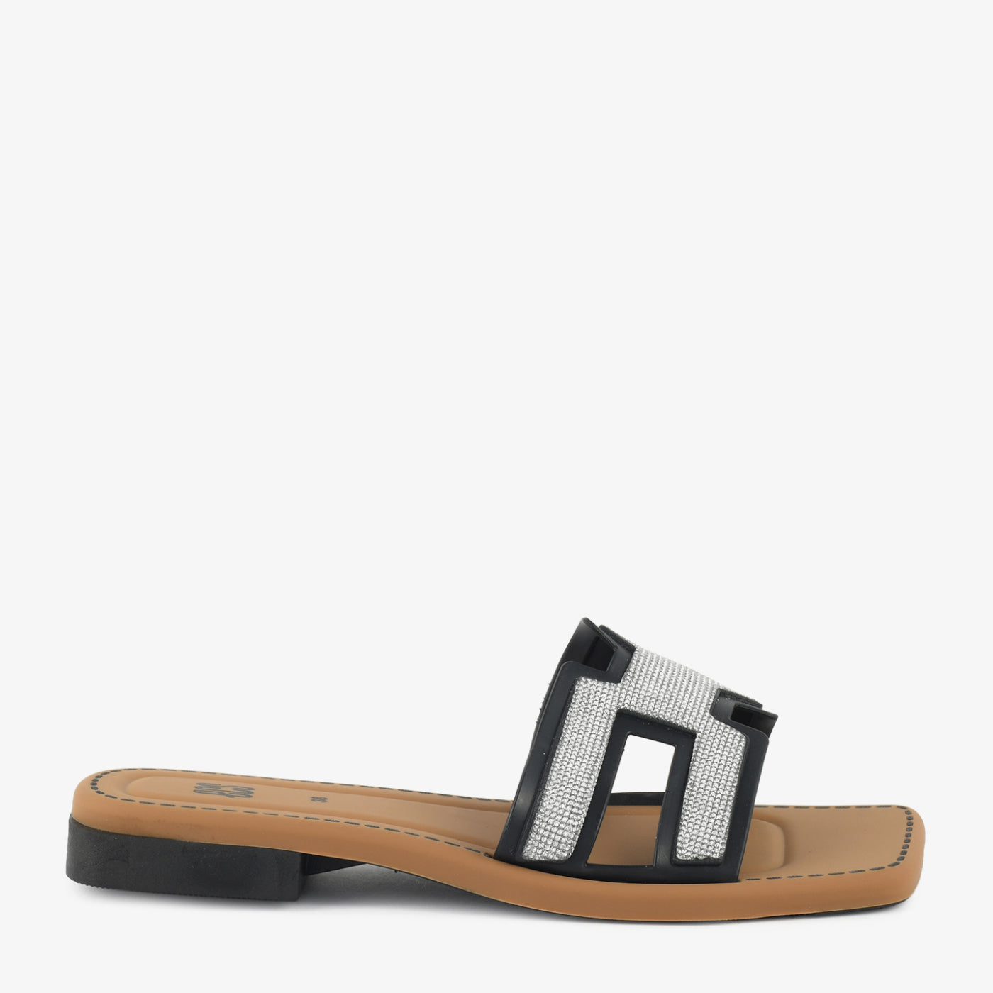 This stylish slipper is crafted to offer everyday comfort with a touch of refined detailing. The structured front strap features a geometric cut design accented with subtle shimmer, creating a modern and polished look. The cushioned footbed provides gentle support for relaxed movement, while the low, stable base ensures ease and balance throughout the day. Designed for convenient slip-on wear, this slipper is perfect for those who value both comfort and understated elegance.
