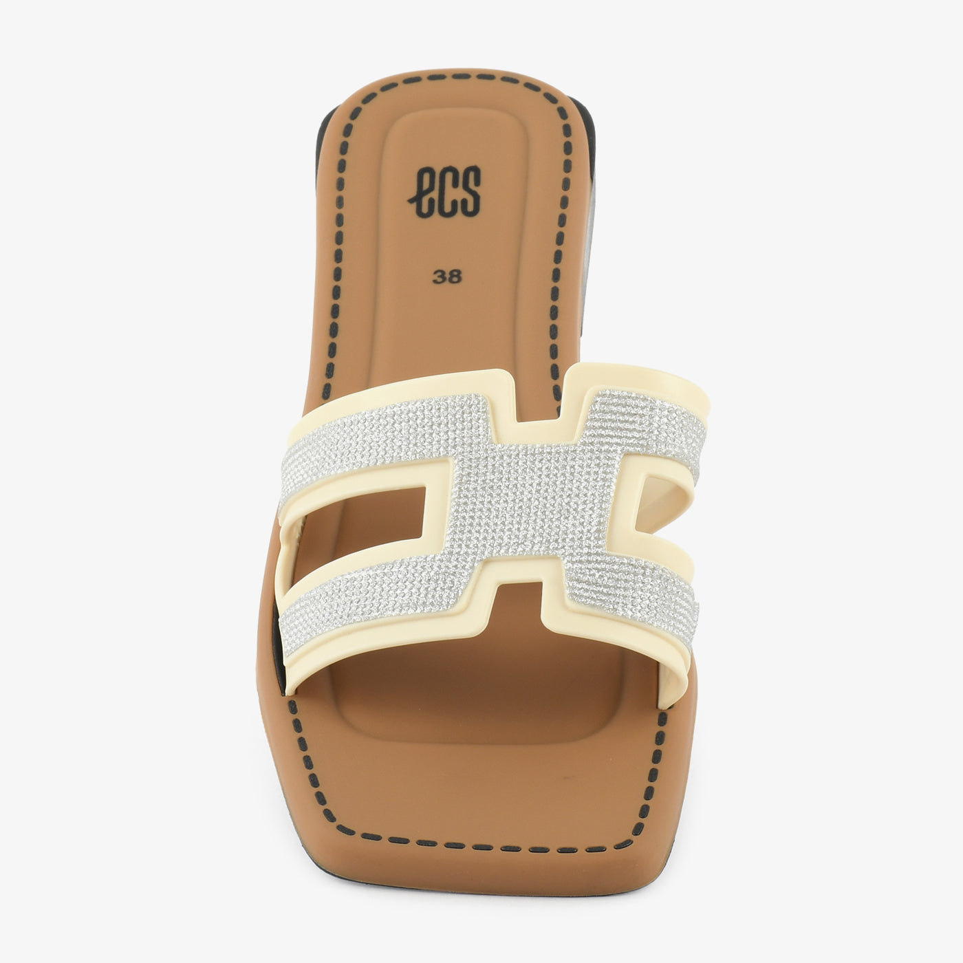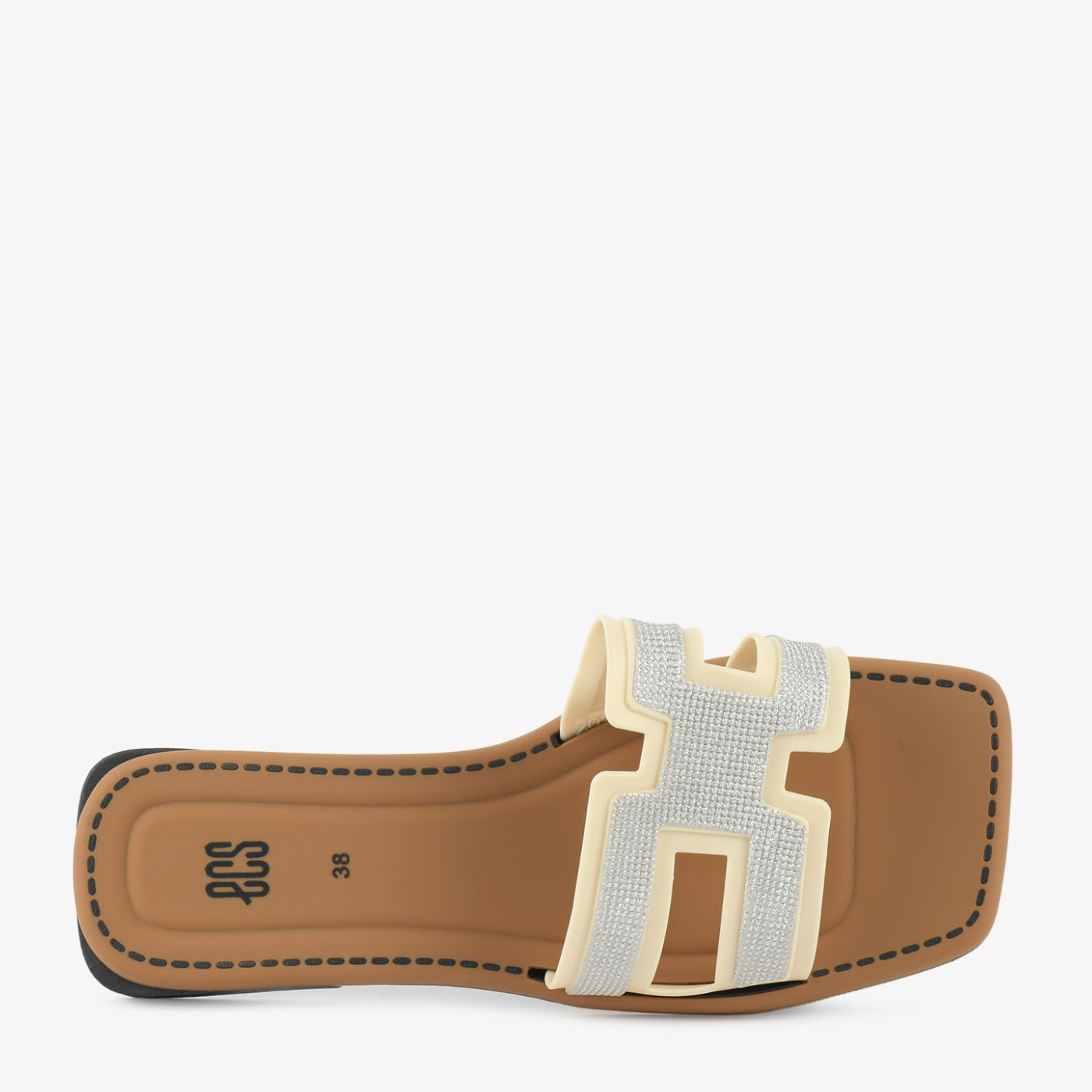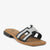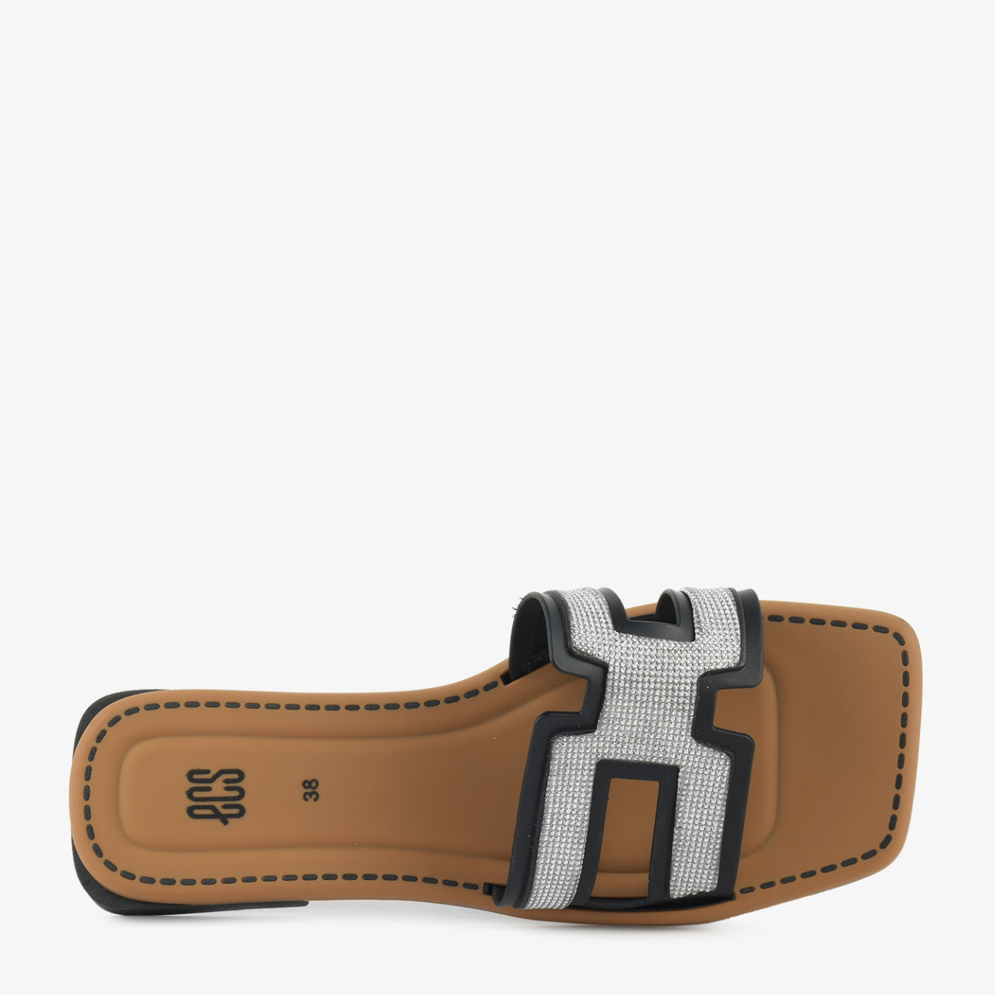 This stylish slipper is crafted to offer everyday comfort with a touch of refined detailing. The structured front strap features a geometric cut design accented with subtle shimmer, creating a modern and polished look. The cushioned footbed provides gentle support for relaxed movement, while the low, stable base ensures ease and balance throughout the day. Designed for convenient slip-on wear, this slipper is perfect for those who value both comfort and understated elegance.