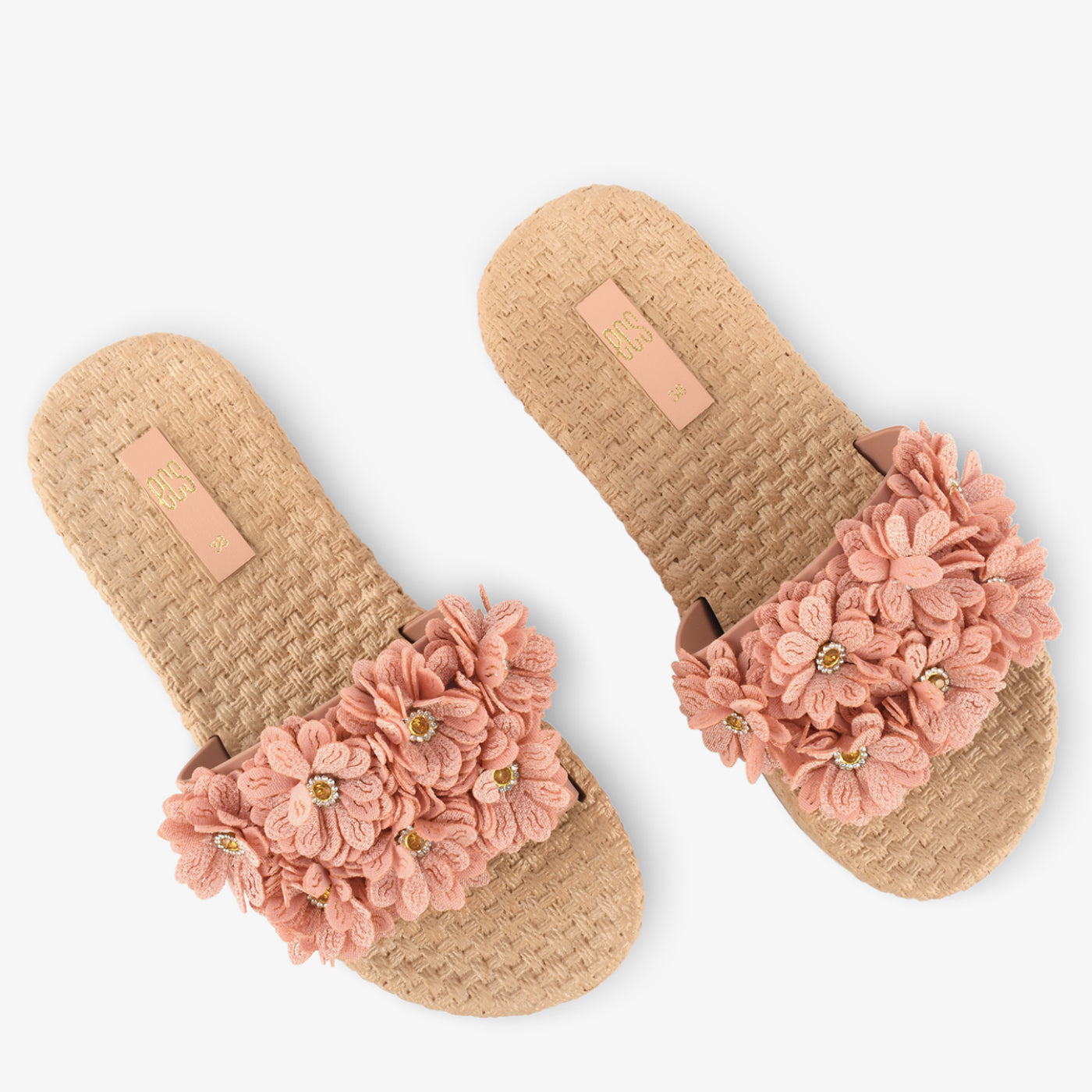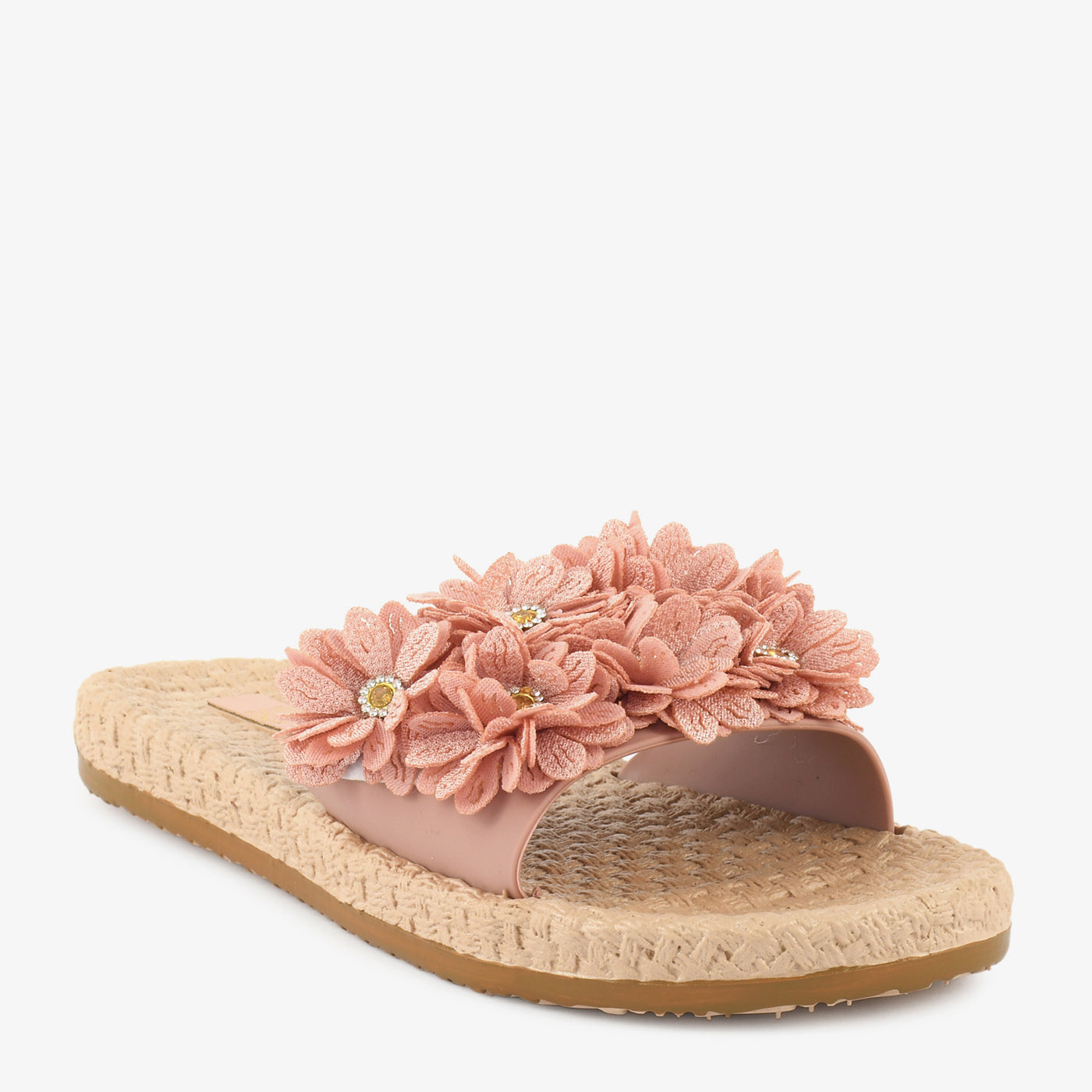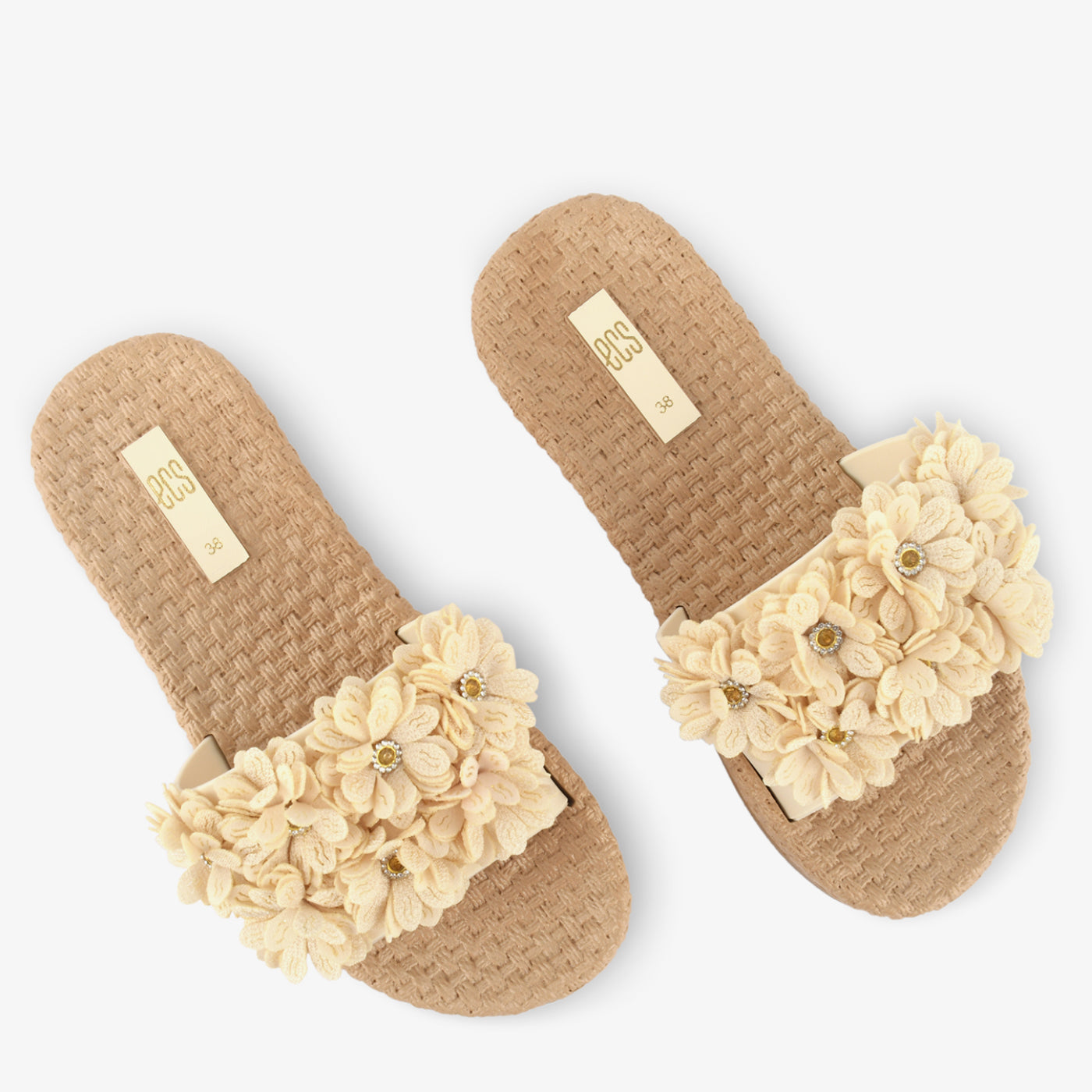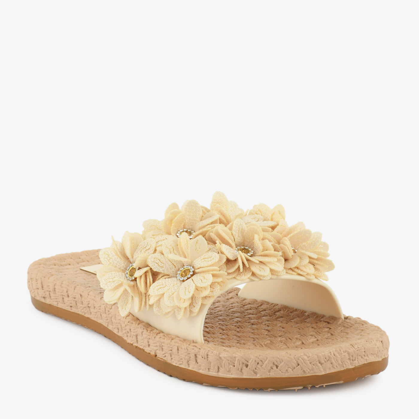 This elegant slipper is designed with a soft contoured footbed that offers everyday comfort while maintaining a refined look. The upper features layered floral detailing that adds a delicate, handcrafted charm to the overall design. Its slip-on structure ensures easy wear, making it perfect for relaxed outings or casual gatherings. Lightweight construction allows comfortable movement throughout the day without strain. The balanced silhouette blends simplicity with decorative appeal, creating a versatile footwear choice. Ideal for those who appreciate subtle style with functional comfort.