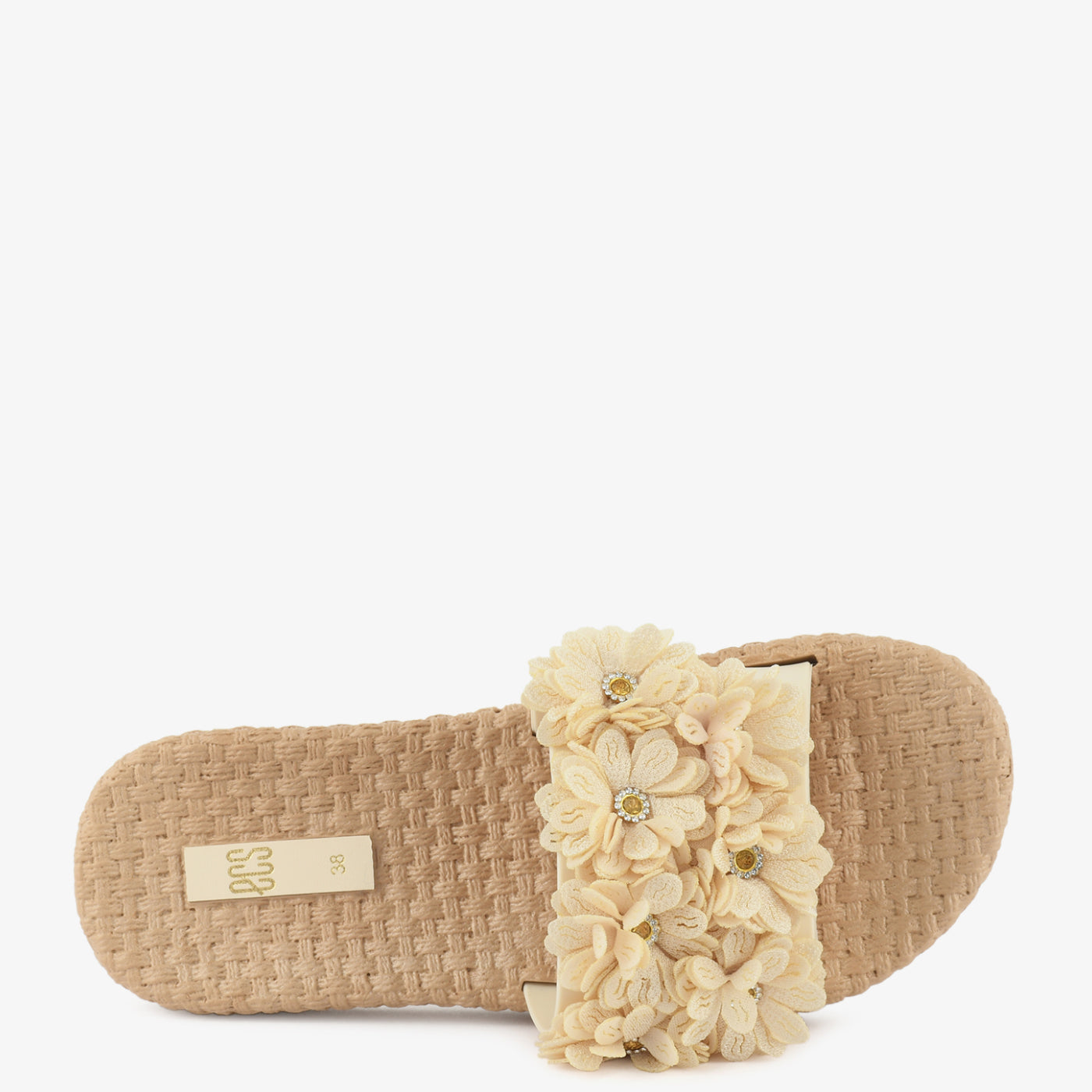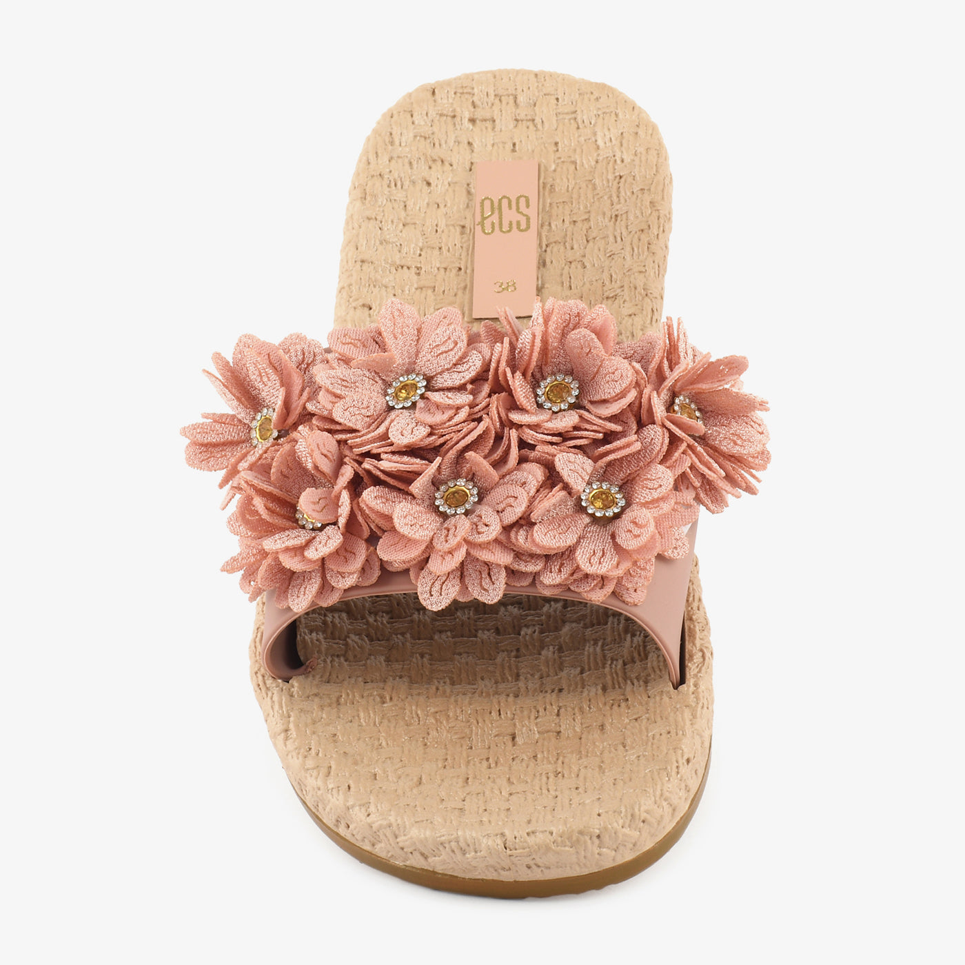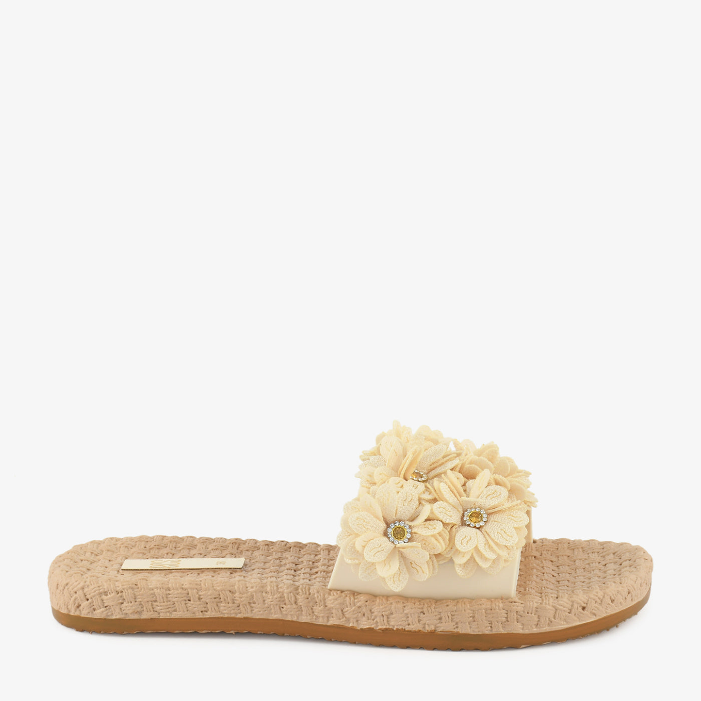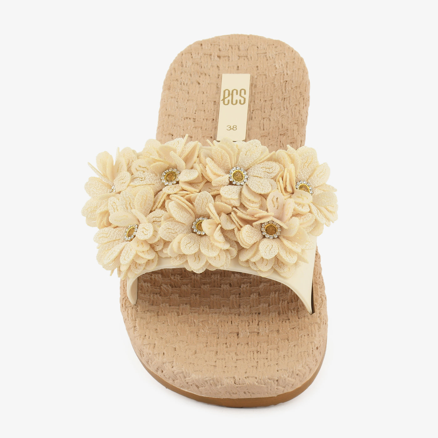 This elegant slipper is designed with a soft contoured footbed that offers everyday comfort while maintaining a refined look. The upper features layered floral detailing that adds a delicate, handcrafted charm to the overall design. Its slip-on structure ensures easy wear, making it perfect for relaxed outings or casual gatherings. Lightweight construction allows comfortable movement throughout the day without strain. The balanced silhouette blends simplicity with decorative appeal, creating a versatile footwear choice. Ideal for those who appreciate subtle style with functional comfort.