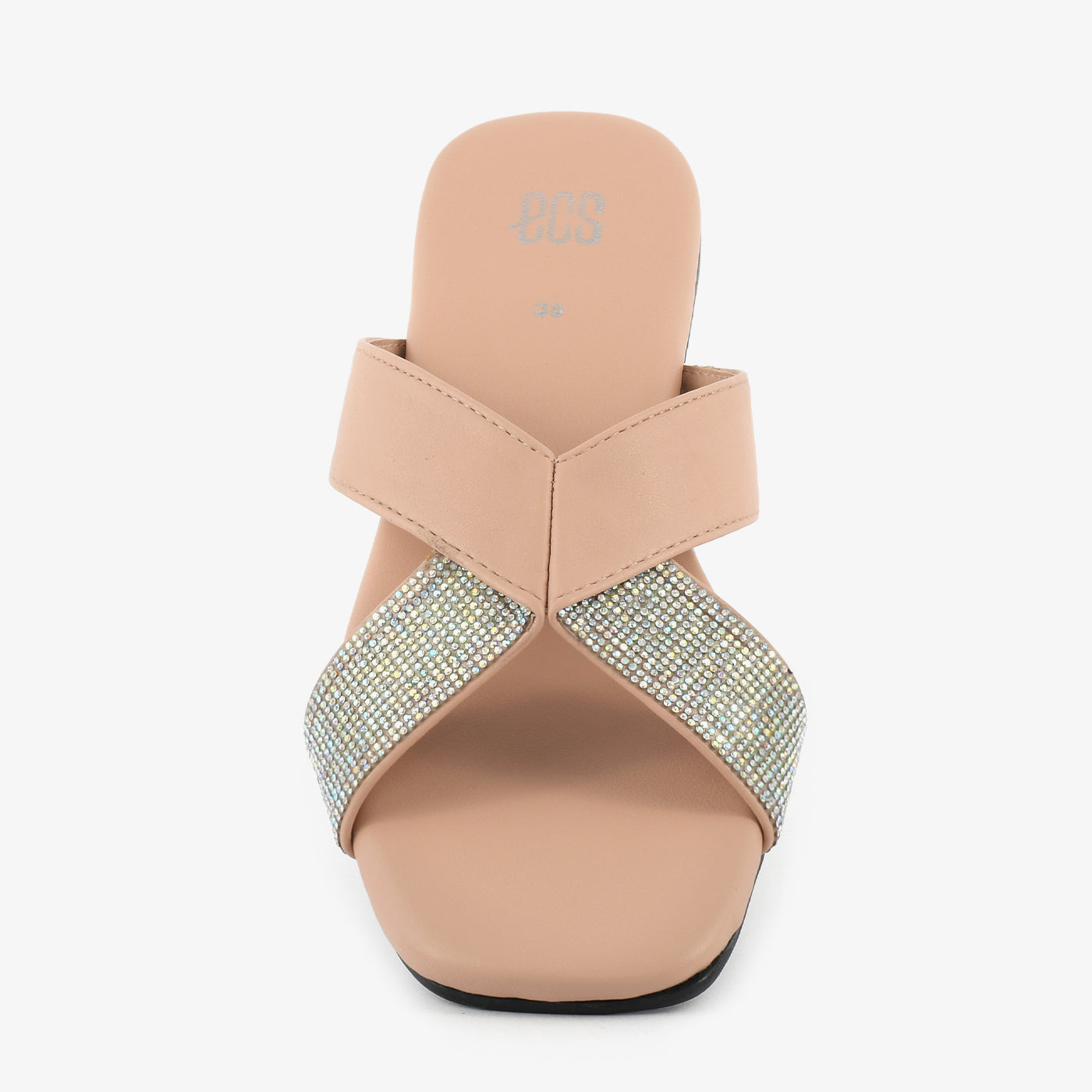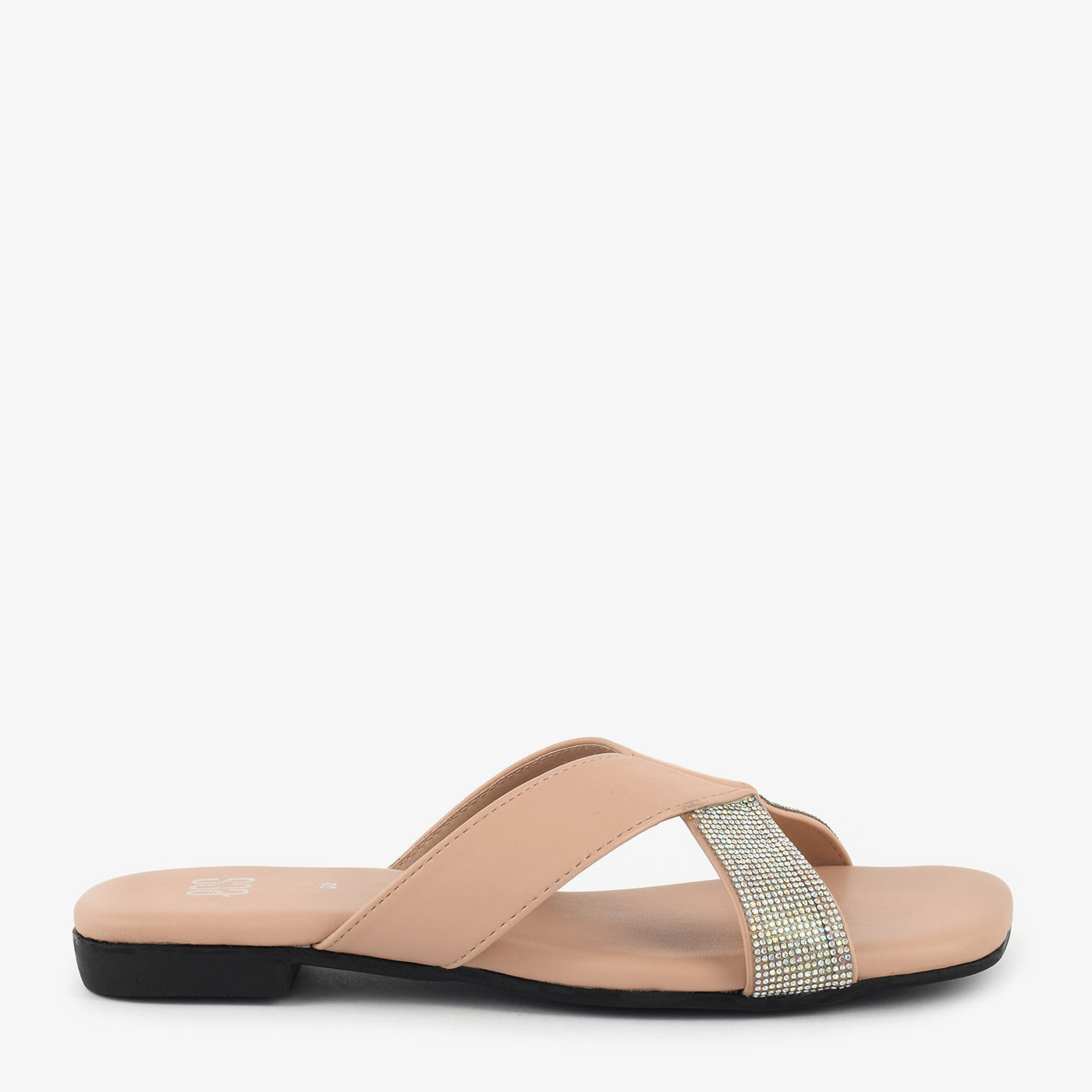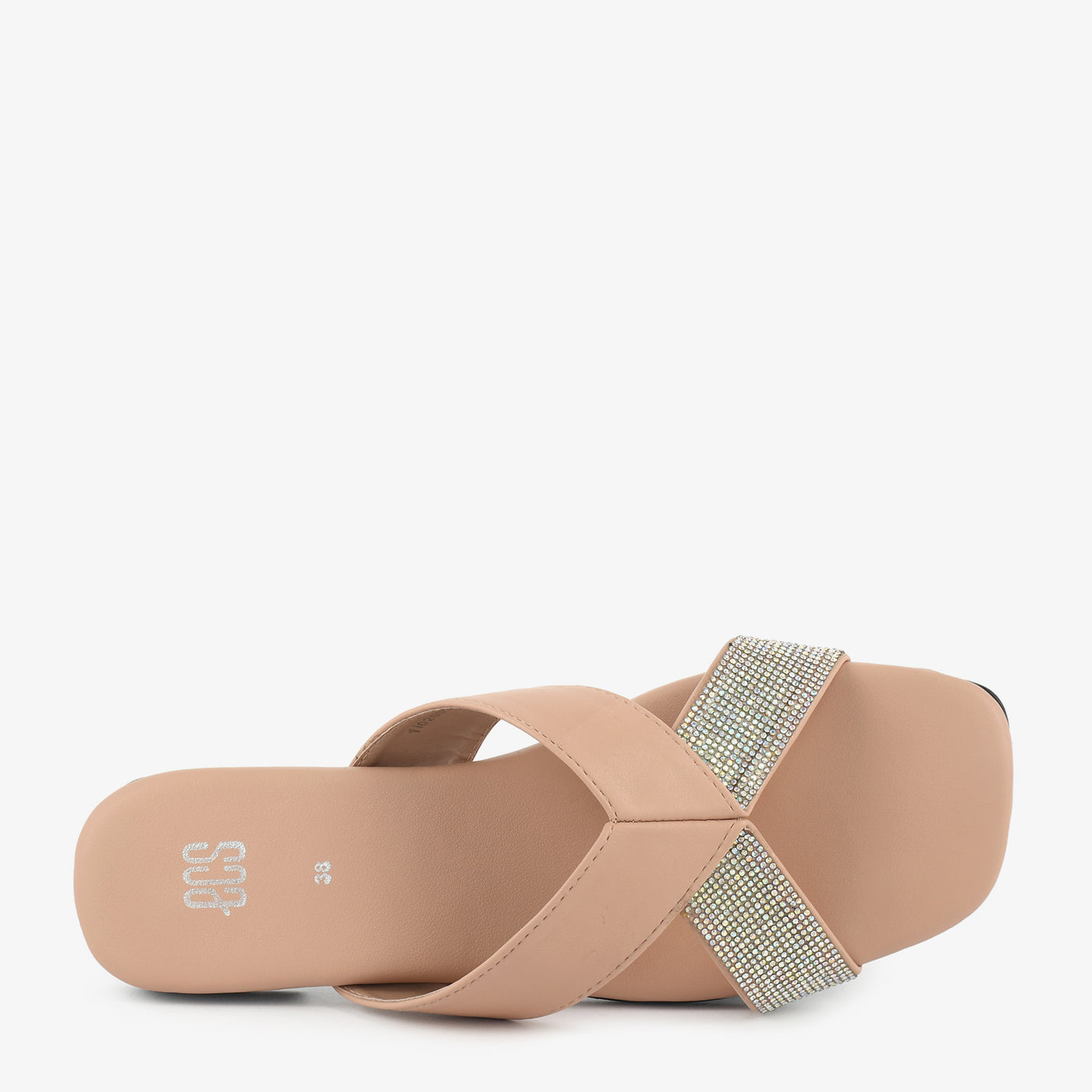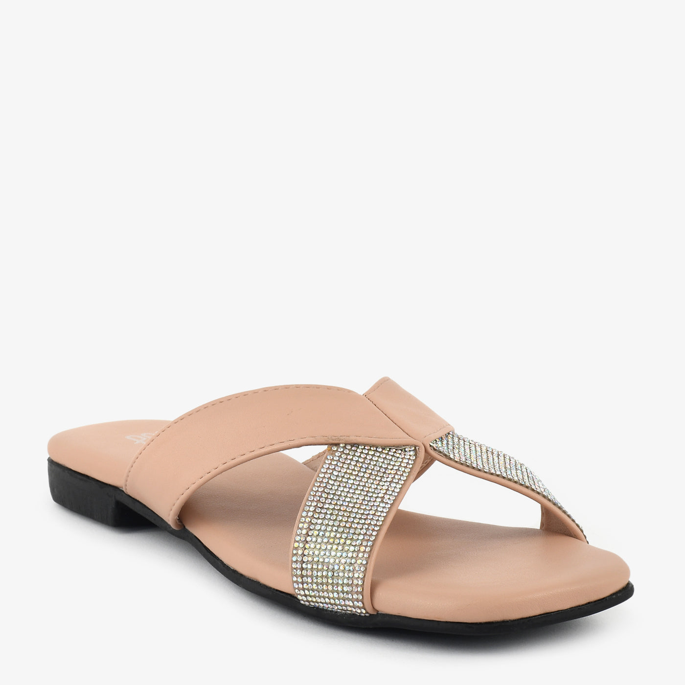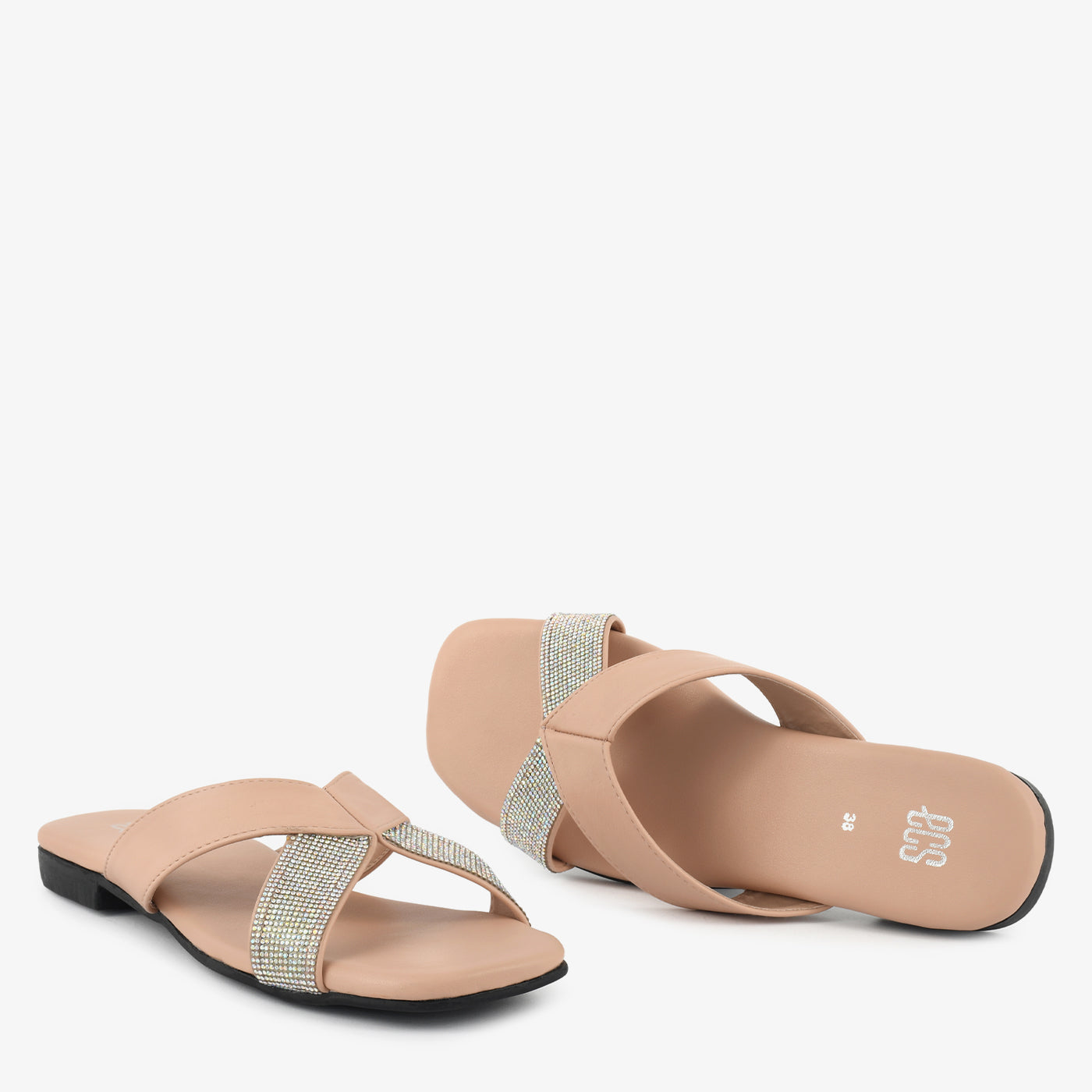 - Design: Cross-strap slipper with stone-studded detailing