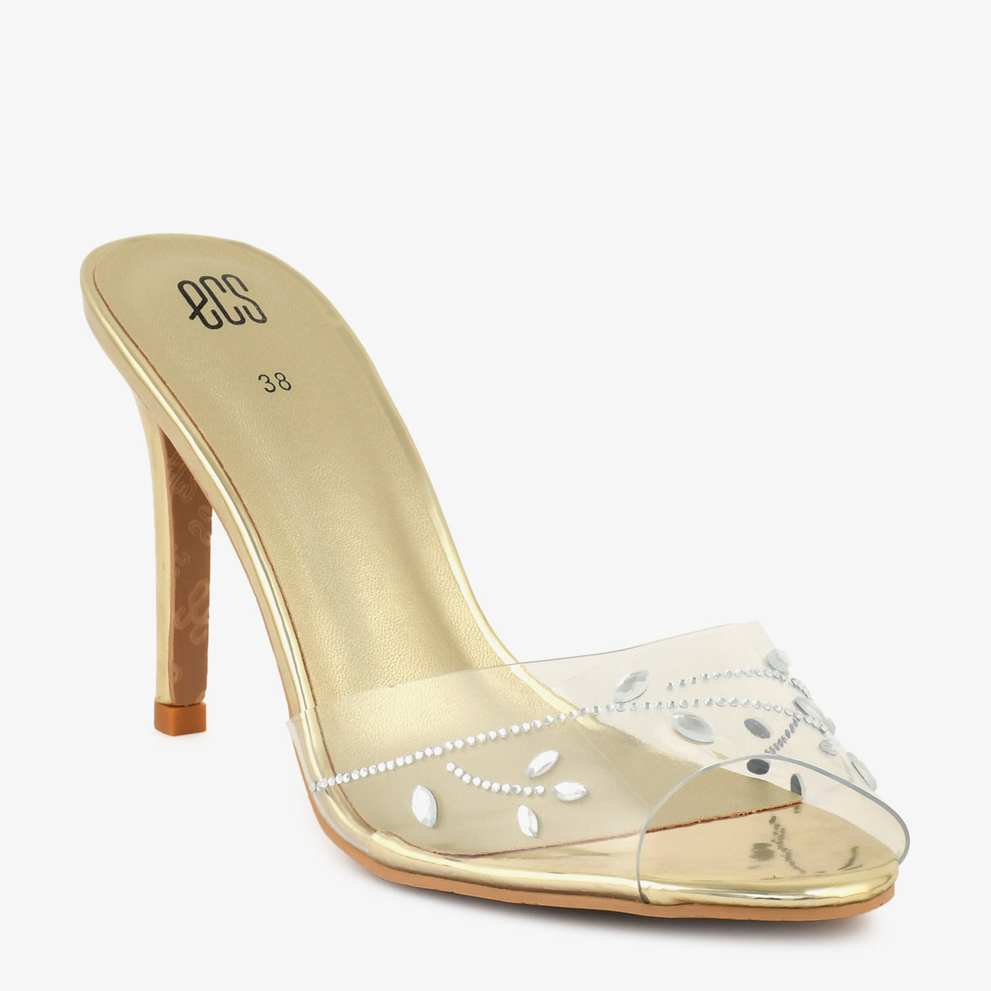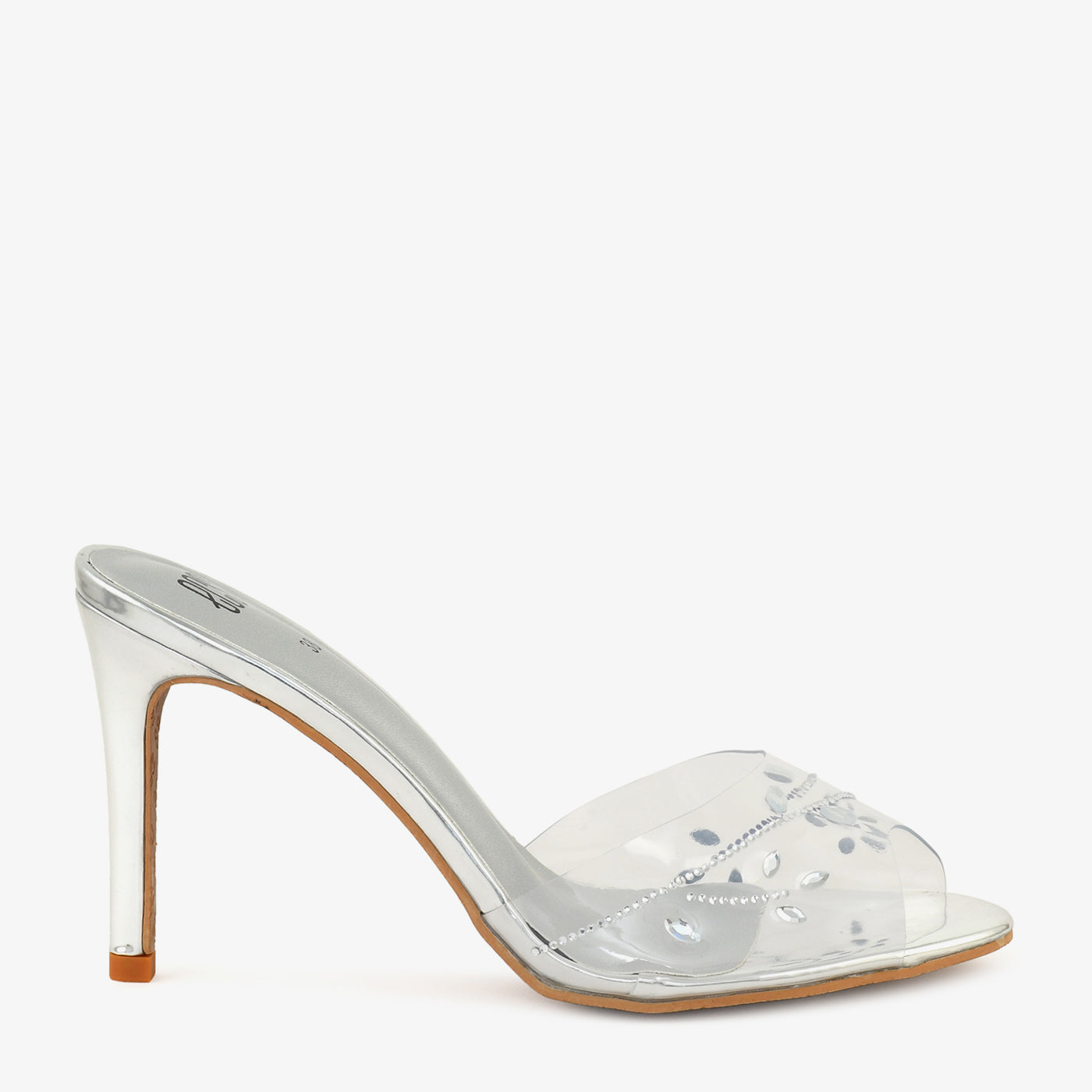 - Design: Open-toe slip-on heel with crystal detailed transparent strap